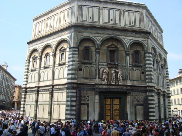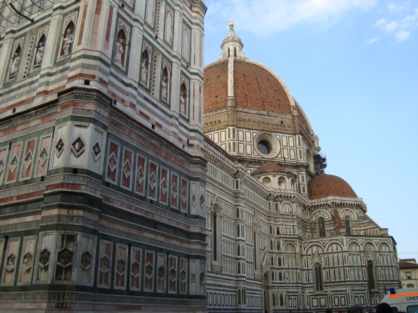 Într-o zi plină am vizitat mai toate locurile interesante din oraș. Primul a fost marele dom unde am urcat pe acoperiș după o așteptare de vreo jumătate de oră la coadă la bilete (asta nu e rău deloc, pentru că se poate sta și cu orele acolo). Din interior am putut admira fresca lui Vasari de pe cupolă, o pictură comparabilă poate doar cu Capela Sixtina din Vatican, pentru ca apoi să admirăm priveliștile peste Florența de pe acoperiș. Ansamblul bisericii este cel puțin la fel de frumos la exterior, fațadele celor 3 clădiri – Duomo, Baptisterio și Torre Giotto sunt de o frumusețe rară.