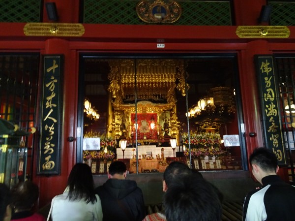 La două stații de metrou (la Asakusa) distanță se află templul Senso-Ji. Acesta este cel mai mare templu budist din Tokyo. La Asakusa se pot face plimbări cu ricșa trasă de oameni. Noi am preferat totuși să mergem la pas. Pe drum spre templu am întâlnit o alee cu sute de magazine de suveniruri sau cu mâncare. Aleea spre Senso-Ji, deși foarte aglomerată este un loc excelent pentru a cumpăra produse tradiționale pentru acasă (dulciuri, sake, mătăsuri, sculpturi în lemn sau bețișoare parfumate).