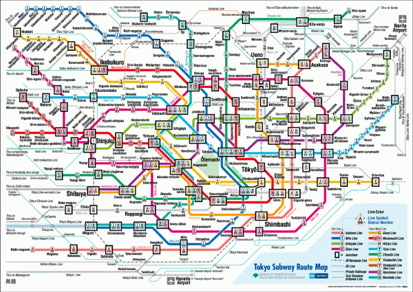Metroul este pentru turiști cea mai bună modalitate de deplasare. Există și o facilitate convenabilă – un card Metro Pass valabil pentru 24, 48 sau 72 de ore ce poate fi achiziționat de la principalele stații (detalii aici). Rețeaua de metrou este vastă – mai jos o hartă a metroului din Tokyo, cu mențiunea că se poate fi schimbat între timp.