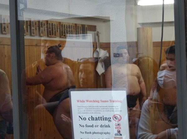 Nu departe de Tsukuji se află cartierul Ryogoku unde se găsesc cele mai multe săli de antrenament de sumo. Turneele de sumo de la marea arenă Kokugikan au loc doar de 3 ori pe an (în ianuarie, martie și septembrie). Ne-am fi dorit mult să ajungem la unul, dar nu a fost să fie la început de aprilie. Cea mai bună alternativă la un turneu a fost o vizită la o sală de antrenament. Există săli ce pot fi vizitate ca parte dintr-un tur (foarte scump și cu rezervare în avans) dar și una care oferă posibilitatea turiștilor să privească la geam – Arashio Beya. Am ales să mergem la aceasta din urmă și alături de alți turiști ne-am uitat de la ferestră la antrenamente.