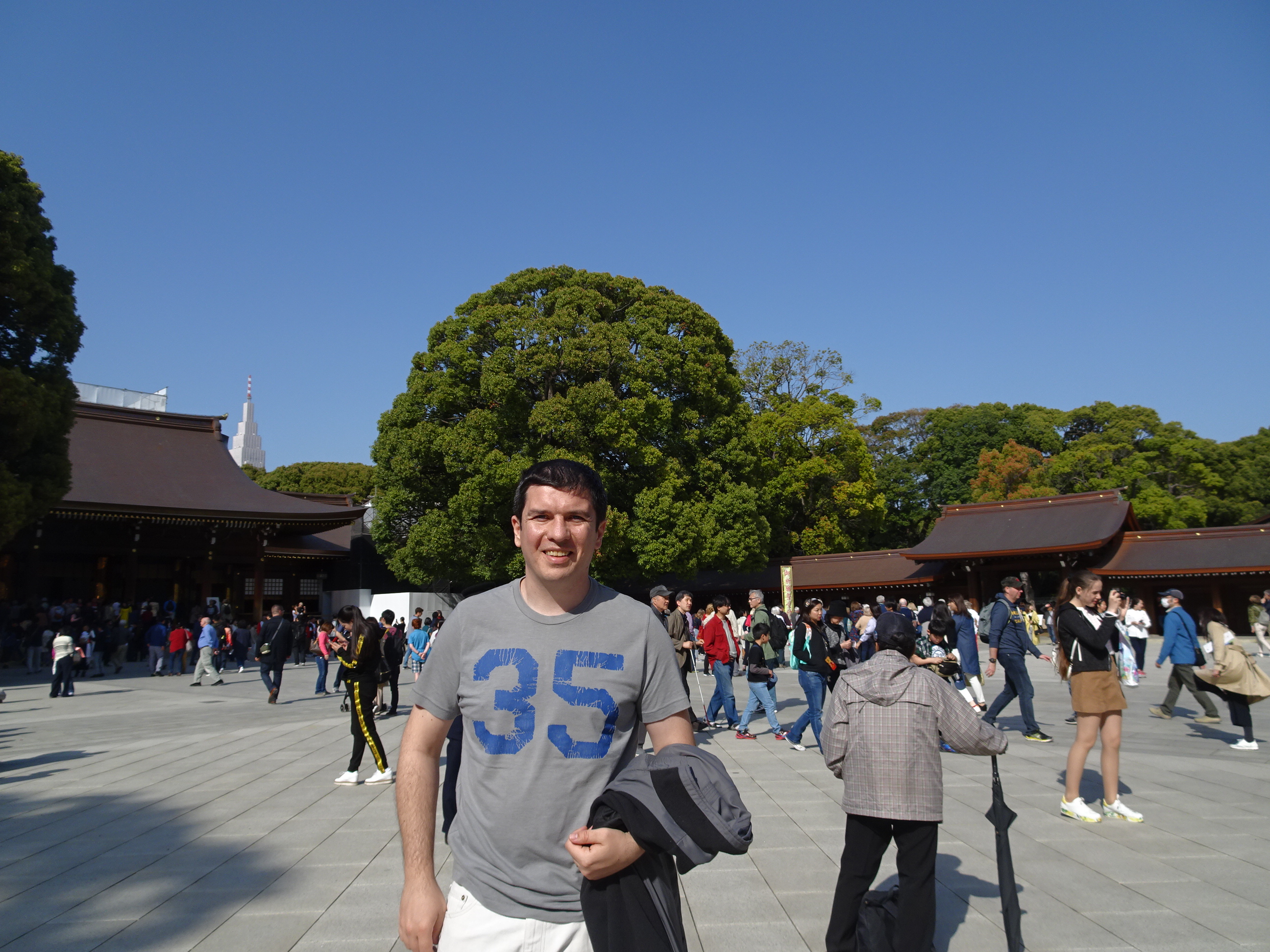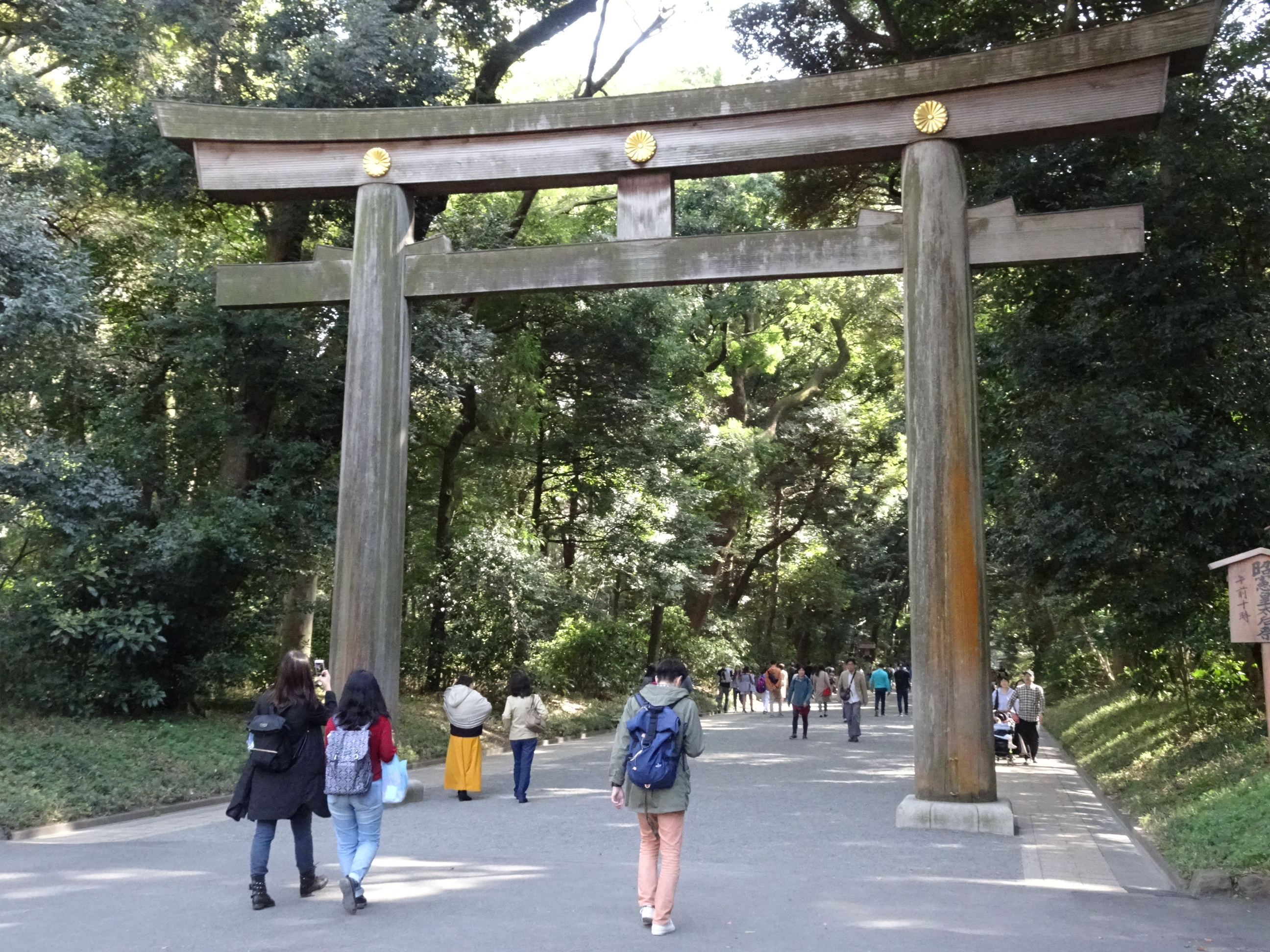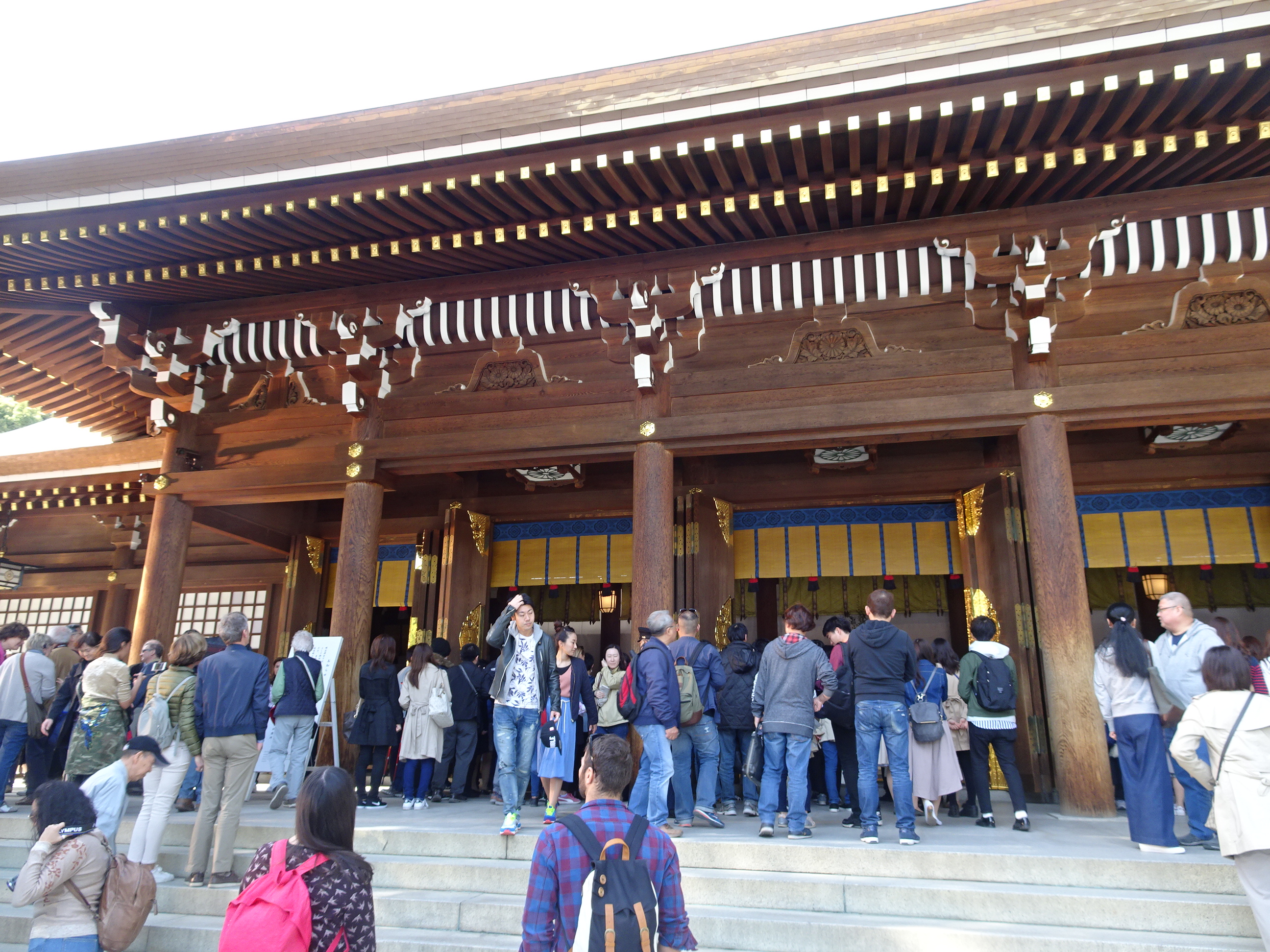 La parcul Meiji se poate ajunge din Shinjuku mergând pe jos. Parcul este o adevărată oază verde în mijlocul orașului preferat de cei mai mulți localnici pentru plimbări. În mijlocul parcului se află Meiji Jingu templul Shinto dedicat împăratului Meiji. Acolo am avut un prim contact cu tradițiile japoneze de la templu. Mai întâi am trecut pe la bilețele cu noroc. Fiecare vizitator poate cumpăra un bilețel pentru a-și afla norocul. Se extrage mai întâi un număr dintr-un tub de bambus, iar apoi se primește bilețelul cu același număr (sunt disponibile și în limba engleză). Dacă biletul este cu ghinion el trebuie legat de o sârmă în vânt. Probabil v-ați dat deja seama că japonezii sunt foarte superstițioși, iar la temple se vede asta cel mai bine. Am mers și la rugăciune la templul propriu-zis unde oricine este bine-venit. Tot la Meiji, am putut urmări o ceremonie pentru cununia a doi tineri. Procesiunea este foarte elegantă iar alaiul defilează într-o ordine foarte strictă, începând cu preoții, mirii, părintii și apoi invitații în ordinea vârstei.