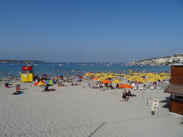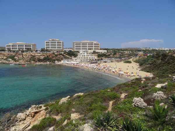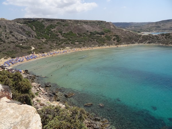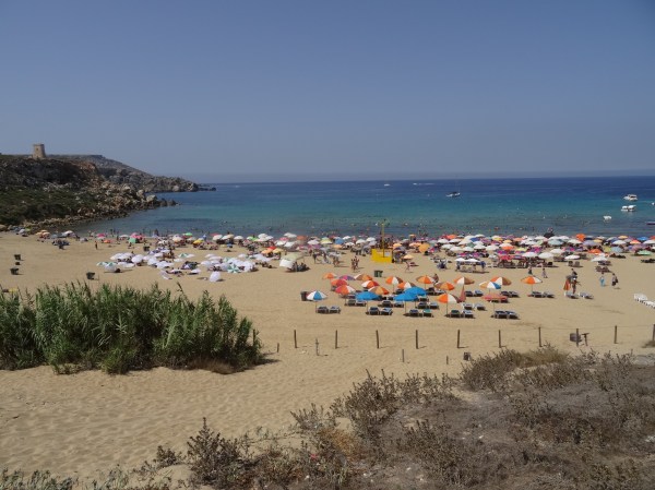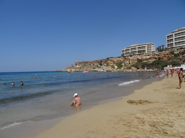 Cea mai vizitată plajă din Malta este Paradise Bay în nord-vest. Acolo a fost primul loc unde am mers. Din Qawra se merge cam 40 de minute pentru a ajunge acolo. Plaja este amenajată și se pot închiria șezlonguri sau umbrele și există un restaurant aproape la hotelul Radisson (singurul din zonă). Nisipul e fin iar apa numai bună pentru a tolera mai bine căldura de afară. Am spus deja în articolul anterior, noi am mers în august, iar maximele zilnice au fost în jur de 35-40 de grade.