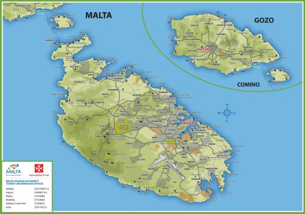 Harta Maltei. Plajele cu nisip (marcate cu umbreluțe) sunt foarte puține – se află mai ales în nordul insulei și în Gozo.
