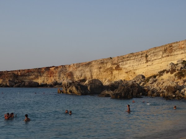 Altă zi când am mers la plajă am luat autobuzul spre capătul nordic al Maltei, de unde se ajunge la Golden Bay. Pe drum am oprit să facem o baie pe plaja din Melieha – singura plajă „urbană” din Malta – nu atât de frumoasă ca celelalte dar foarte aglomerată. Am revenit apoi la autobuz iar de la stație am mai mers ceva pentru a ajunge la Golden Bay, o plajă mică cu nisip auriu aflată într-un cadru natural foarte frumos. Am stat acolo până la apus.