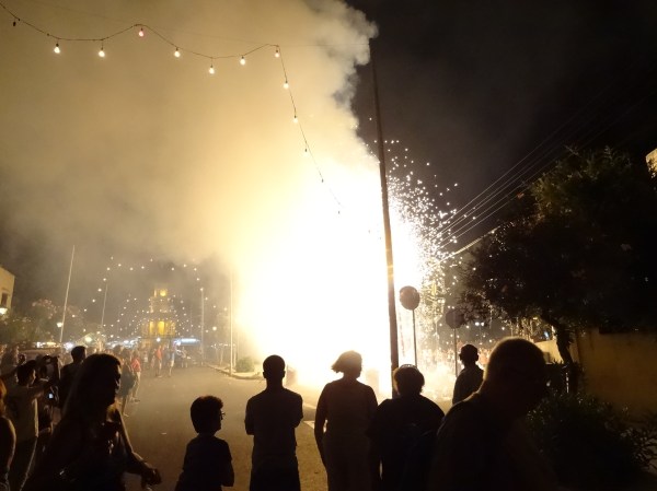 Ce am găsit la fața locului a fost mult peste așteptări. Mii de oameni pe străzile luminate de petrecere. Centrul sărbătorii din Lija era biserica satului decorată frumos. Înauntru aveau loc ceremonii religioase iar afară cânta fanfara locală. Am servit masa la unul din restaurantele din apropiere și am dat o tură pe la standurile cu dulciuri și suveniruri. Pe la 10 a început focul de artificii. A durat aproape o oră. Nu am văzut niciodată așa ceva în altă parte. Mai spre miezul nopții a început spectacolul pirotehnic la sol, o adevărată nebunie cu zeci de dispozitive explozive. Zgomotul a fost asurzitor și tot satul s-a umplut apoi de fum. Nu mi s-a părut tocmai sigur, dar cu certitudine a fost o experiență unică. Târziu în noapte am revenit către autobuz și mai apoi la hotel.