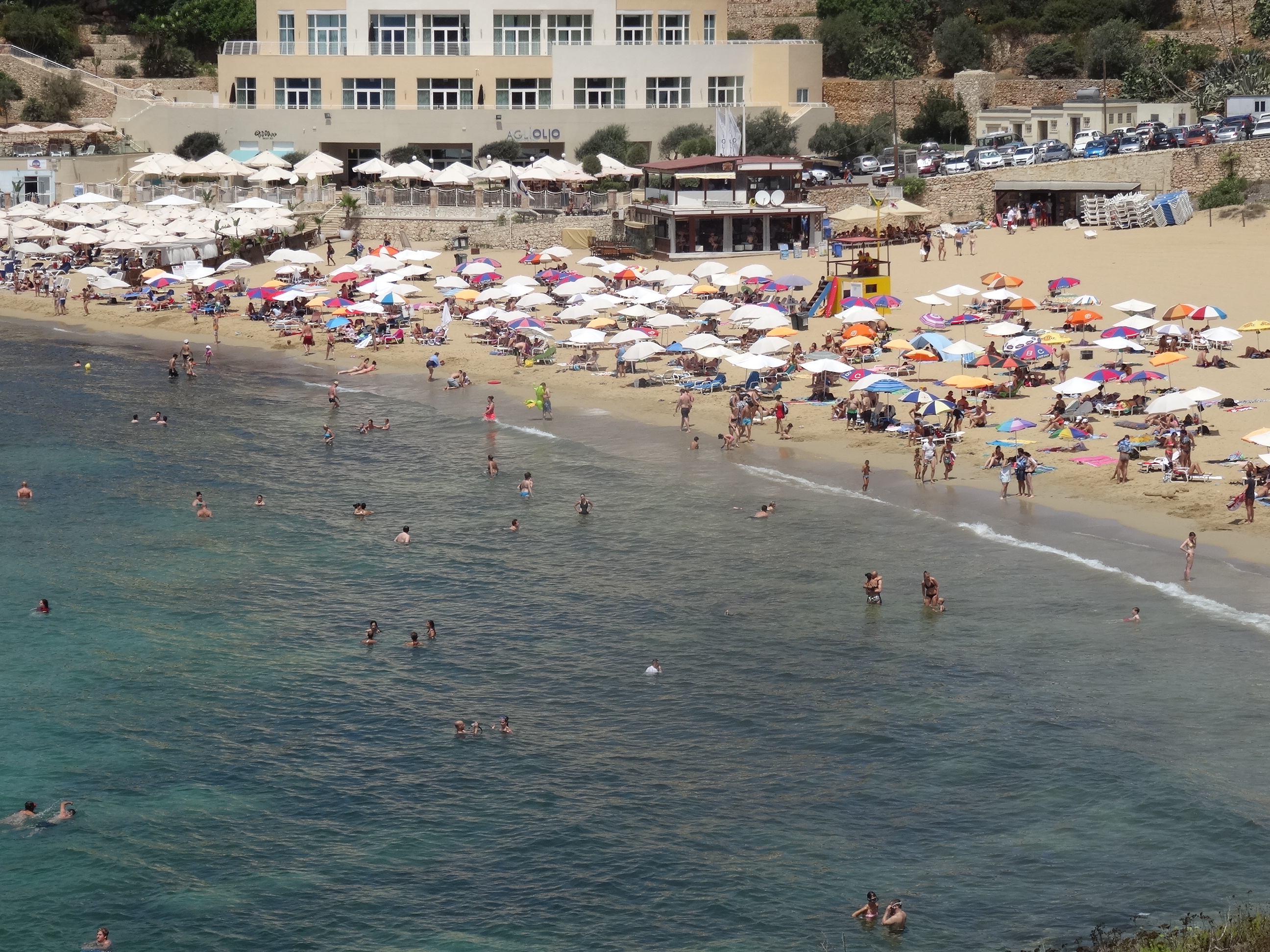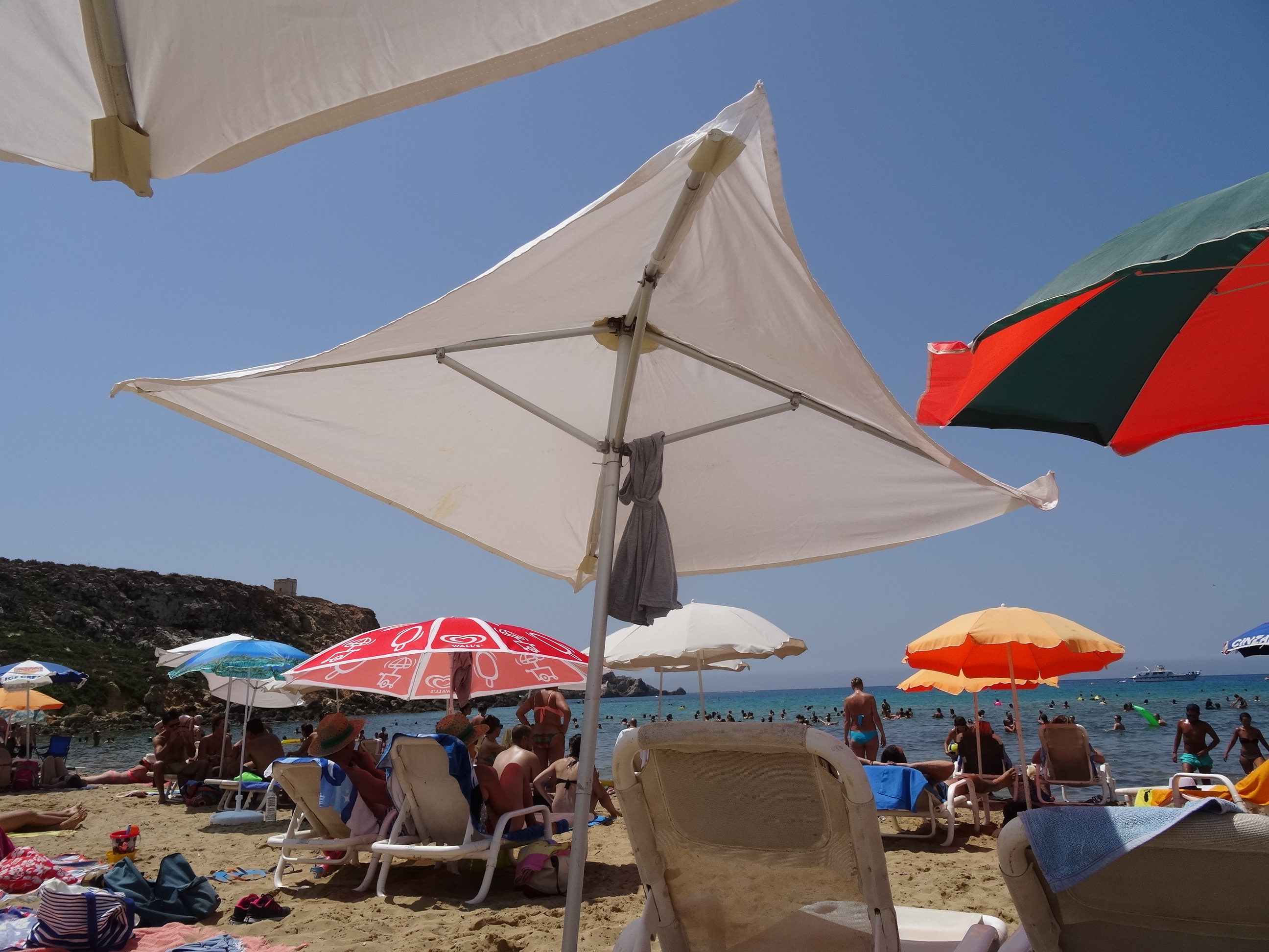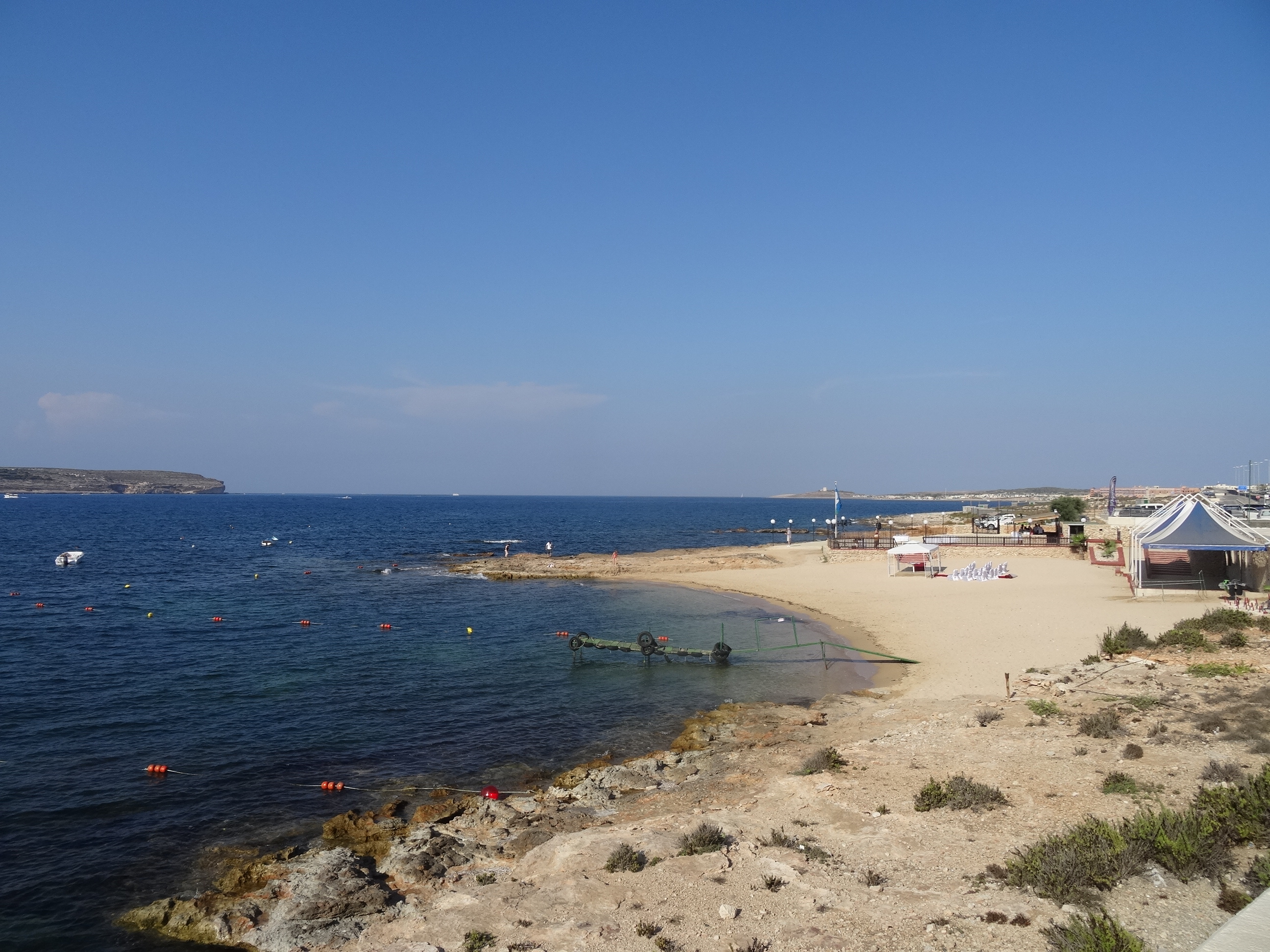Cea mai vizitată plajă din Malta este Paradise Bay în nord-vest. Acolo a fost primul loc unde am mers. Din Qawra se merge cam 40 de minute pentru a ajunge acolo. Plaja este amenajată și se pot închiria șezlonguri sau umbrele și există un restaurant aproape la hotelul Radisson (singurul din zonă). Nisipul e fin iar apa numai bună pentru a tolera mai bine căldura de afară. Am spus deja în articolul anterior, noi am mers în august, iar maximele zilnice au fost în jur de 35-40 de grade.