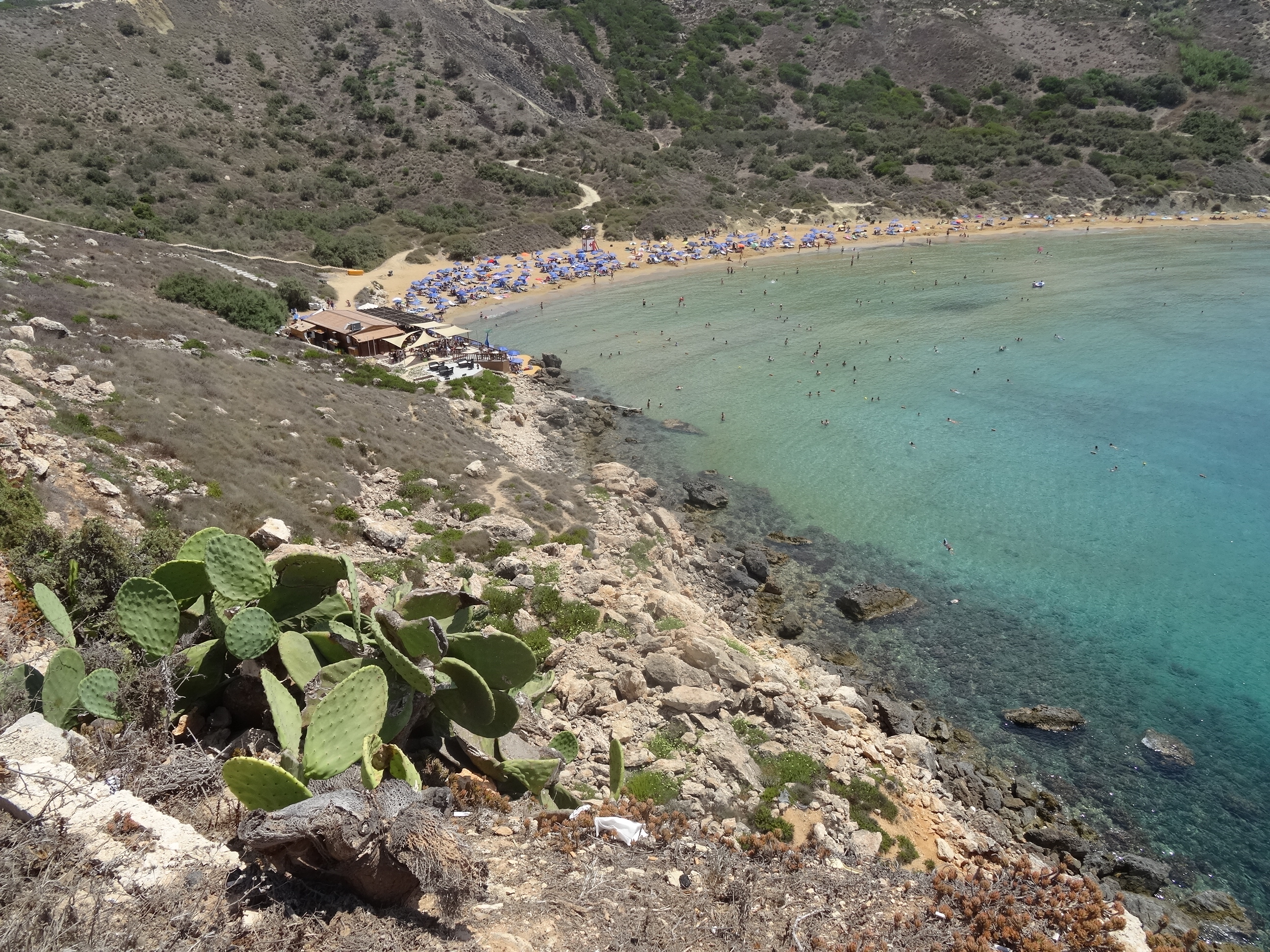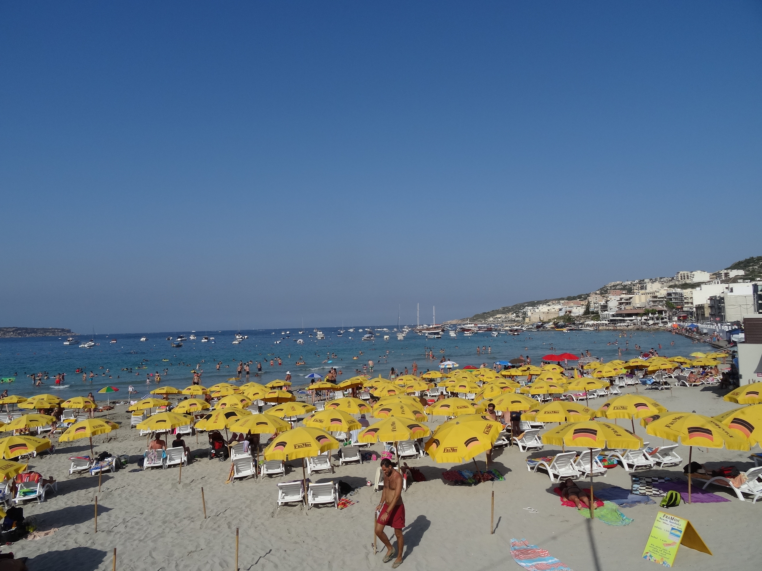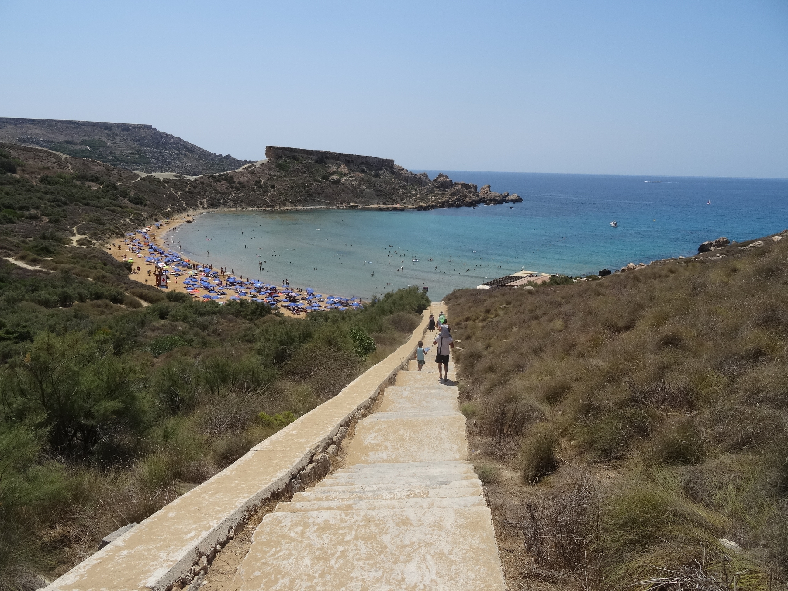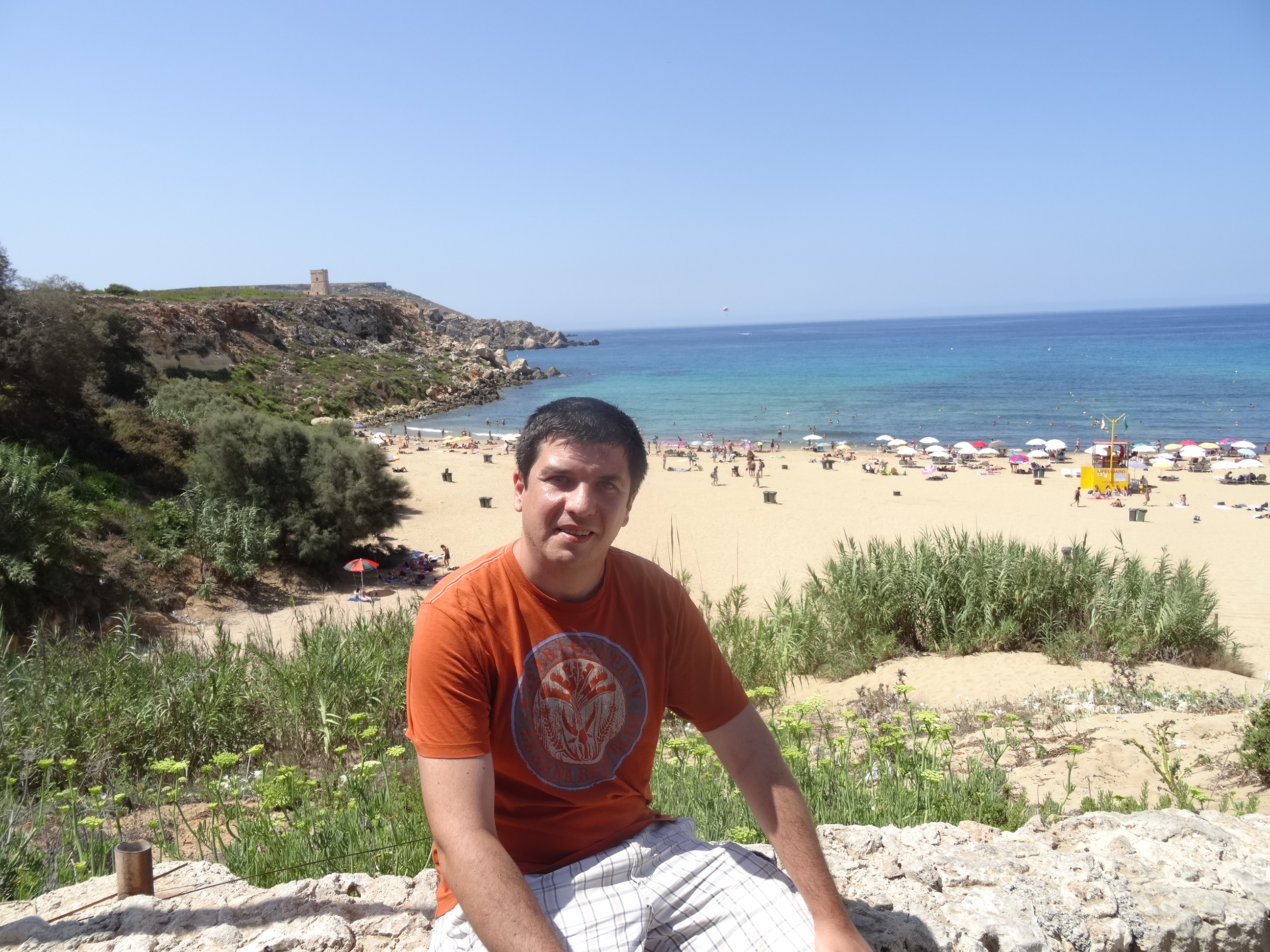 Altă zi când am mers la plajă am luat autobuzul spre capătul nordic al Maltei, de unde se ajunge la Golden Bay. Pe drum am oprit să facem o baie pe plaja din Melieha – singura plajă „urbană” din Malta – nu atât de frumoasă ca celelalte dar foarte aglomerată. Am revenit apoi la autobuz iar de la stație am mai mers ceva pentru a ajunge la Golden Bay, o plajă mică cu nisip auriu aflată într-un cadru natural foarte frumos. Am stat acolo până la apus.