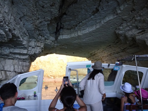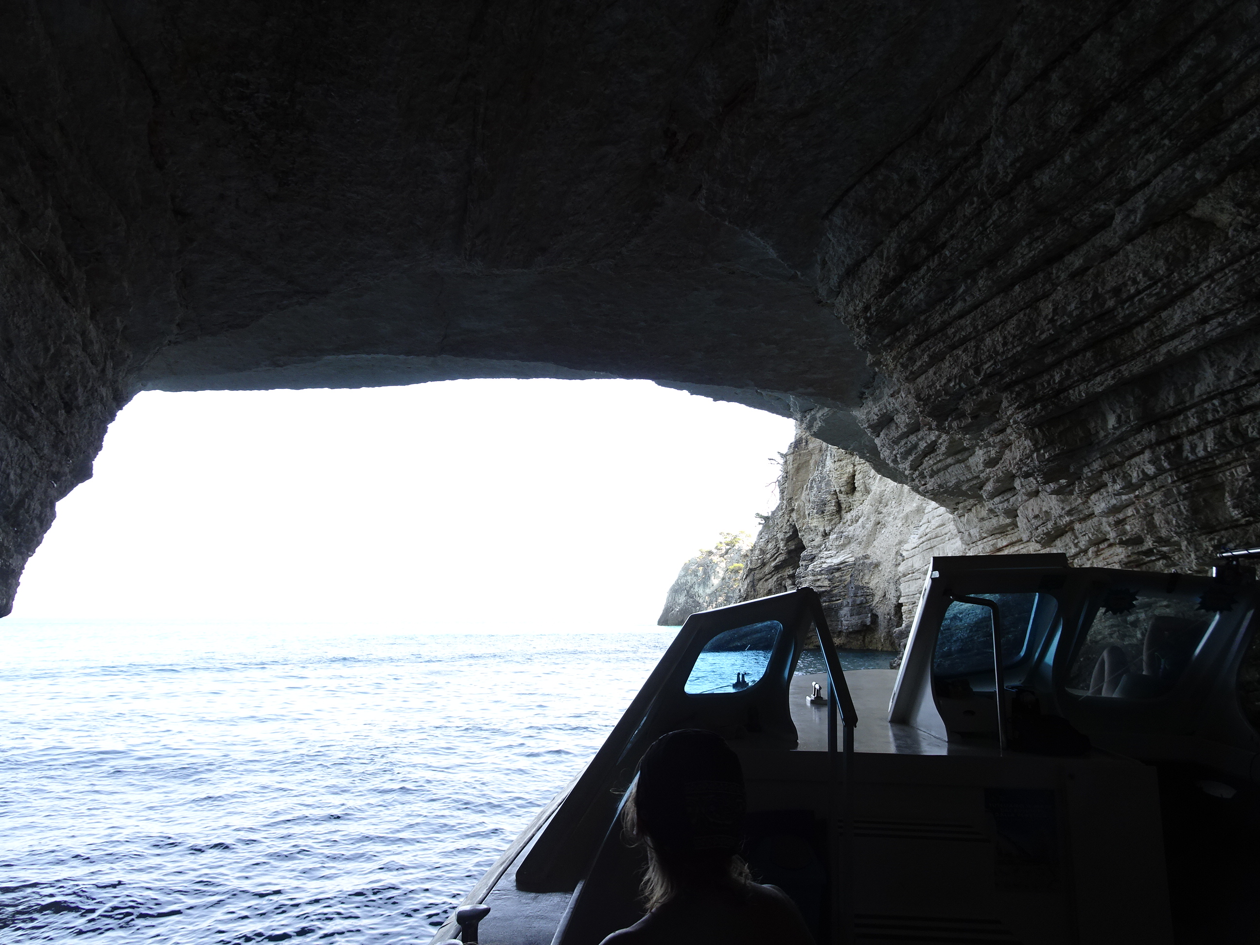 Mai departe au început să apară grotele. Nu ne așteptam dar am intrat cu barca în fiecare dintre acestea cu multă iscusință din partea comandantului navei. Câteva dintre ele sunt absolut uimitoare. Pe mal am mai văzut ingenioasele platforme din lemn de pescuit numite „trabucco” care se agață de stâncile abrupte. După ce am trecut de vârful peninsulei – Testa del Gargano, peisajul s-a schimbat dramatic, cu maluri mult mai înalte și formațiuni stâncoase din ce în ce mai ciudate. Am vizitat cu vaporul câteva grote ceva mai mari, una dintre ele având chiar 3 ieșiri spre mare.