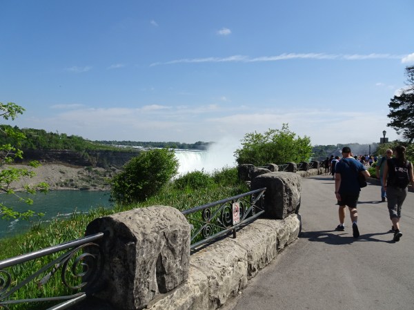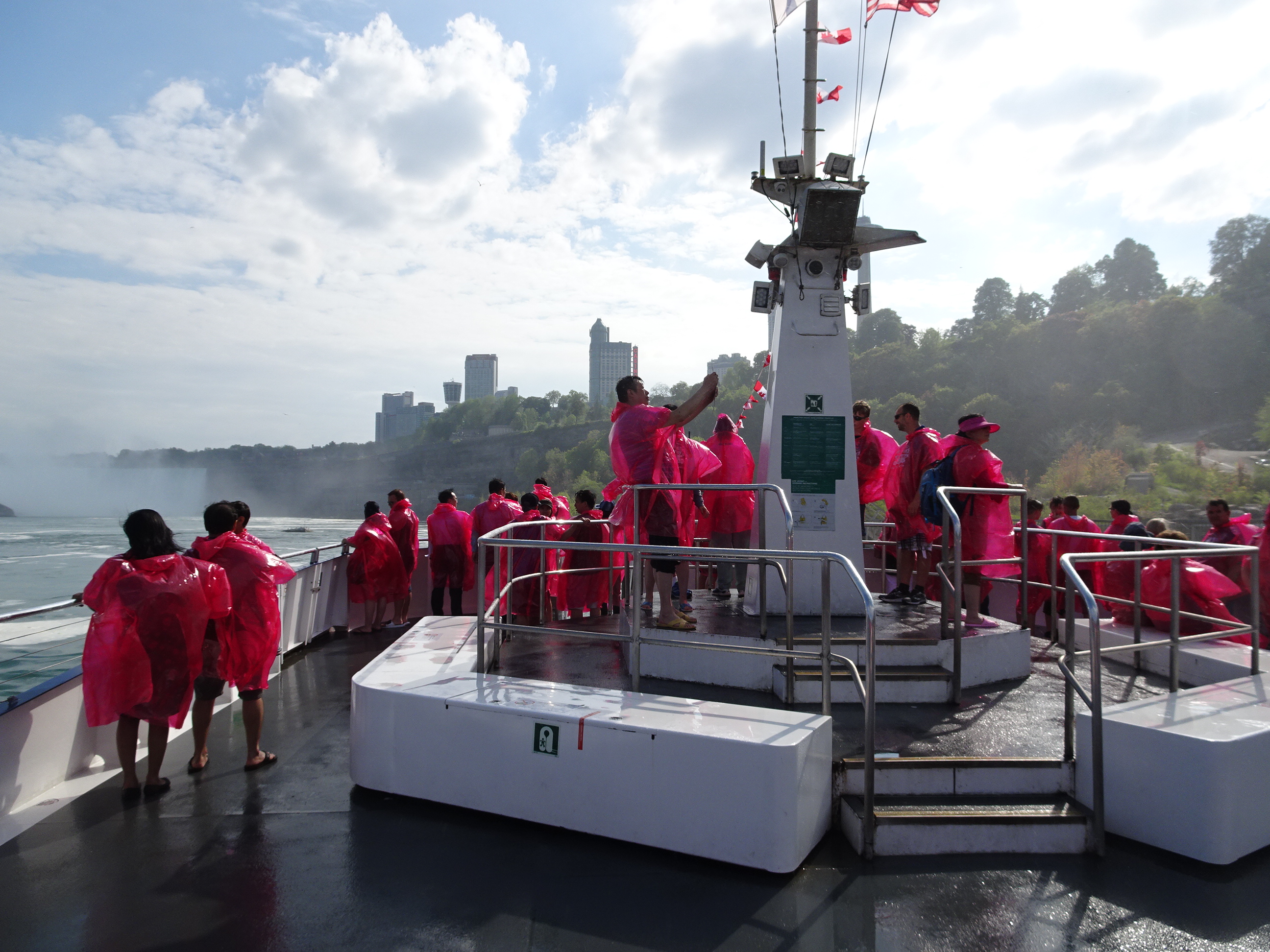 Prima zi am decis să facem o plimbare cu vaporașul pe râul Niagara. Voyage to the Falls este probabil experiența de neratat într-o vizită la cascadă. Plimbarea cu vaporul durează aproximativ 30 de minute iar vaporul merge până aproape de vâltoarea cascadei de unde nimeni nu scapă uscat. Biletele costă 25 de dolari canadieni, se coboară până la vapor cu liftul iar fiecare vizitator primește o pelerină. Plimbările cu vaporul se fac de pe ambele maluri. De pe partea americană se merge cu vapoarele Maid of the Mist. Pentru a diferenția pasagerii și vapoarele, americanii au pelerine albastre iar canadienii pelerine roșii.