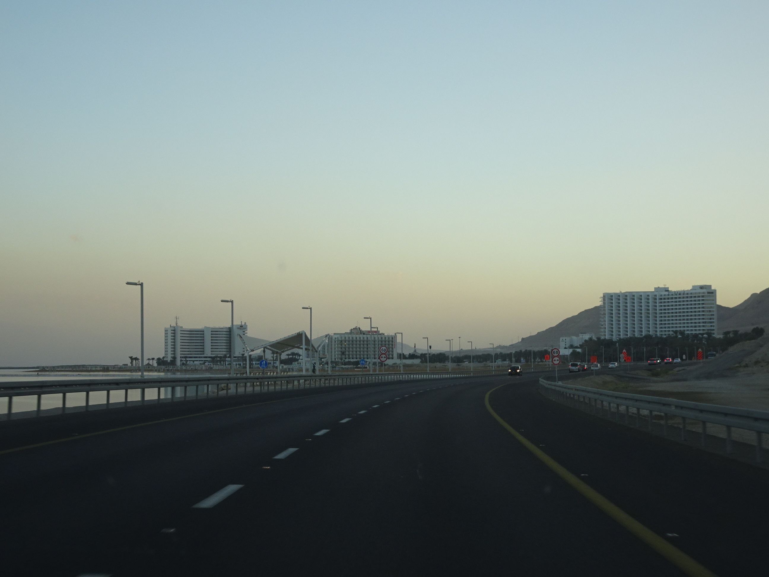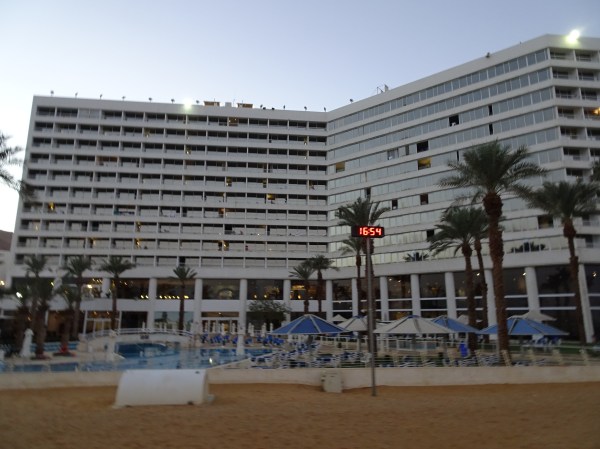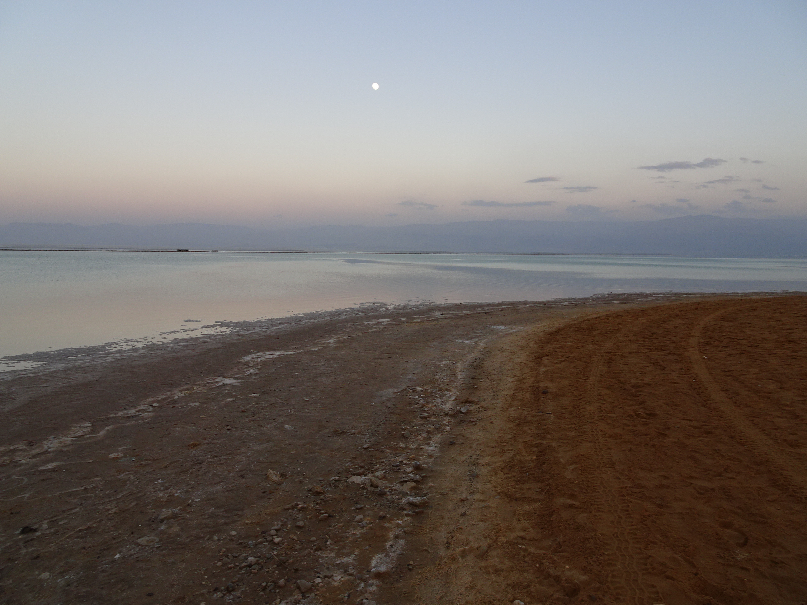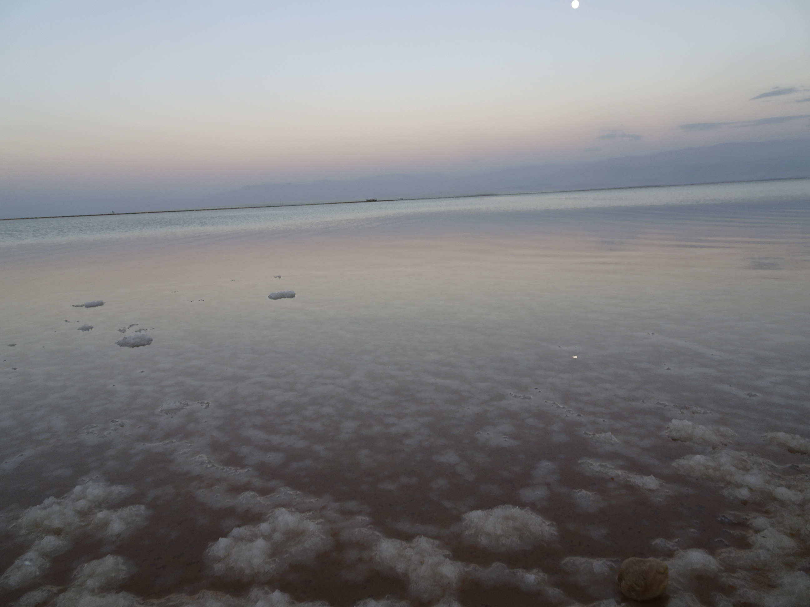 Am sosit la Ein Bokek, stațiunea principală de la Marea Moartă, chiar înainte de lăsarea serii. Nu am mai făcut baie în apa sărată (apa era caldă, dar să încerci o dată e suficient) ci am făcut o plimbare pe plajă, la aerosoli cum spune. La lumina apusului marea avea o culoare specială iar soarele, luna și dealurile din jur se oglindeau pe întinderea de apă.