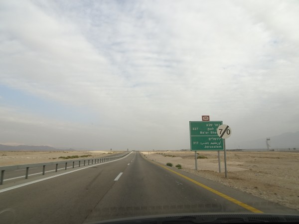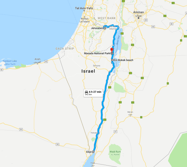 De la Eilat sunt 320 de kilometri iar drumul se parcurge în cel 3-4 ore. Traseul cel mai scurt spre Ierusalim trece prin Palestina (West Bank). Nu eram siguri dacă putem merge cu mașina închiriată prin teritoriile palestiniene dar după ce ne-am interesat am confirmat că da, cu condiția strictă de a nu părăsi șoseaua principală, respectiv drumul 90 pe malul Mării Moarte și apoi autostrada 1. Cam așa arăta traseul nostru: