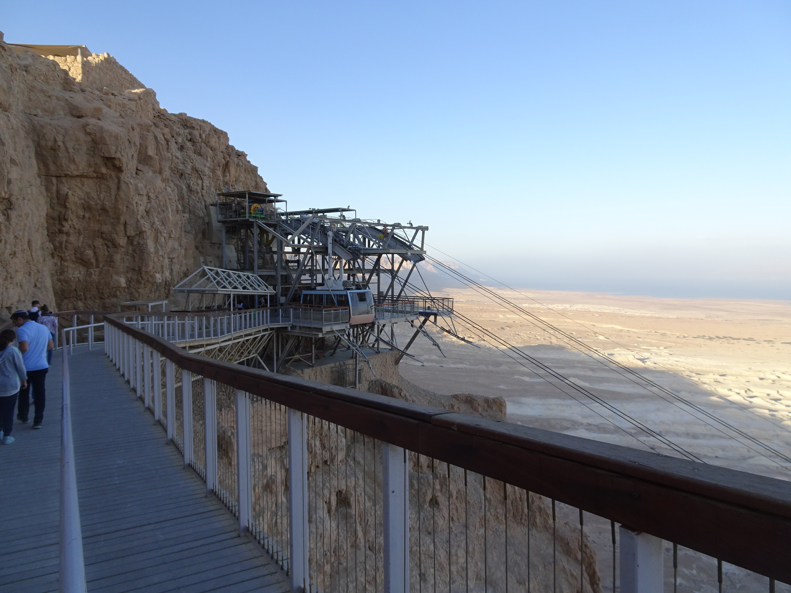 Am oprit apoi la Masada, cetatea construită pe dealuri unde se ajunge cu telecabina. Am parcat la centrul pentru vizitatori și am avut norocul să ajungem cu minute înainte de ultima urcare a zilei. Am luat repede biletele dus-întors și ne-am îmbarcat. Din telecabină am văzut câteva priveliști minunate deasupra ambelor maluri ale Mării Moarte, israelian și iordanian.
