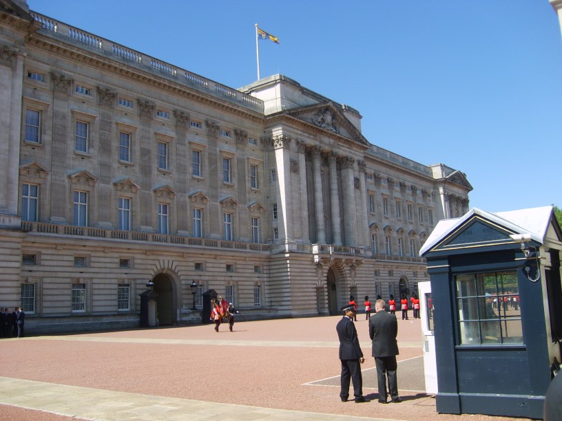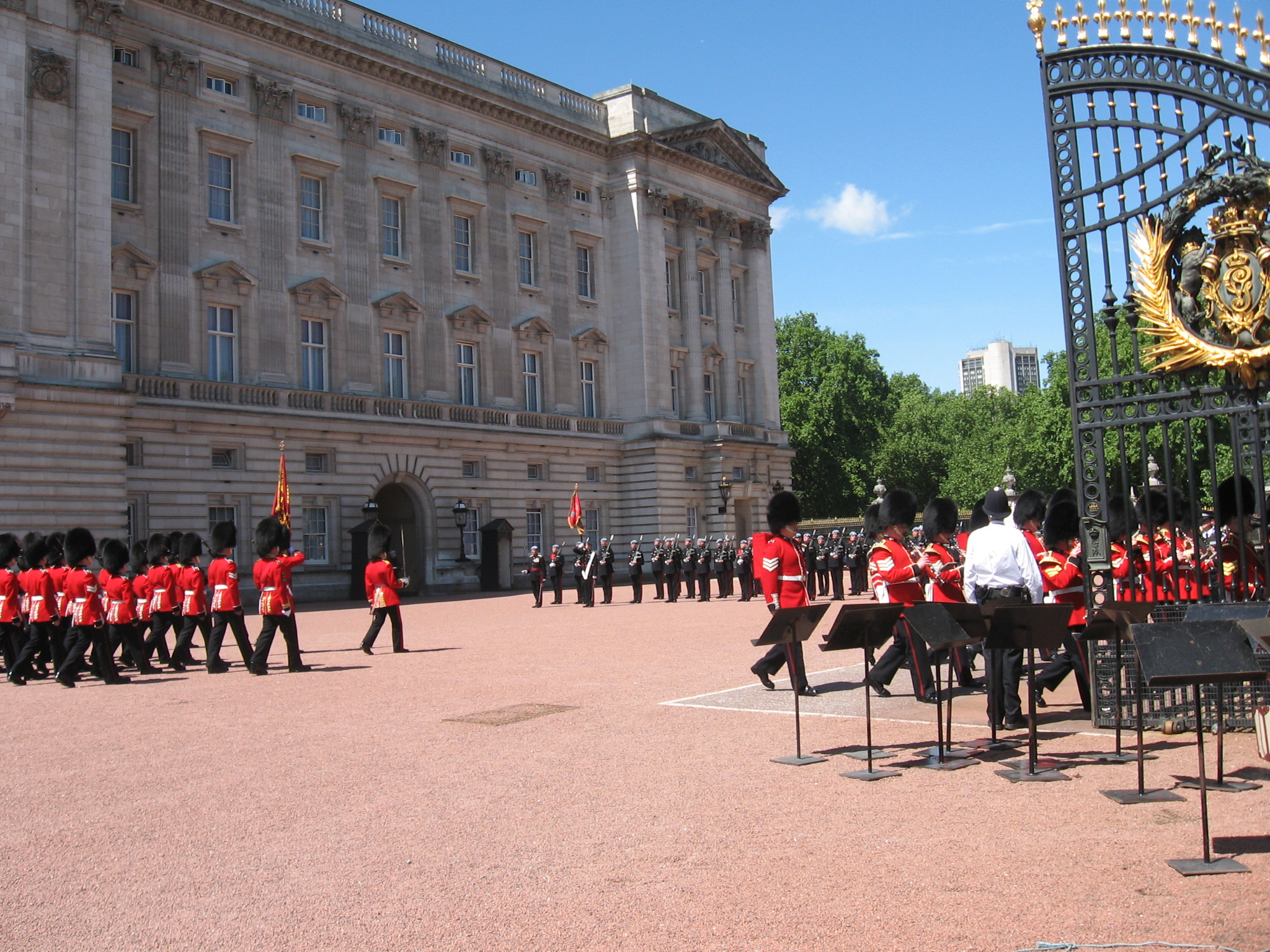 Ziua următoare ne-am trezit pe un soare splendid (o zi mai rar de găsit la Londra) și primul loc unde am mers a fost la palatul Buckingham unde am putut vedea schimbarea gărzilor. Ceremonia de la palat are loc fix la ora 10:45 în zilele de luni, miercuri, vineri și duminică când vremea este bună. De fiecare dată se strâng multe mii de turiști și pentru a prinde un loc bun trebuie venit devreme. Changing of the Guards este o ceremonie fastuoasă cu multe zeci de soldați, fanfare și obiceiuri bine stabilite. Cu totul durează 45 de minute, iar Garda Reginei execută ritualul cu mare atenție ignorând cu succes sutele de privitori.