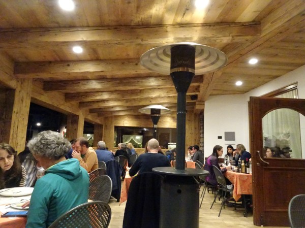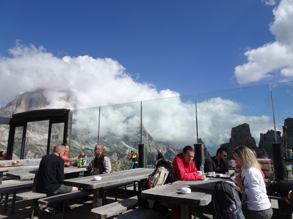 Mai târziu a ieșit soarele din nori și am putut admira din plin priveliștea munților de la terasa de la Rifugio Scoiatolli. Este puțin impropriu spus refugiu pentru este vorba de o cabană luxoasă care seamănă mai degrabă cu un resort de 5 stele… la peste 2350 de metri altitudine.