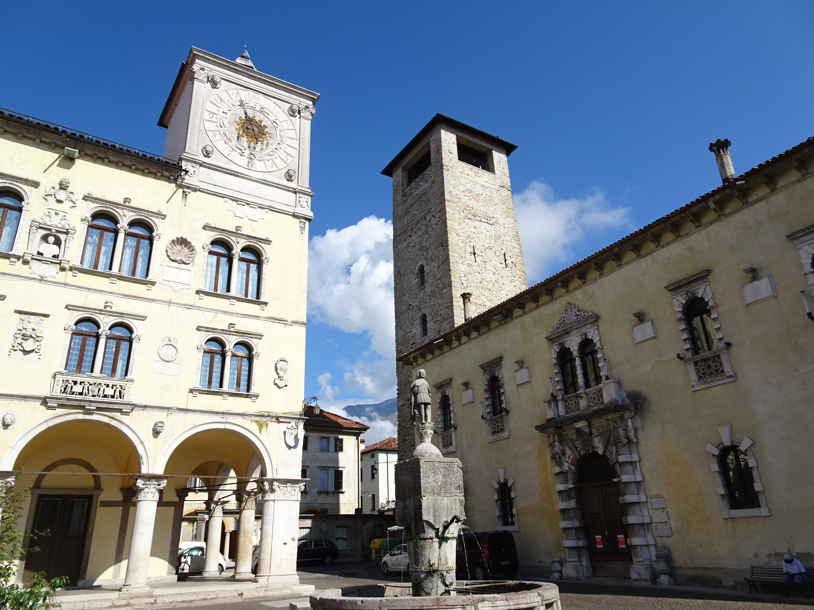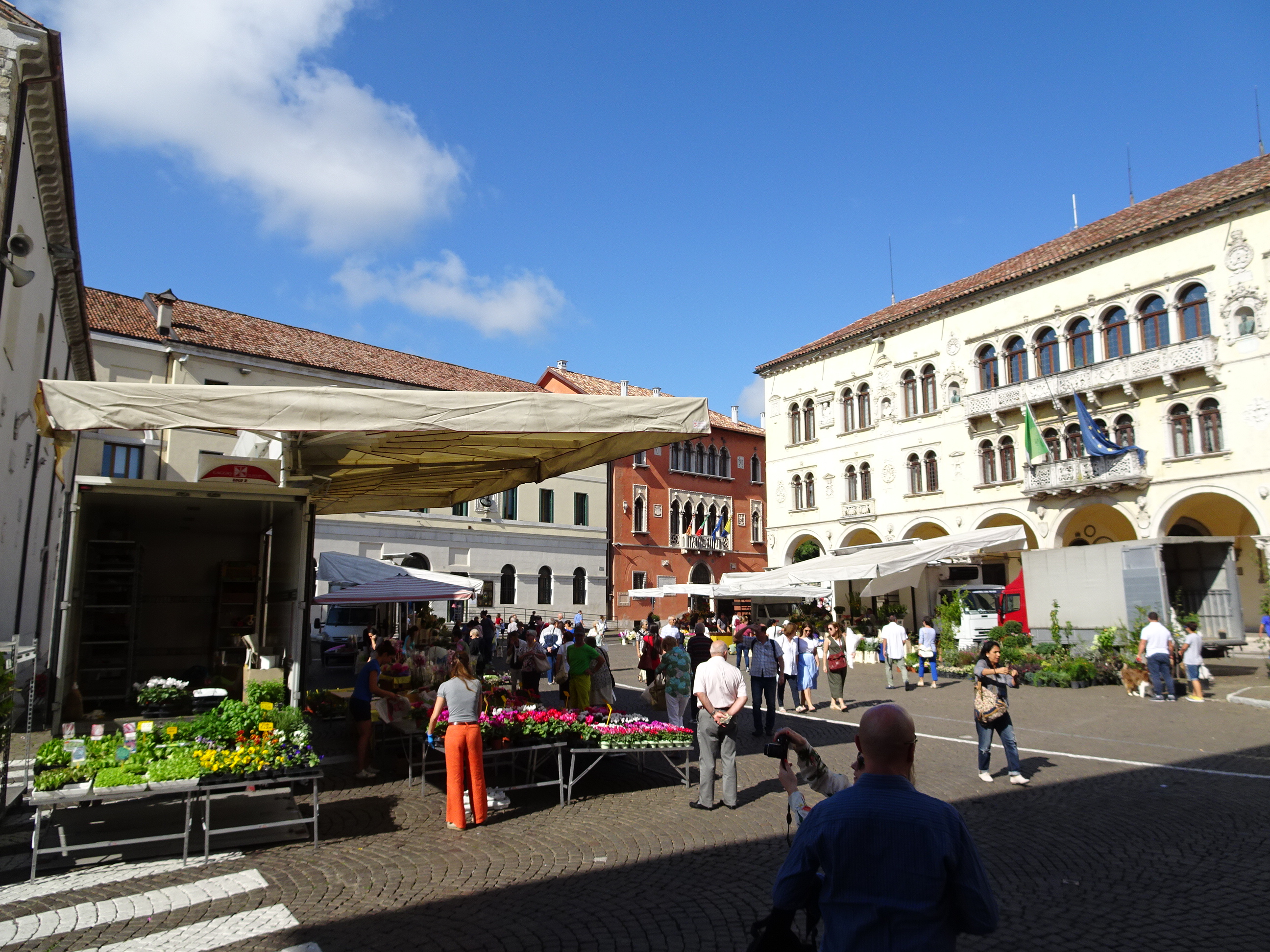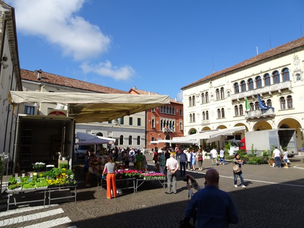 După o oră și ceva am făcut o primă pauză la Belluno, orașul de la poalele munților. Am prins Belluno în zi de sărbătoare. Am trecut pe la târgul amenajat în piața centrală, iar apoi am servit un espresso și un panino la terasă.