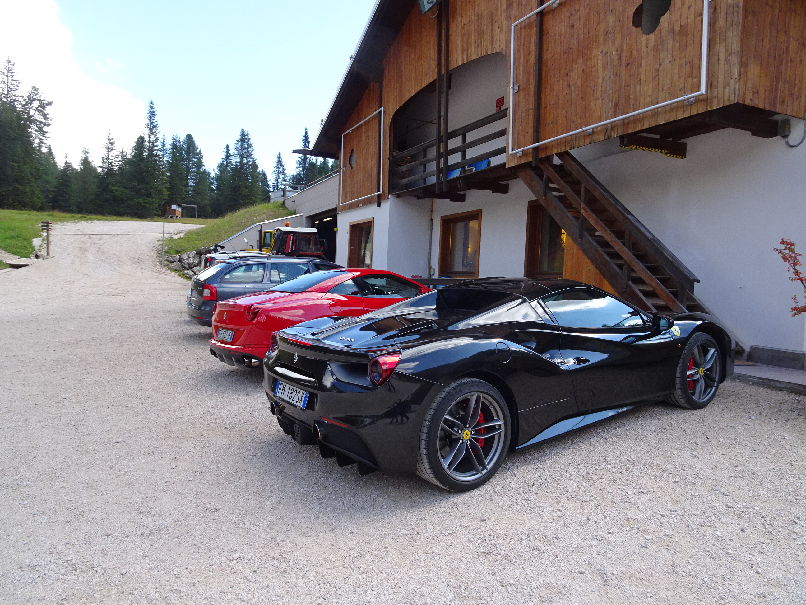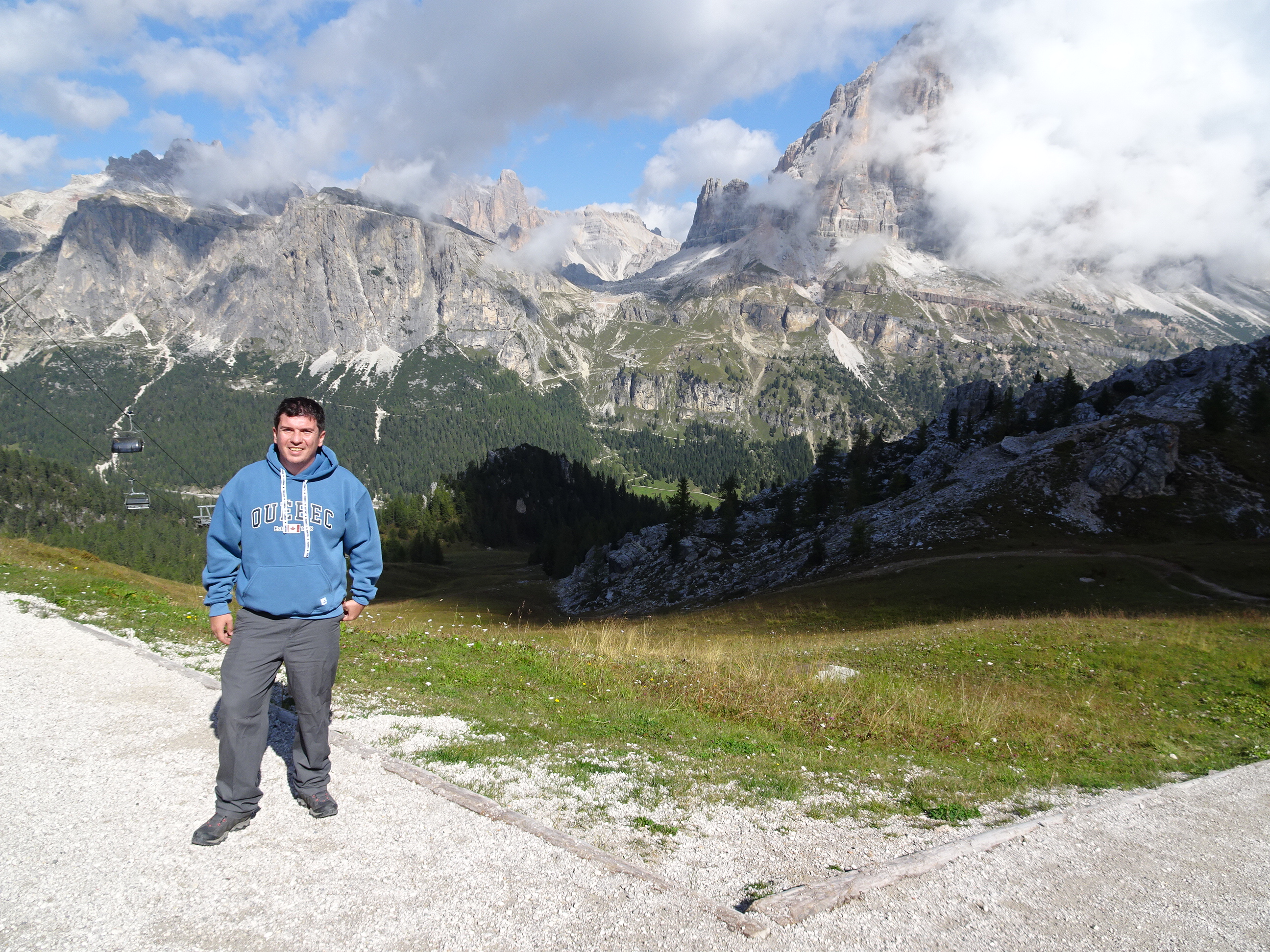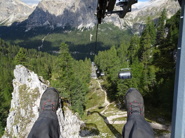 Prima oprire a zilei a fost la Cinque Torri, un alt masiv montan renumit pentru frumusețea peisajului. Am oprit la baza muntelui și până în vârf am urcat cu telescaunul. Parcarea de la bază era plină de mașini scumpe. Le-am admirat și apoi am mers la casa de bilete. Drumul până în vârf dus-întors a costat 15 euro și a durat aproximativ 10 minute.