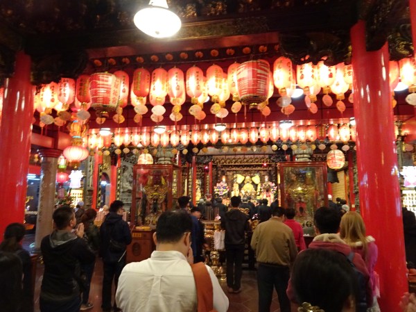 Trenul ne-a lăsat tot la gara Songshan. Lângă gară se află un alt renumit bazar de noapte din Taipei Raohe Night Market. Până să intrăm în târg am trecut pe la templul budist cu același nume unde am asistat la slujba de seară.