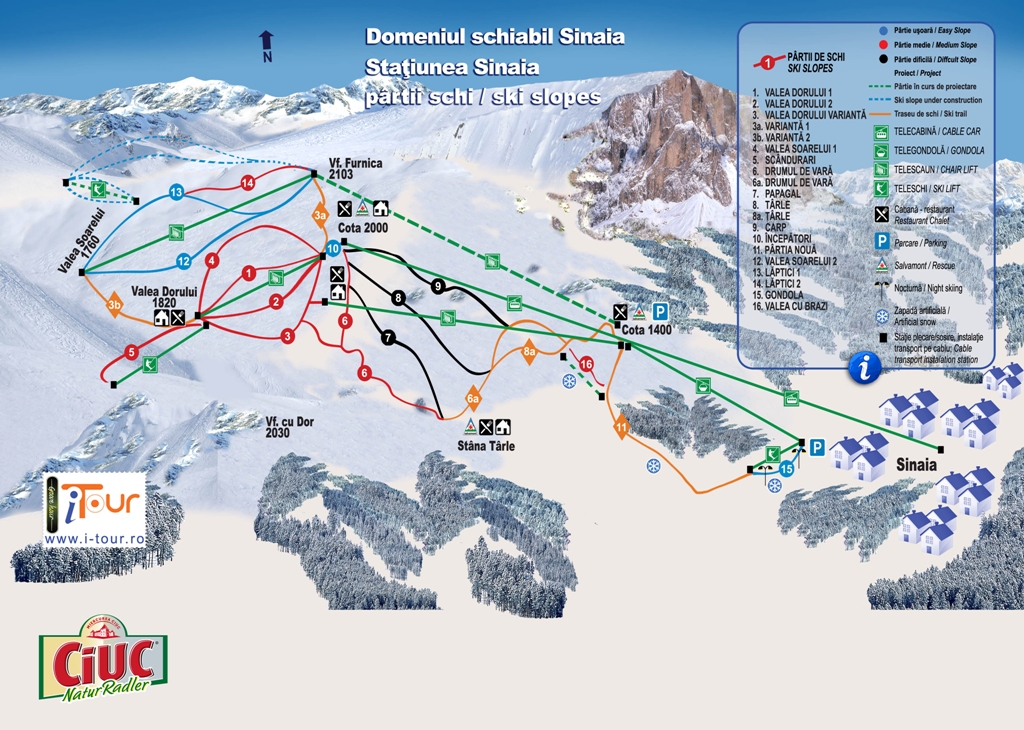 Dacă mergi la Sinaia e greu să nu urci și pe Bucegi. Există mai multe telecabine și telegondole care fac legătura intre centru și Cota 1400 iar mai sus Cota 2000. Sigur, scopul lor principal este pentru schi, dar se poate urca și vara pentru drumeții sau pur și simplu pentru a admira peisajul de pe platoul Bucegilor. Mai jos, harta lor…