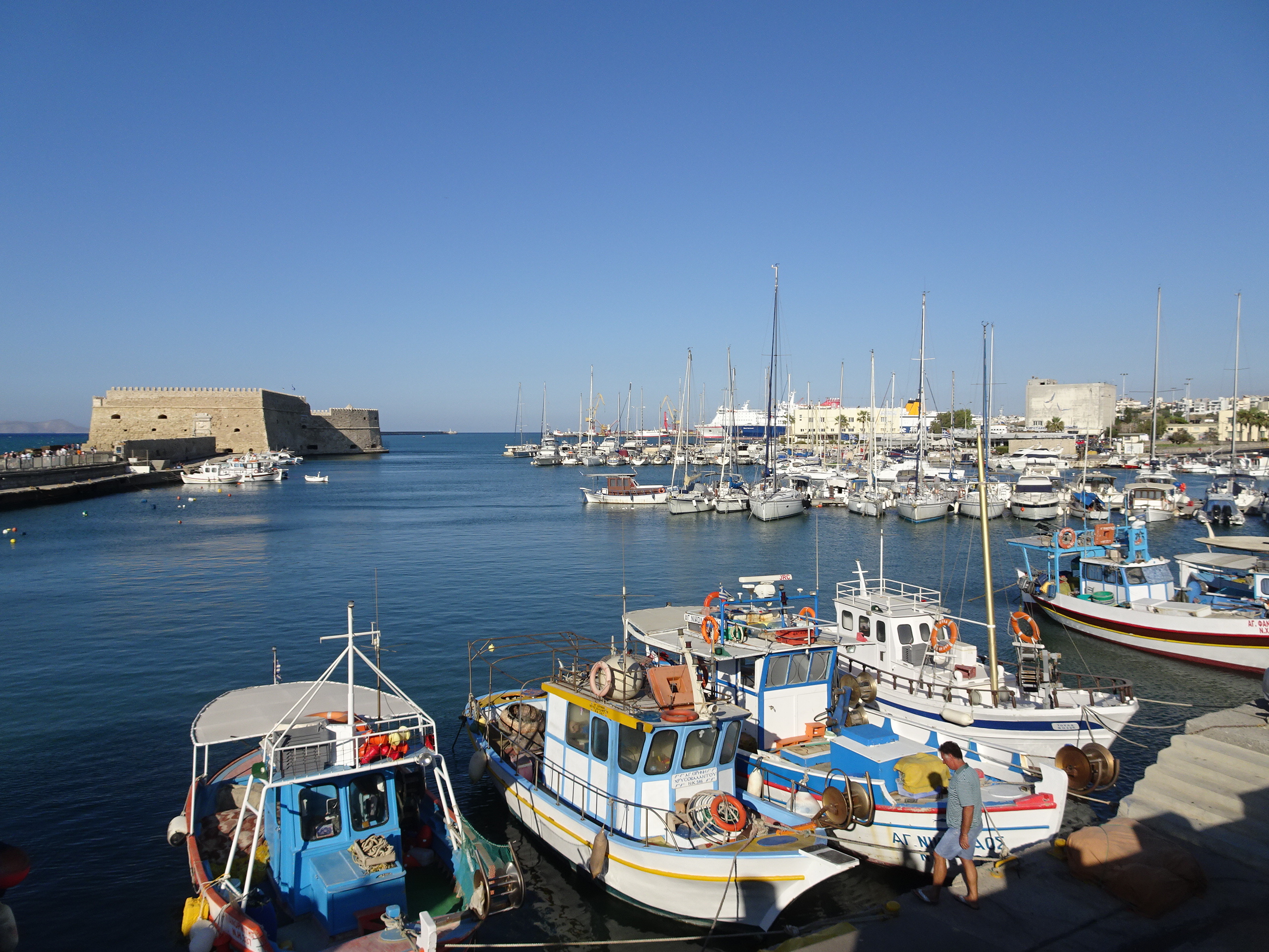 Ne-am plimbat pe bulevardul pietonal până am ajuns în portul turistic. Acolo, dincolo de bărcile pescărești multicolore, se află cetatea Koules, simbolul orașului.