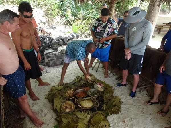 Masa a fost gătită tradițional cu cărbuni încinși la nisip. Când am sosit, totul era gata și am fost invitați să dezvelim prânzul de frunzele de banană. Bunătățile ne așteaptă.