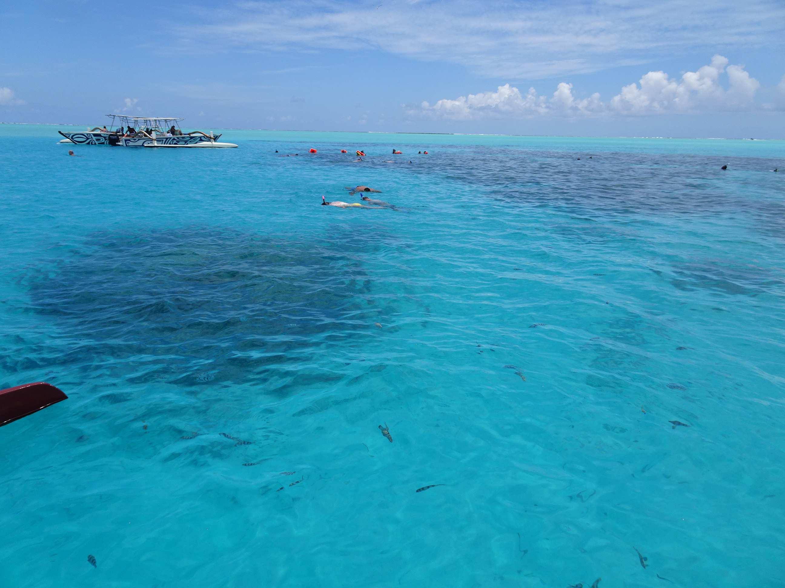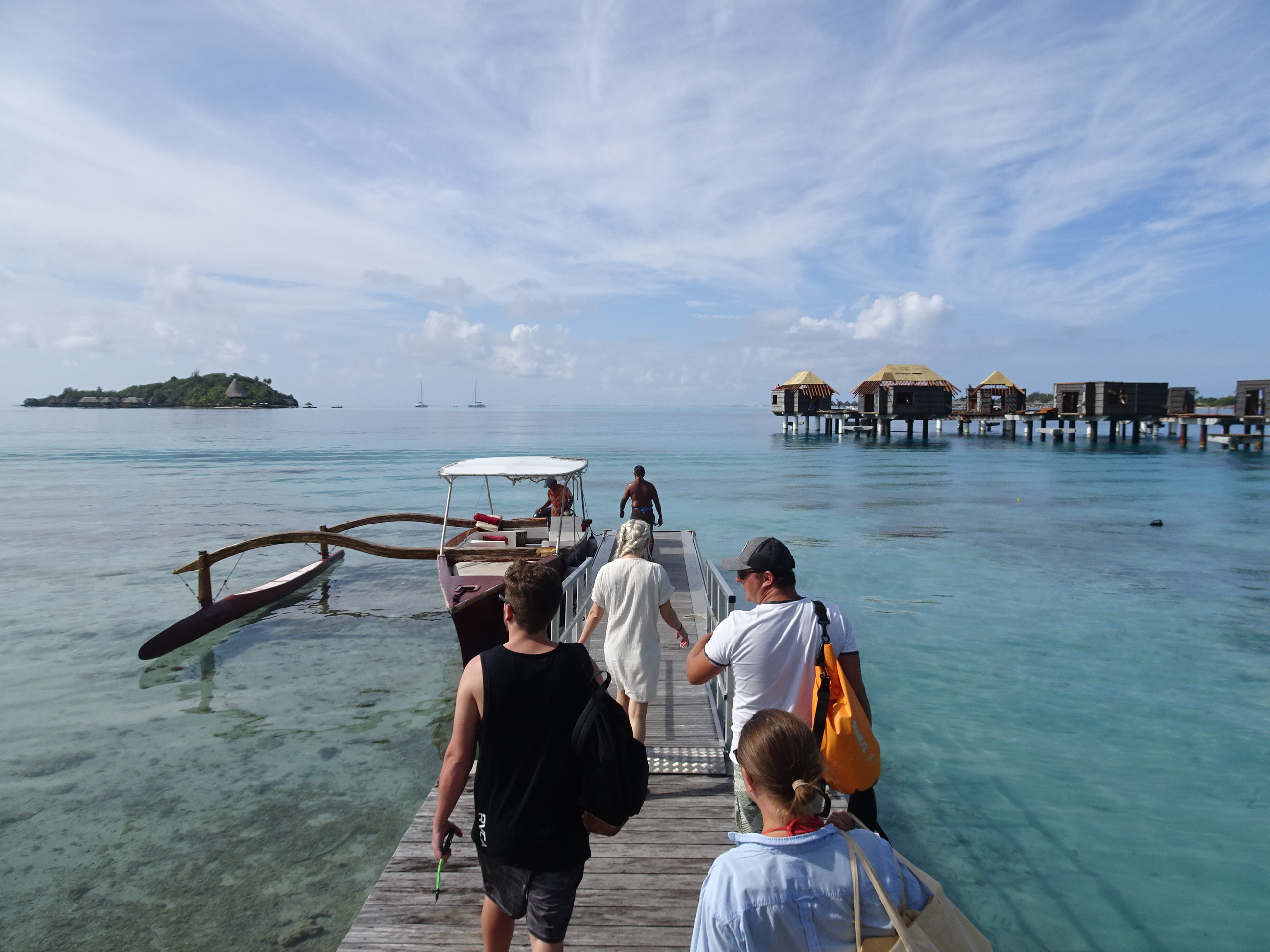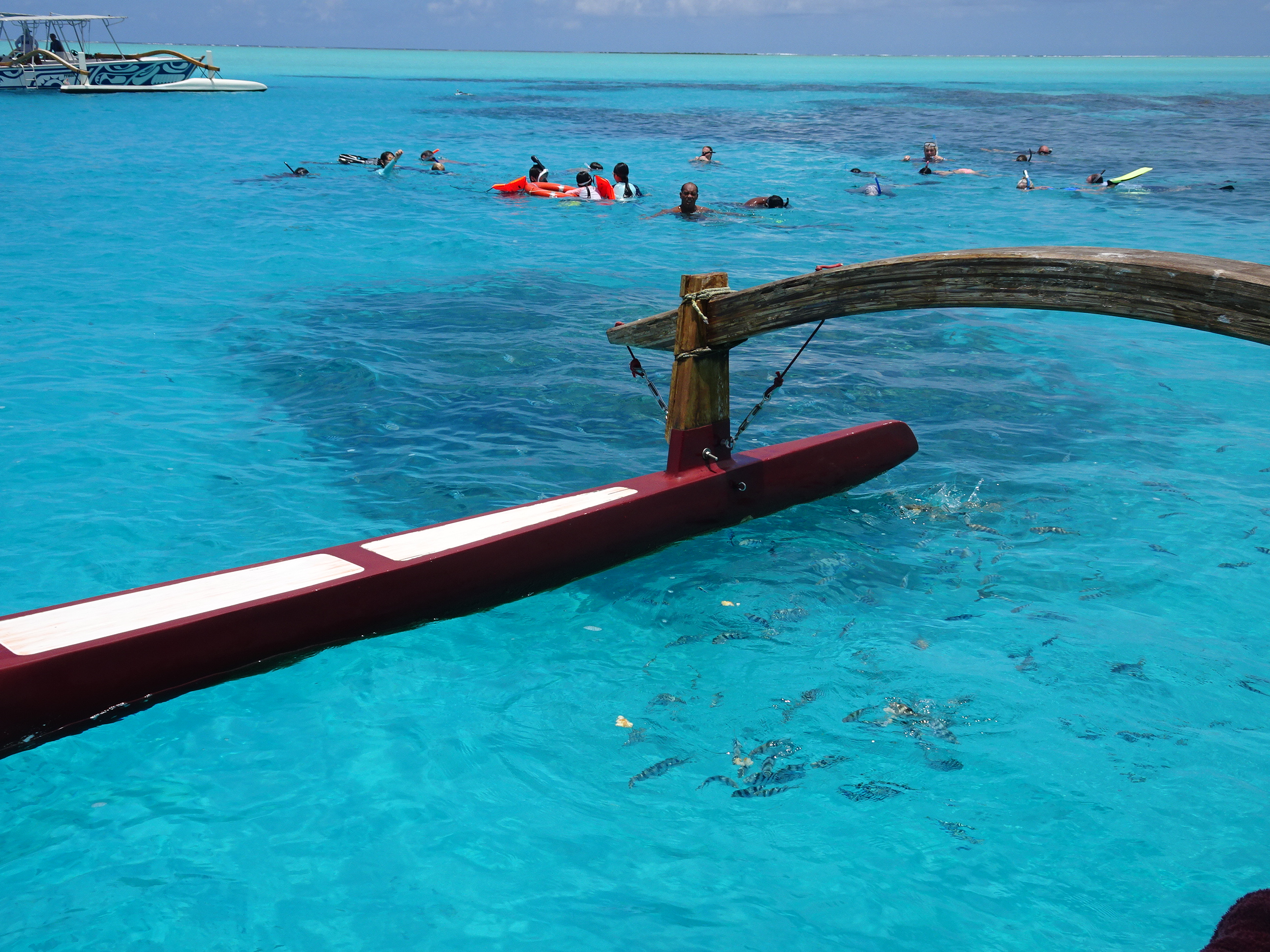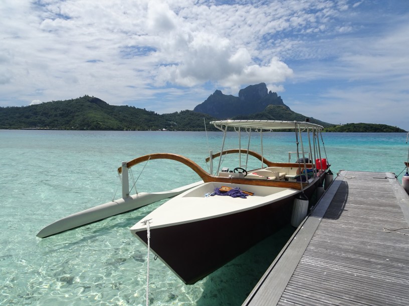 Excursia mi-a fost rezervată de gazdele mele de la pensiune de ziua anterioară. Fiind localnici pe o insulă mică unde mai toată lumea se cunoaște, mi-au găsit cea mai bună variantă, cu cel mai renumit ghid și la cel mai bun tarif. Programul excursiei era cam așa: transfer de la pensiune dimineața devreme către un ponton aproape de Matira, apoi 6 ore pe lagună cu ghid într-o barcă tradițională, incluzând aici 3 opriri pentru snorkelling, 2 opriri la plajă și un picnic la prânz pe motu, pentru a reveni după amiaza pe insulă la fix cat să prind relaxat zborul de întoarcere.