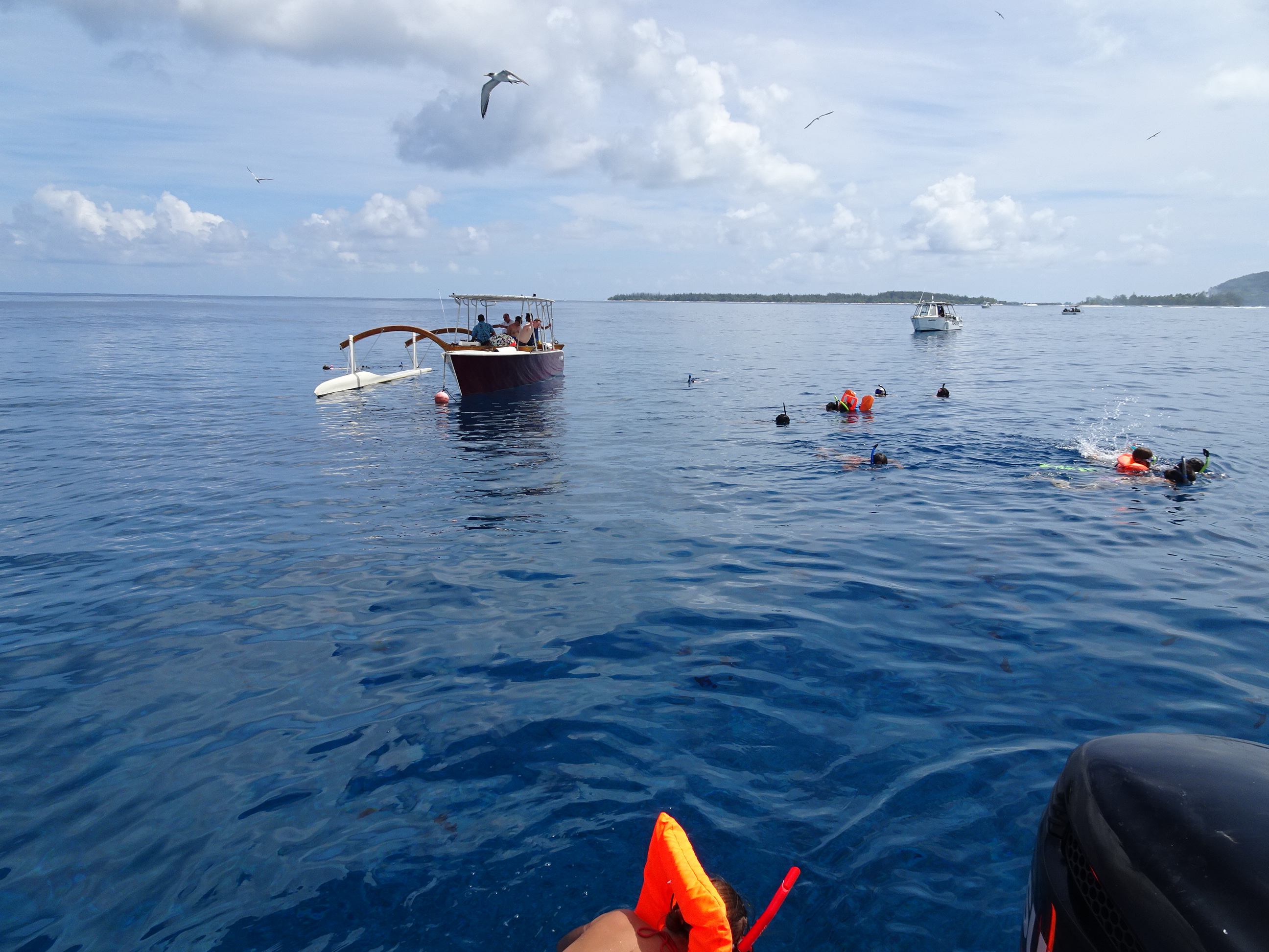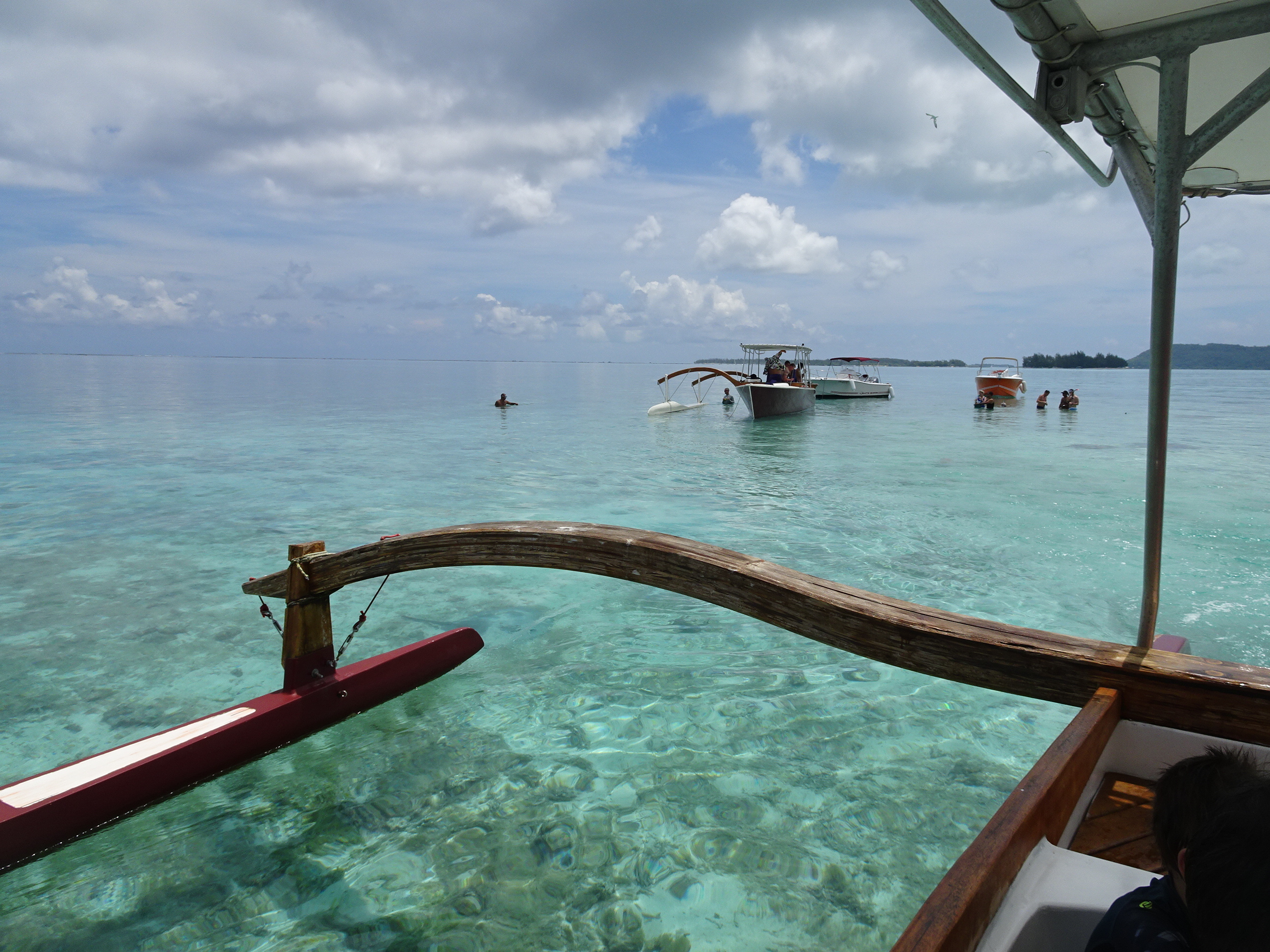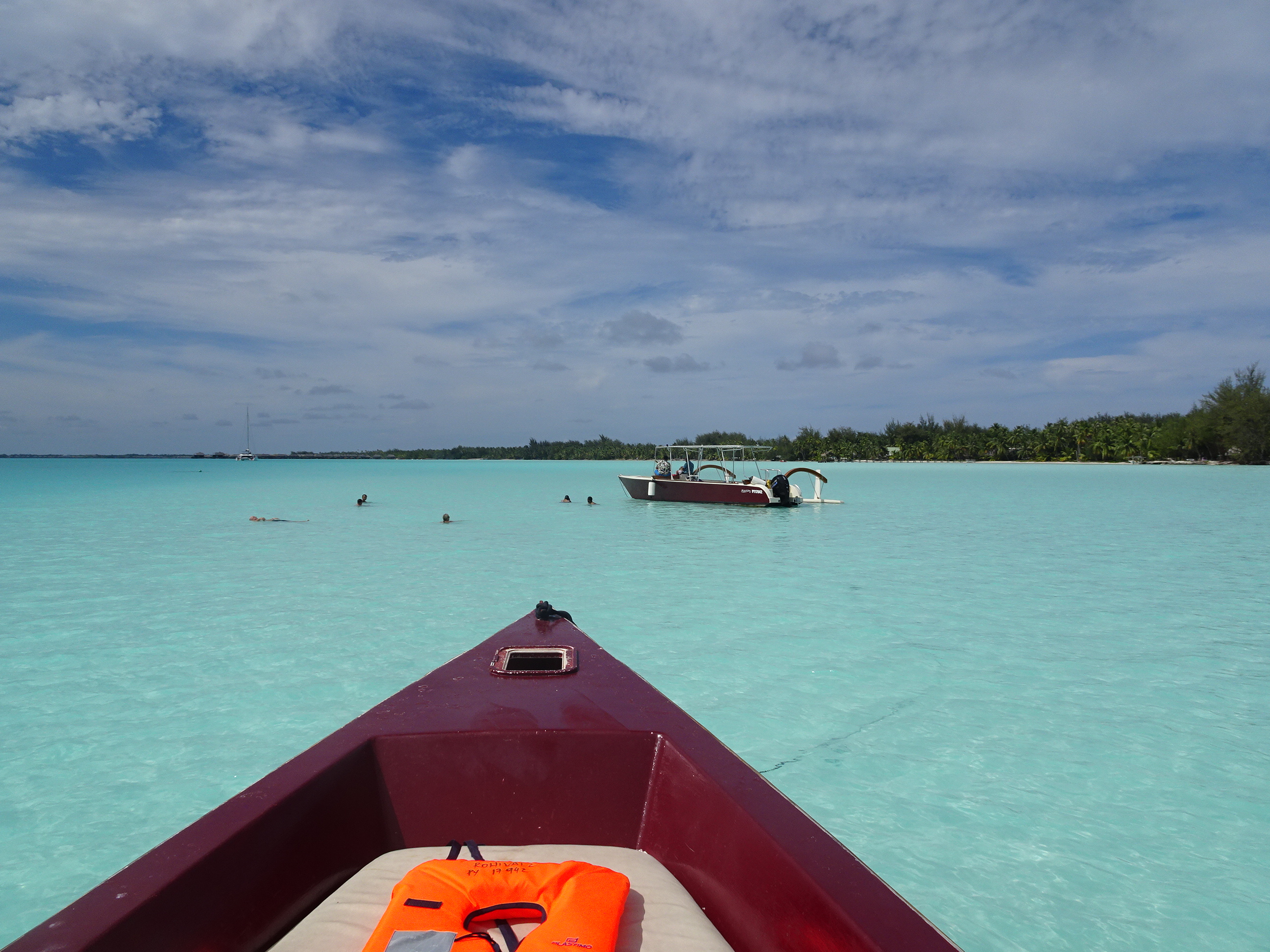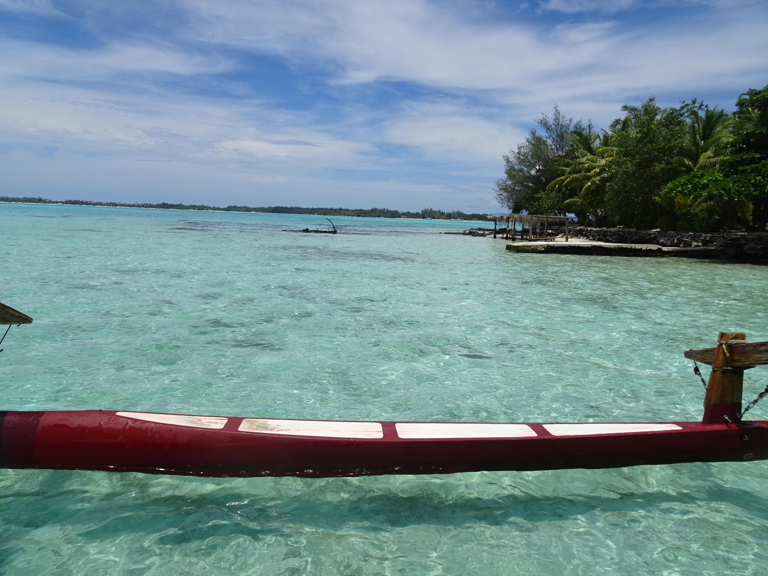 Excursia mi-a fost rezervată de gazdele mele de la pensiune de ziua anterioară. Fiind localnici pe o insulă mică unde mai toată lumea se cunoaște, mi-au găsit cea mai bună variantă, cu cel mai renumit ghid și la cel mai bun tarif. Programul excursiei era cam așa: transfer de la pensiune dimineața devreme către un ponton aproape de Matira, apoi 6 ore pe lagună cu ghid într-o barcă tradițională, incluzând aici 3 opriri pentru snorkelling, 2 opriri la plajă și un picnic la prânz pe motu, pentru a reveni după amiaza pe insulă la fix cat să prind relaxat zborul de întoarcere.