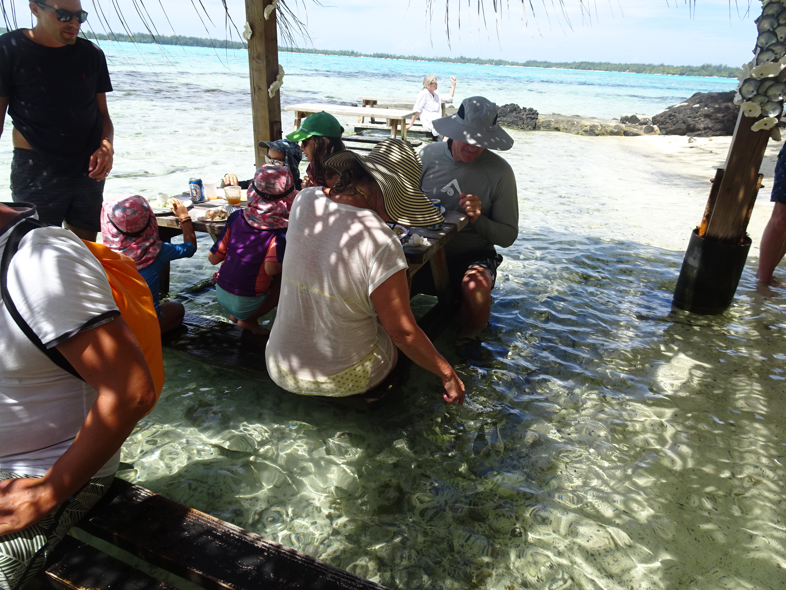 Mesele sunt la marginea plajei chiar în apă. Am servit astfel gustările cu picioarele în apă printre peștișori.