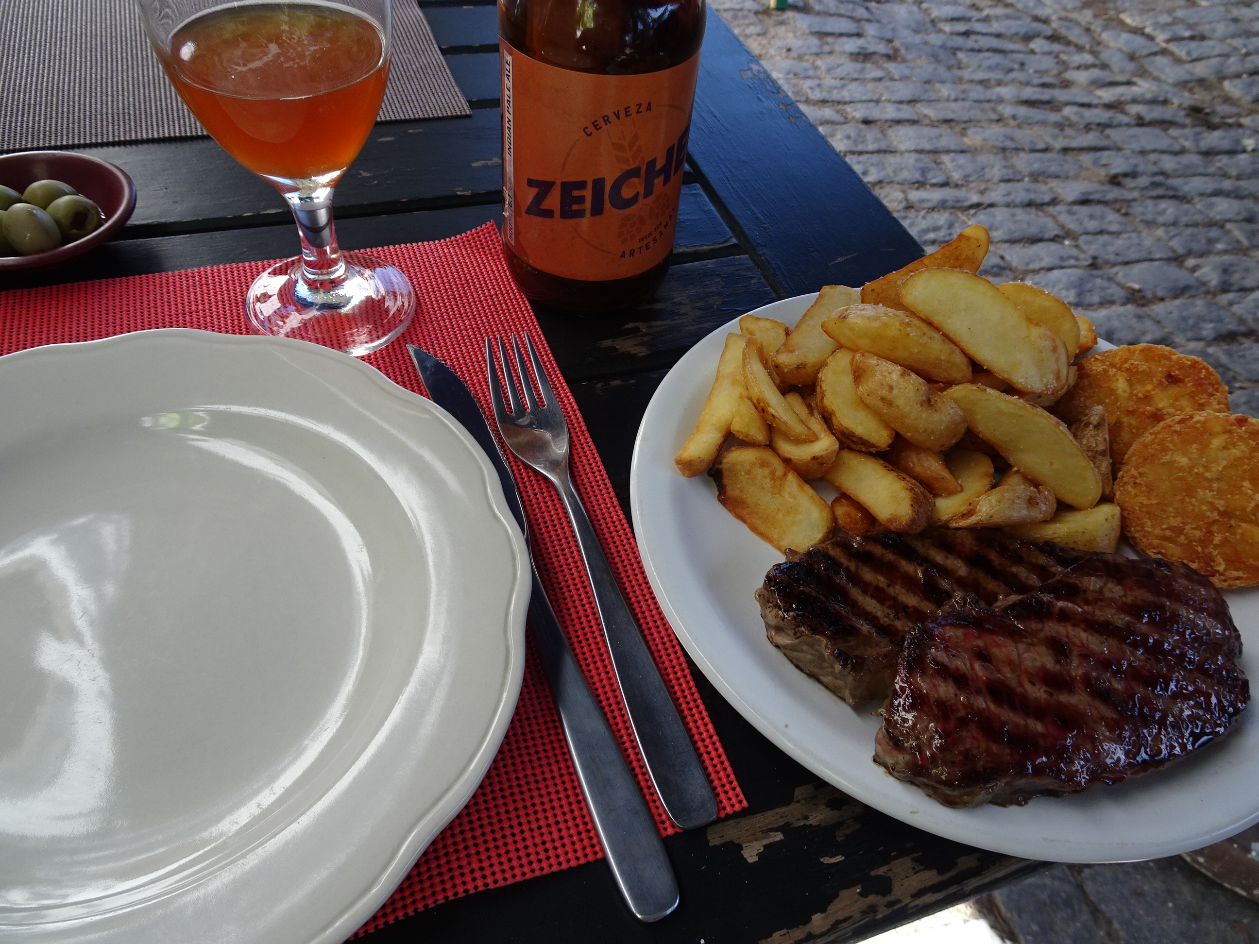 Am servit prânzul la una dintre terasele din orașul vechi. Dacă n-am apucat să gust vită argentiniană la Buenos Aires am făcut-o în Uruguay, alături de niște bere artizanală locală.