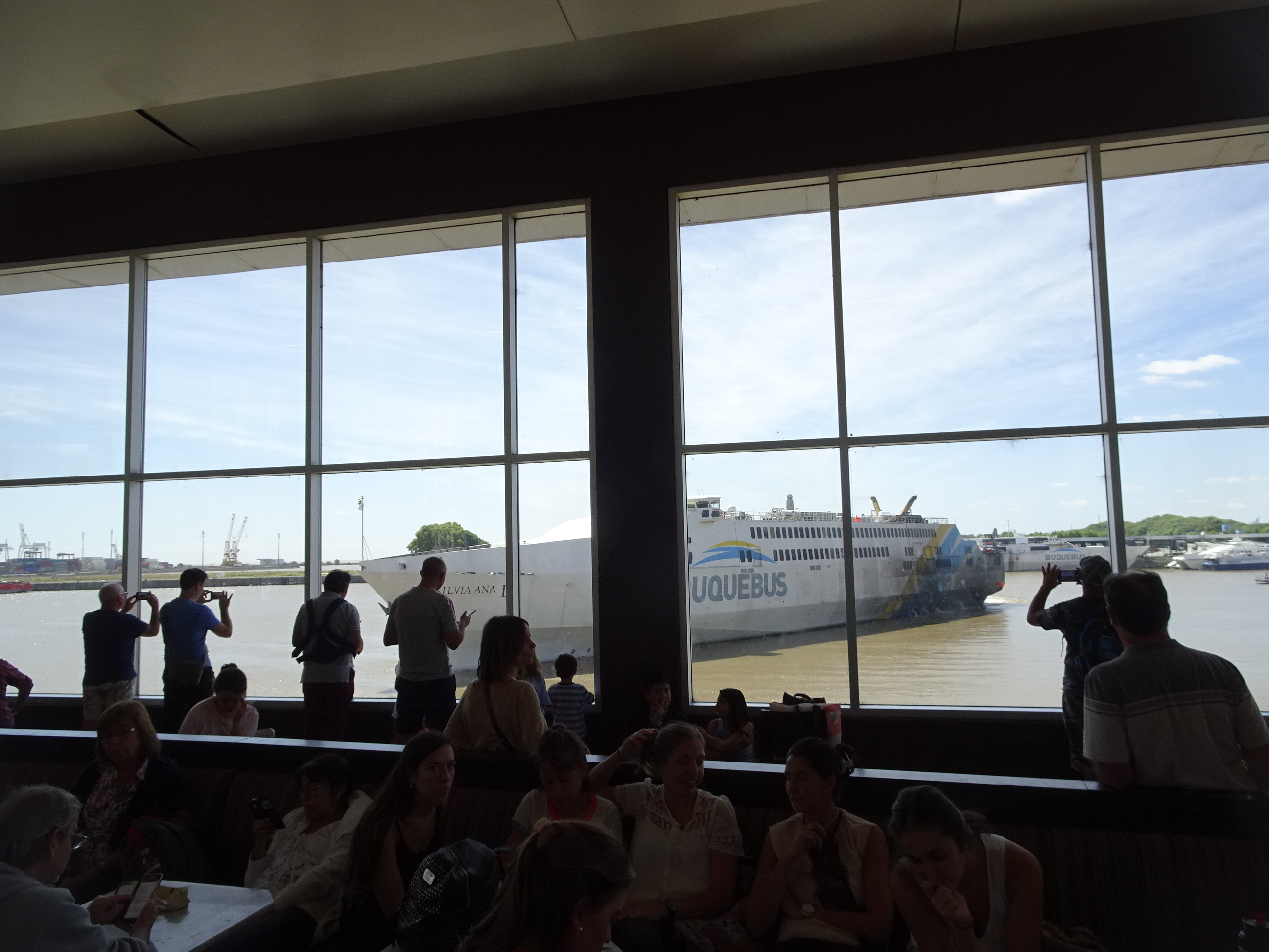 Sunt 3 companii mari care fac legătura rapidă dintre Buenos Aires și Colonia del Sacramento sau mai departe la Montevideo în Uruguay. Dintre ele rezervasem bilete online la Buquebus pentru că mi-a convenit orarul lor cel mai mult. Tariful dus-întors: 50 de dolari americani. Totul se desfășoară la fel ca pe un aeroport. După o scurtă așteptare la coadă la check-in am plecat mai departe spre controlul de securitate și la îmbarcare.