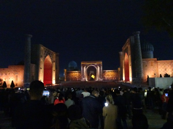 Noaptea am ieșit la masă și am avut o surpriză foarte plăcută. Am prins la Registan în direct spectacolul de sunet și lumini. Știam de acest show grandios, doar că citisem că are loc doar ocazional. Spectatorii au locuri rezervate pe scaune dar chiar dacă nu aveam rezervare am putut foarte bine urmări show-ul de pe terasă.