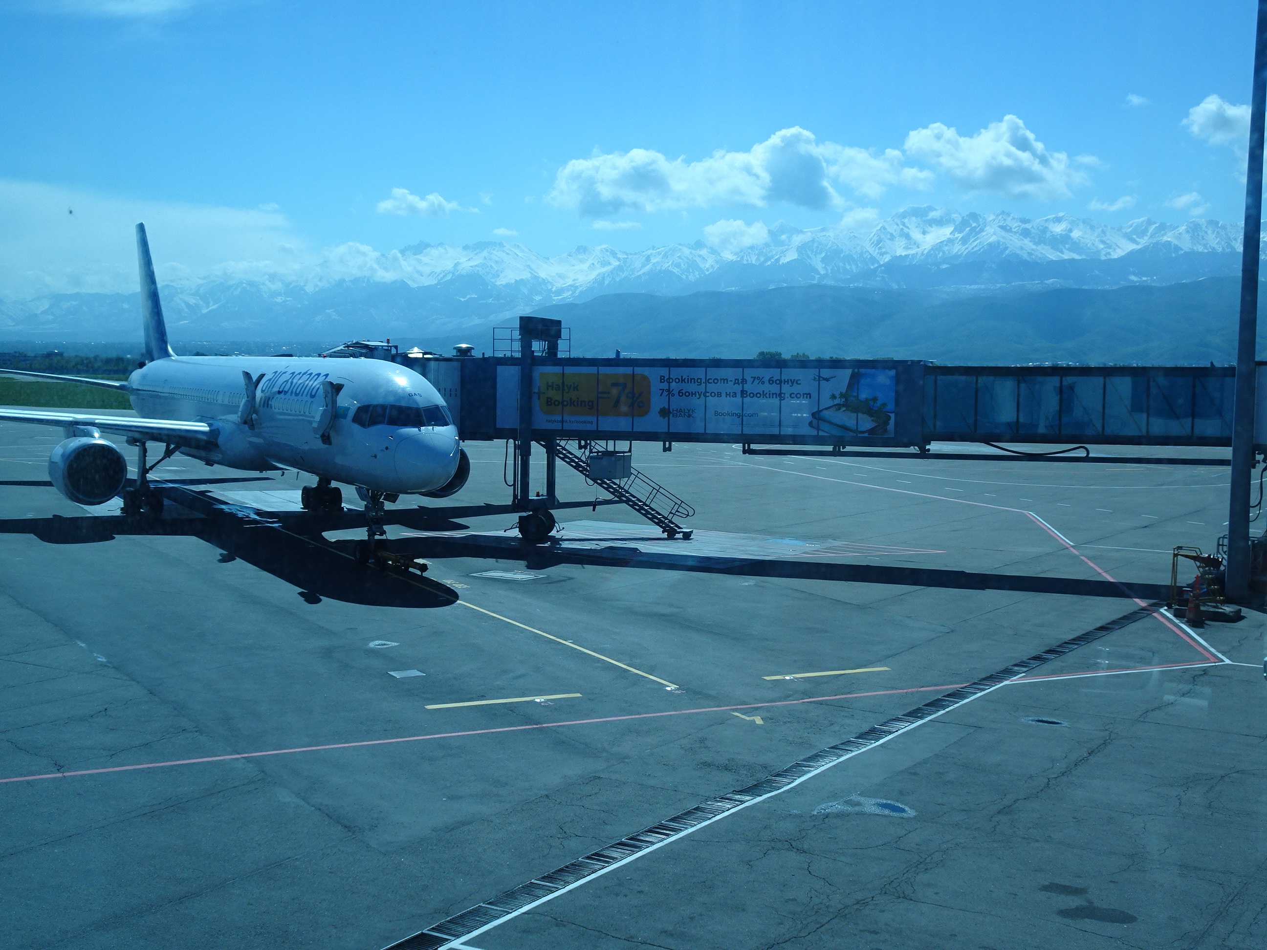 Am zburat la Almaty direct din Tashkent cu Air Astana, cea mai mare companie kazahă. Încă de la aterizare am văzut minunatul peisaj montan de care se bucură orașul. Almaty se află în sudul Kazahstan, aproape de granița kirghiză și de munții Tian Shan care depășesc 7000 de metri înălțime. Într-o zi senină vederile din Almaty sunt superbe.