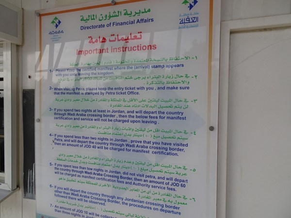 Viza normală de Iordania costă 40 de dinari (JOD) dacă se obține la aeroport. Foarte mult, ținând cont că 1 JOD = 1,3 Euro. Alte puncte de trecere au fiecare condițiile lor. Vama dintre Eilat și Aqaba este una din cele mai complicate ca reguli, făcute special de iordanieni pentru a „fura” turiștii străini care sosesc la Eilat.