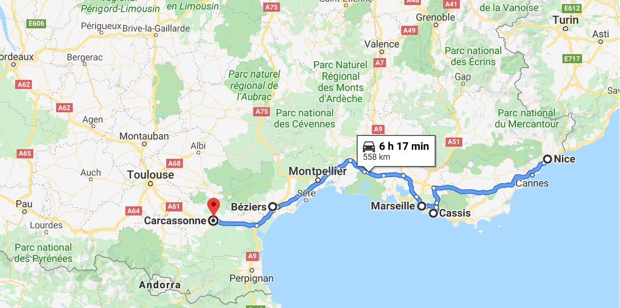 Urma un traseu lung de condus. Prima parte de drum a fost seara de la Nisa la Cassis unde am înnoptat. Apoi după vizita la Cassis și Marseille, urma un drum și mai lung, până la Carcassone.