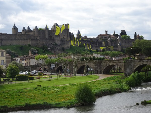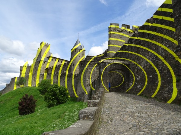 După ce am parcurs cetatea de la un capăt la altul, am ajuns la Port d’Aude. Acolo am găsit o decorație impresionantă pe ziduri realizată din cercuri concentrice galbene. E vorba de proiectul „Concentric eccentric” creat pentru a sărbători 20 de ani de patrimoniu mondial al cetății. Evident, nu fusese vopsită cetatea, ci fusese aplicat un adeziv temporar din bandă galbenă ce crea o iluzie foarte interesantă.