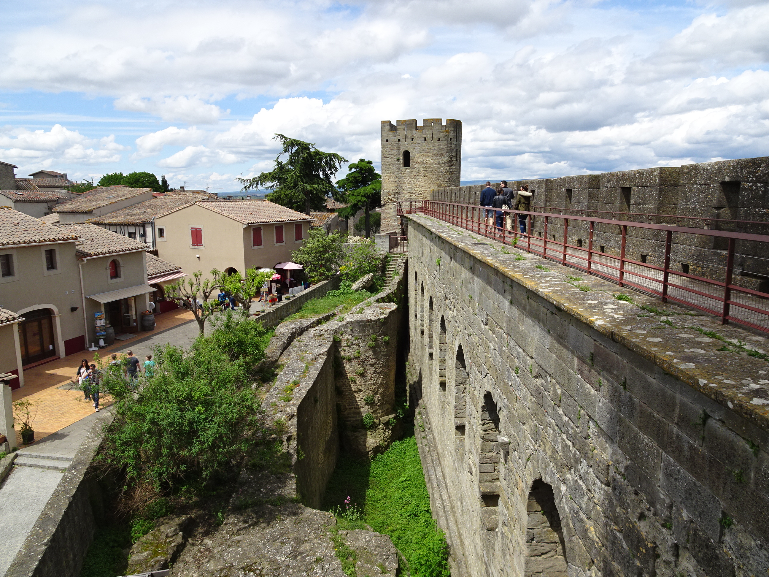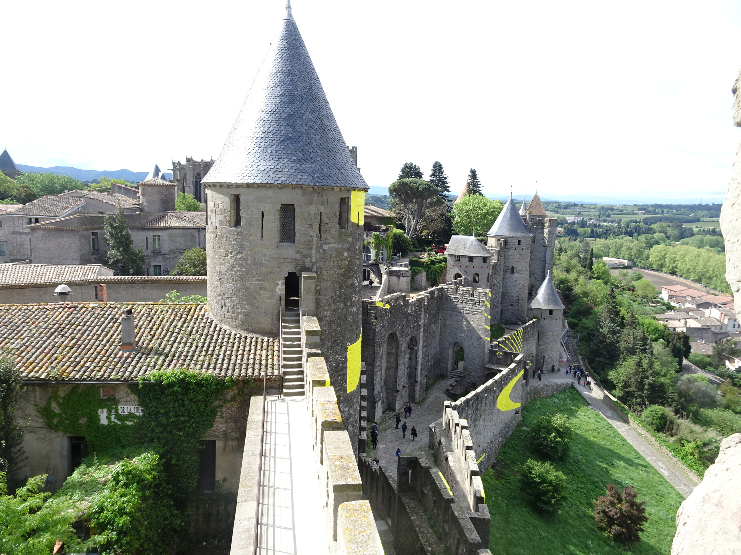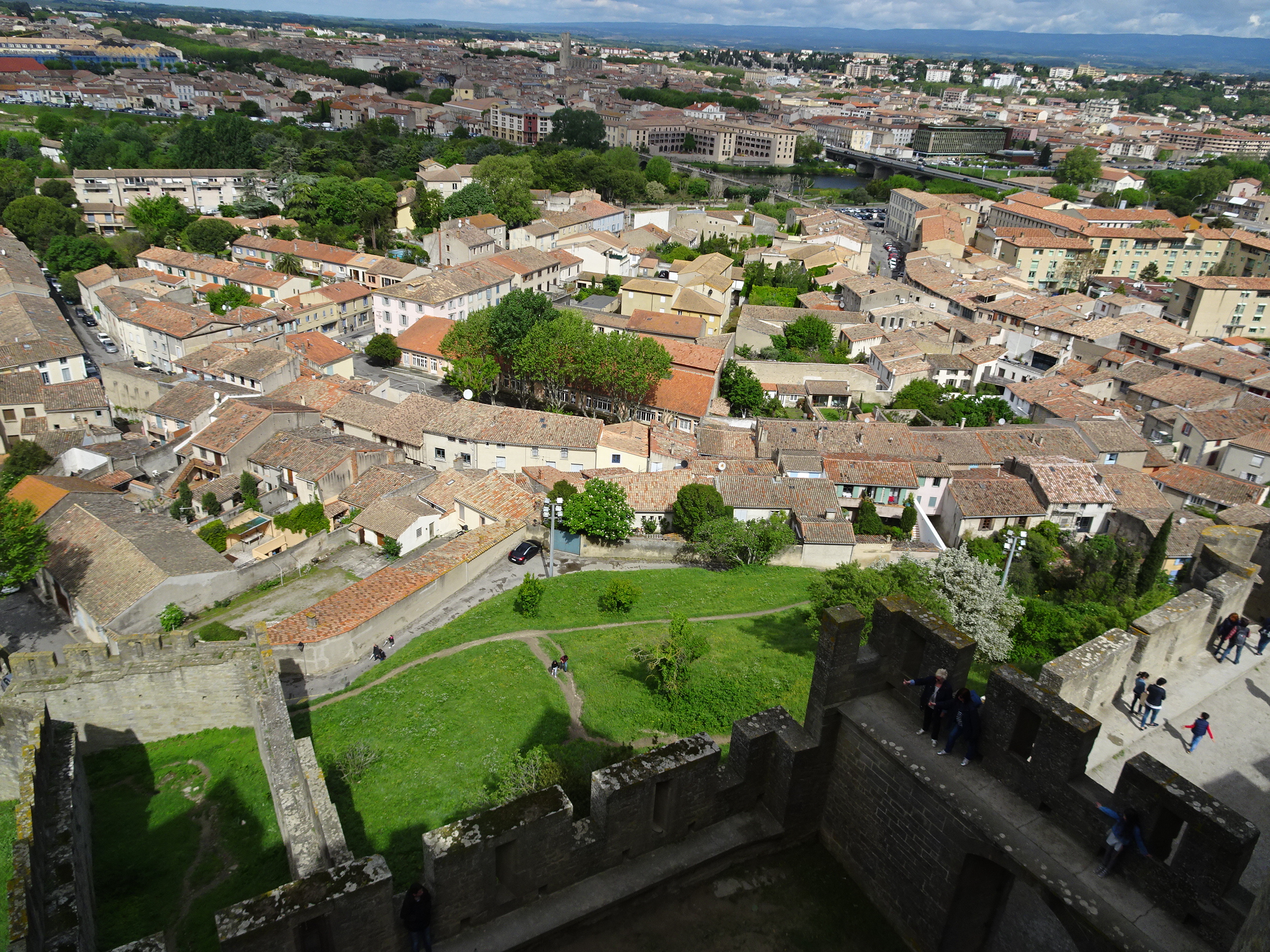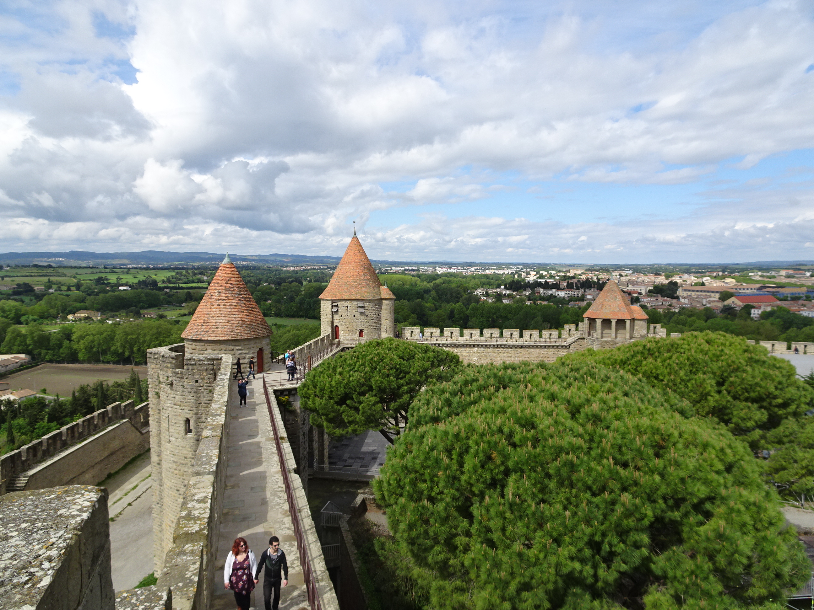 Am mers pe ziduri cam o oră trecând prin zeci de turnuri. Tot traseul a fost plin de priveliști grozave peste casele și bisericile din cetate, dar și peste orașul nou din vale și dealurile înconjurătoare. Am mai vizitat catedrala Saints Nazaire et Celse, amfiteatrul medieval transformat în sală de spectacole și primăria îmbrăcată complet în plante agățătoare.