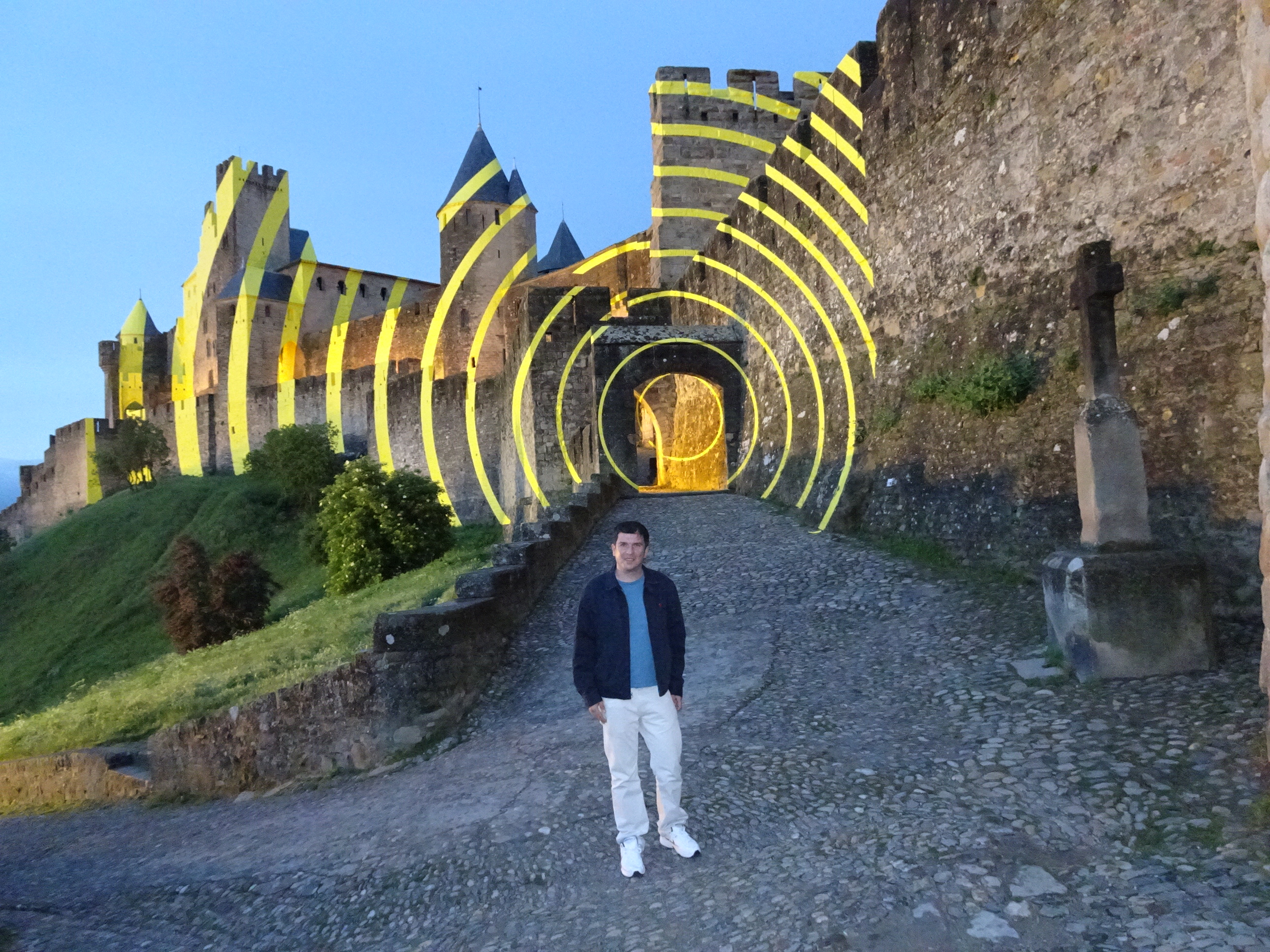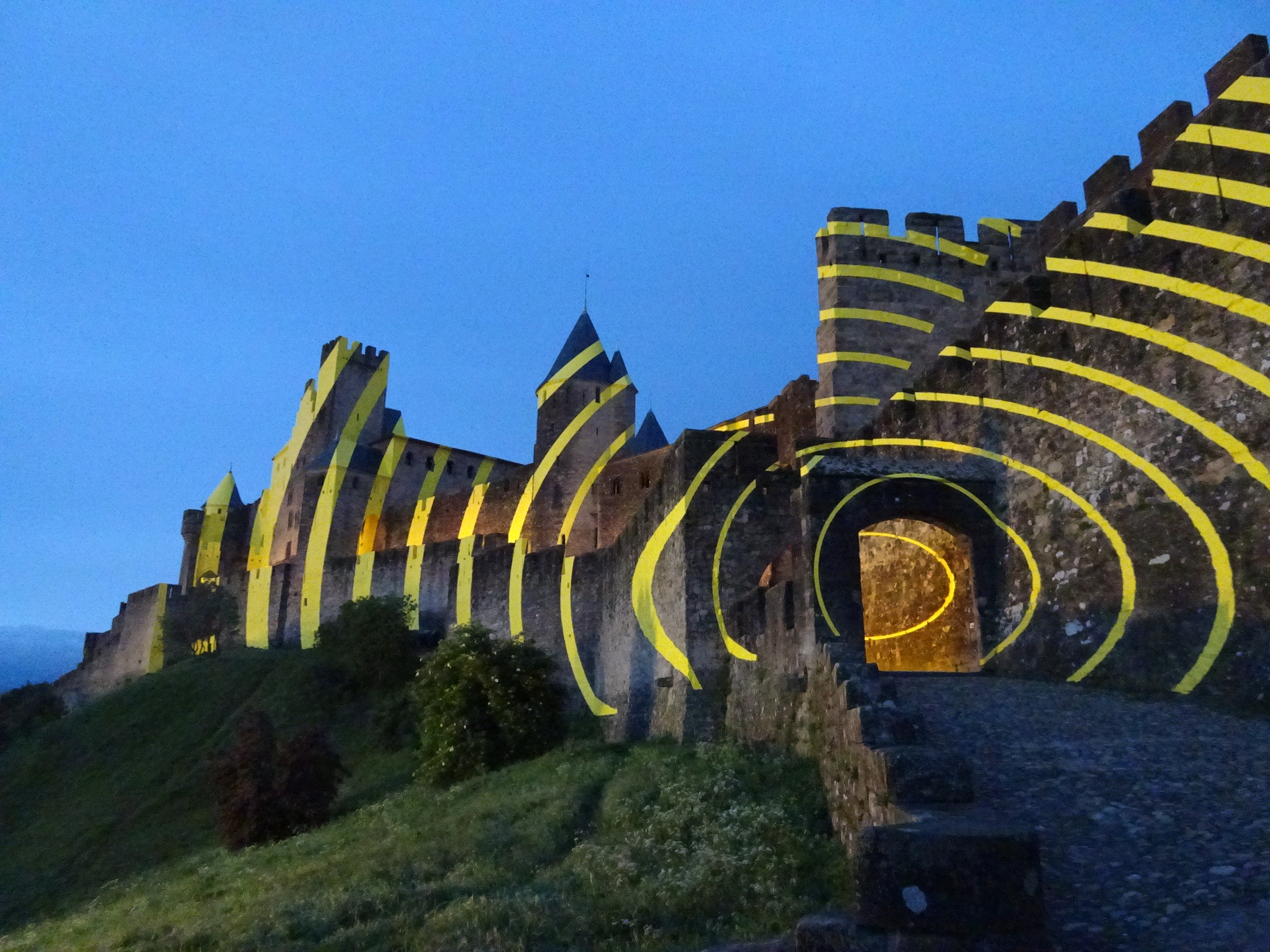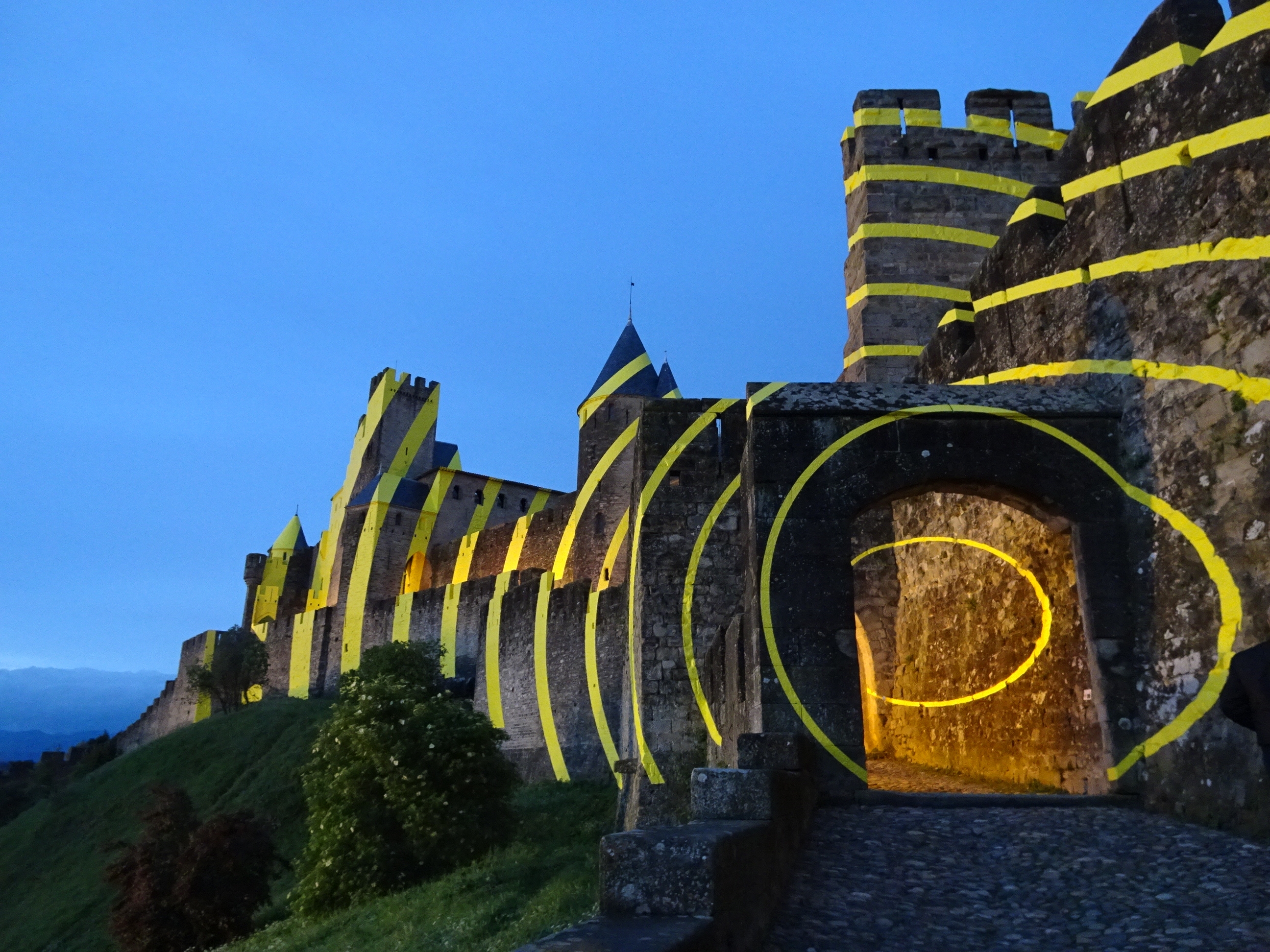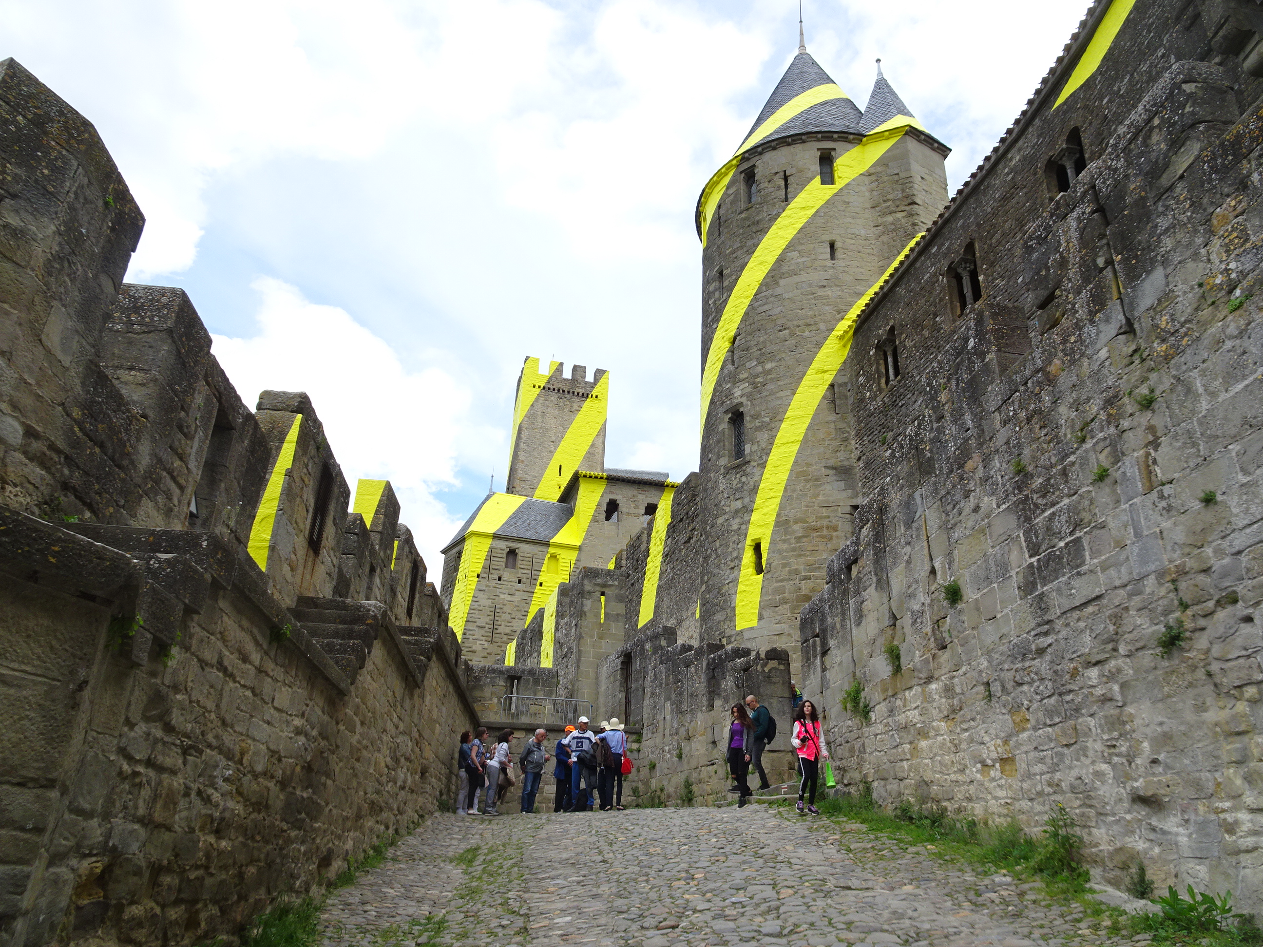 După ce am parcurs cetatea de la un capăt la altul, am ajuns la Port d’Aude. Acolo am găsit o decorație impresionantă pe ziduri realizată din cercuri concentrice galbene. E vorba de proiectul „Concentric eccentric” creat pentru a sărbători 20 de ani de patrimoniu mondial al cetății. Evident, nu fusese vopsită cetatea, ci fusese aplicat un adeziv temporar din bandă galbenă ce crea o iluzie foarte interesantă.