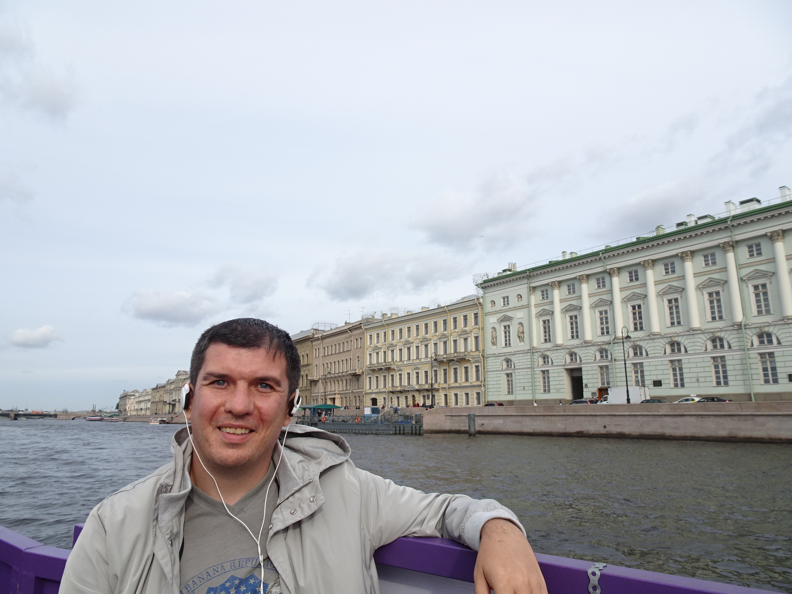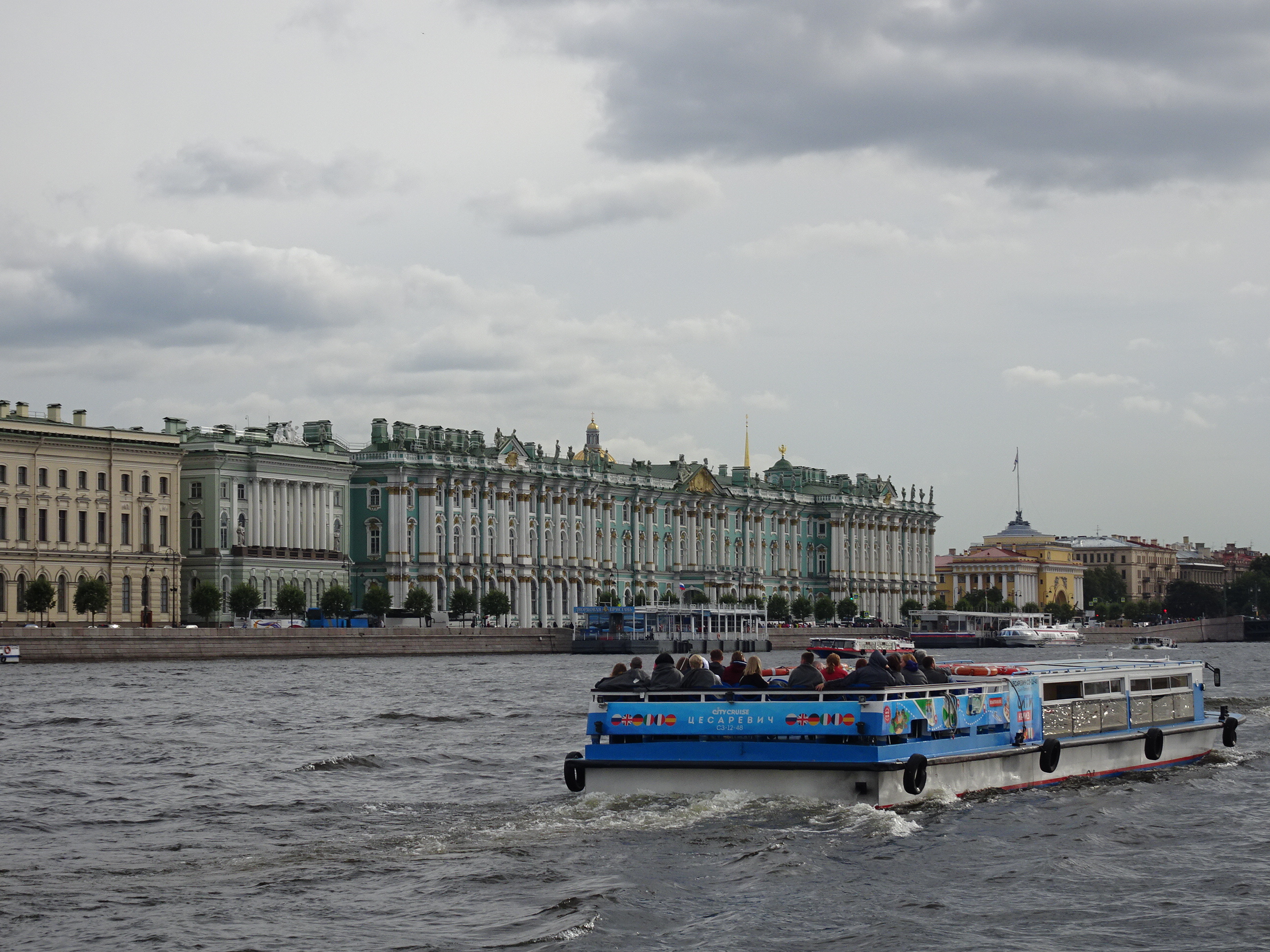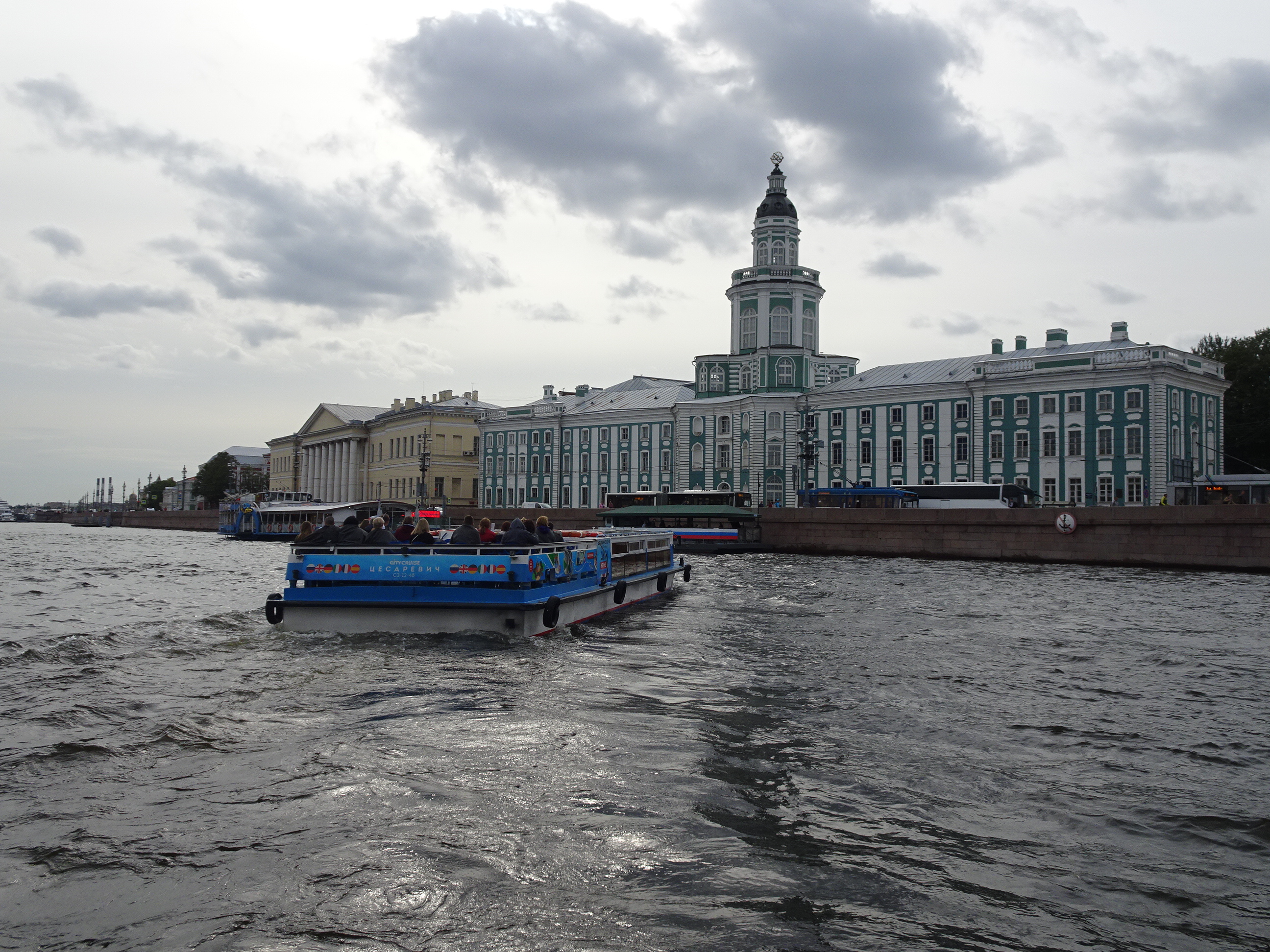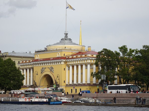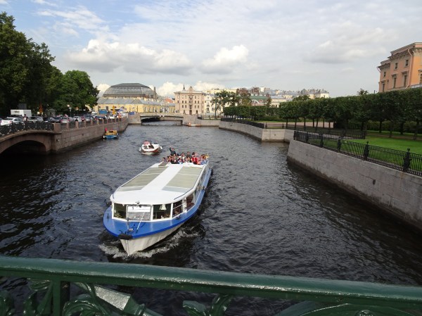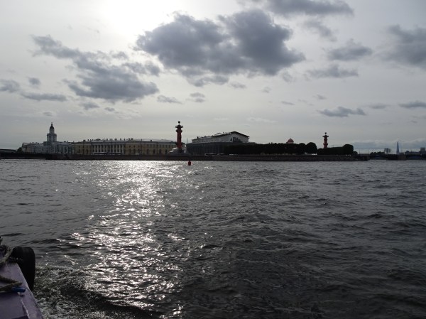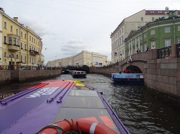 Ne-am gândit că cel mai bun mod pentru o primă vedere a centrului este de pe apă. Sunt 300 de kilometri de canale artificiale și peste 330 de poduri la Sankt Petersburg. O croazieră pe acestea este una dintre experiențele de neratat. Am mers așadar la unul dintre debarcadere (sunt multe prin tot centrul) și am plecat la plimbare pe canale. Am avut audio-ghid în engleză, astfel că pe durata turului de o oră am putut afla multe lucruri interesante. Am trecut pe lângă palate și vile luxoase, pe lângă faimosul muzeu Hermitage iar apoi am ieșit în larg pe Neva. Acolo, vederile sunt absolut uimitoare. Râul Neva pornește din Lacul Ladoga și se varsă apoi în Marea Baltică. Deși străbate doar 75 de kilometri, ca debit este unul din cele mai mari din Europa. Am continuat croaziera pe lângă insula Petru și Pavel unde s-a construit prima fortificație a lui Petru cel Mare, apoi pe lângă marele port naval pentru a reveni în apropiere de bulevardul Nevsky.
