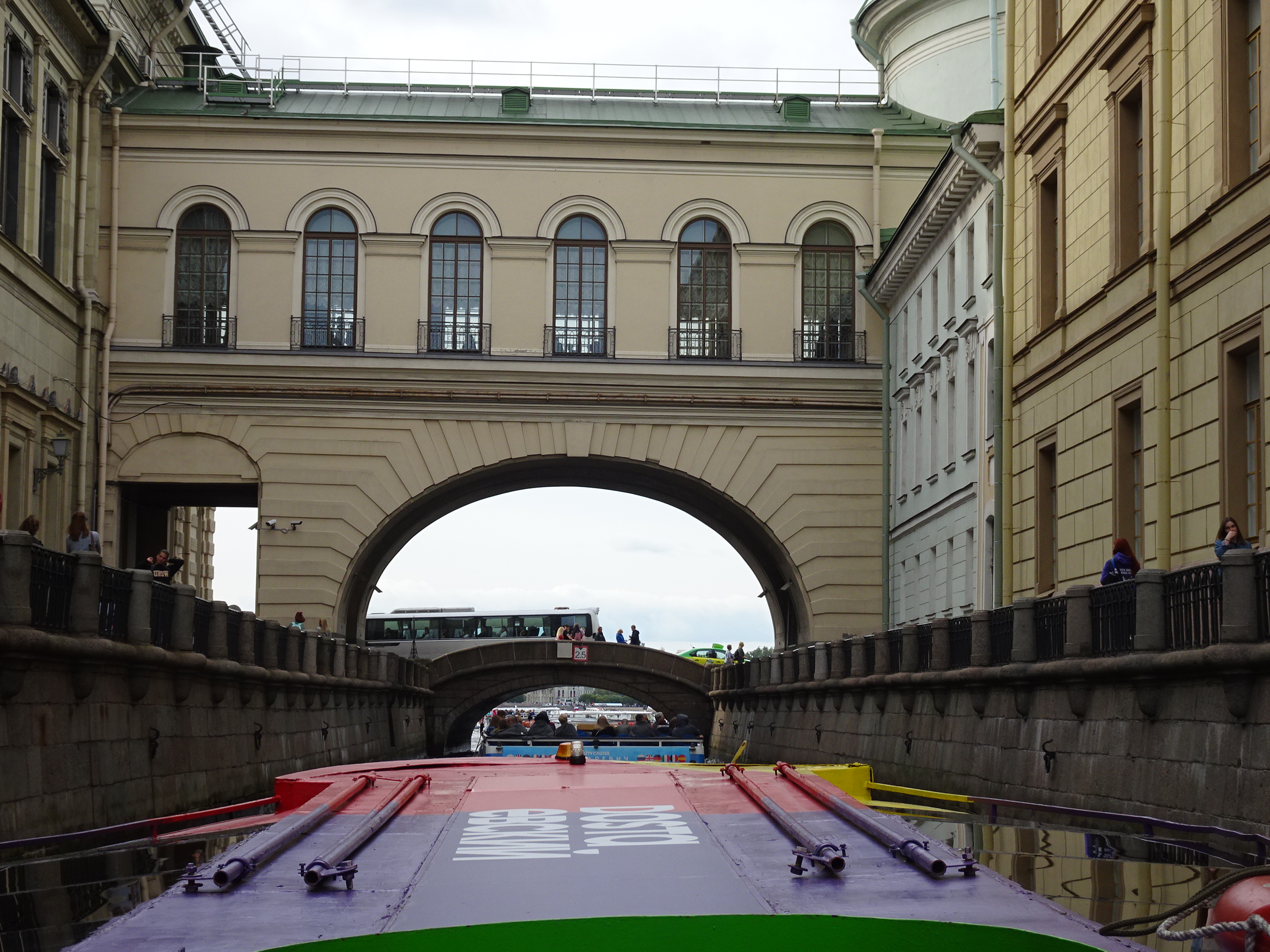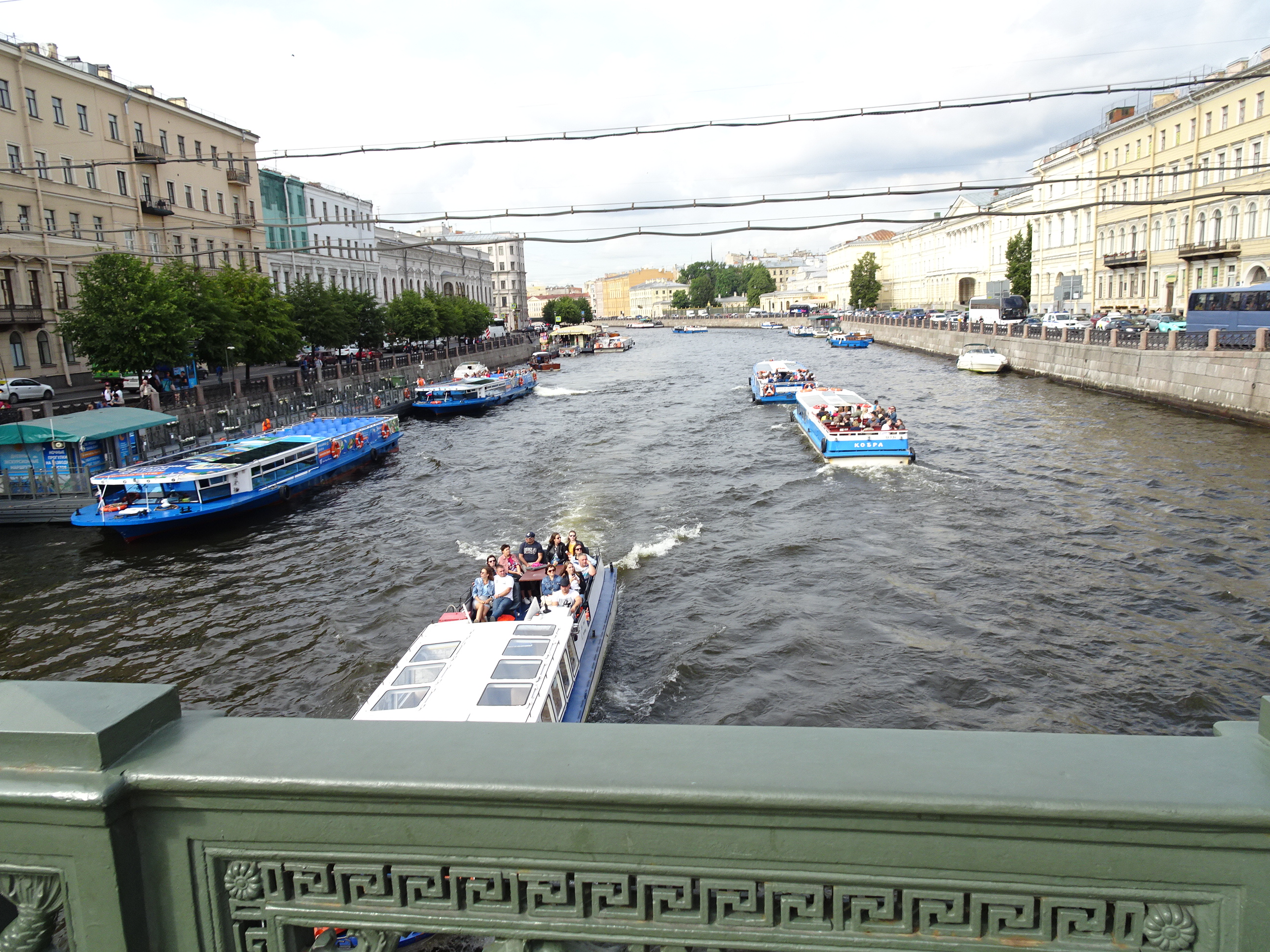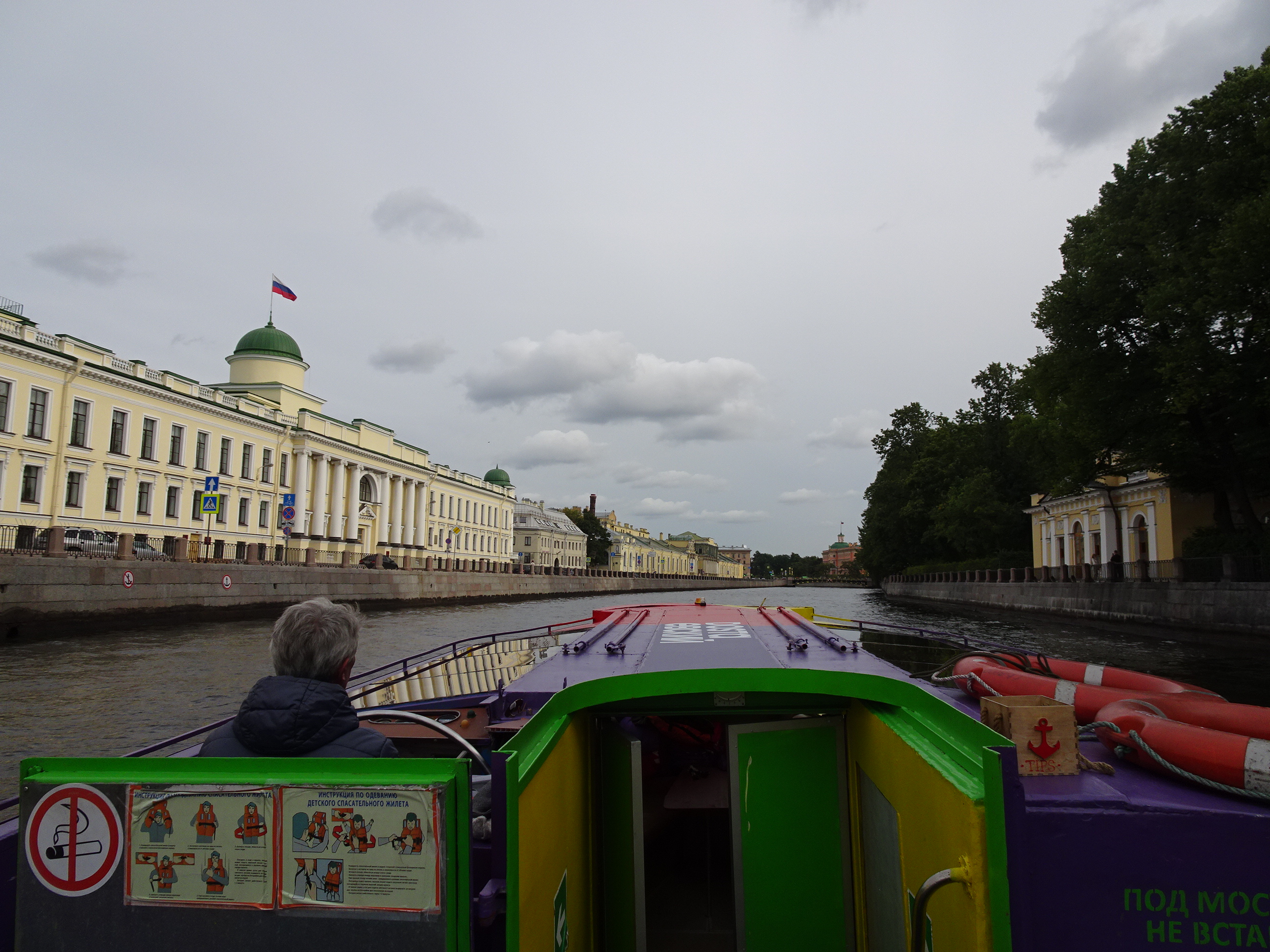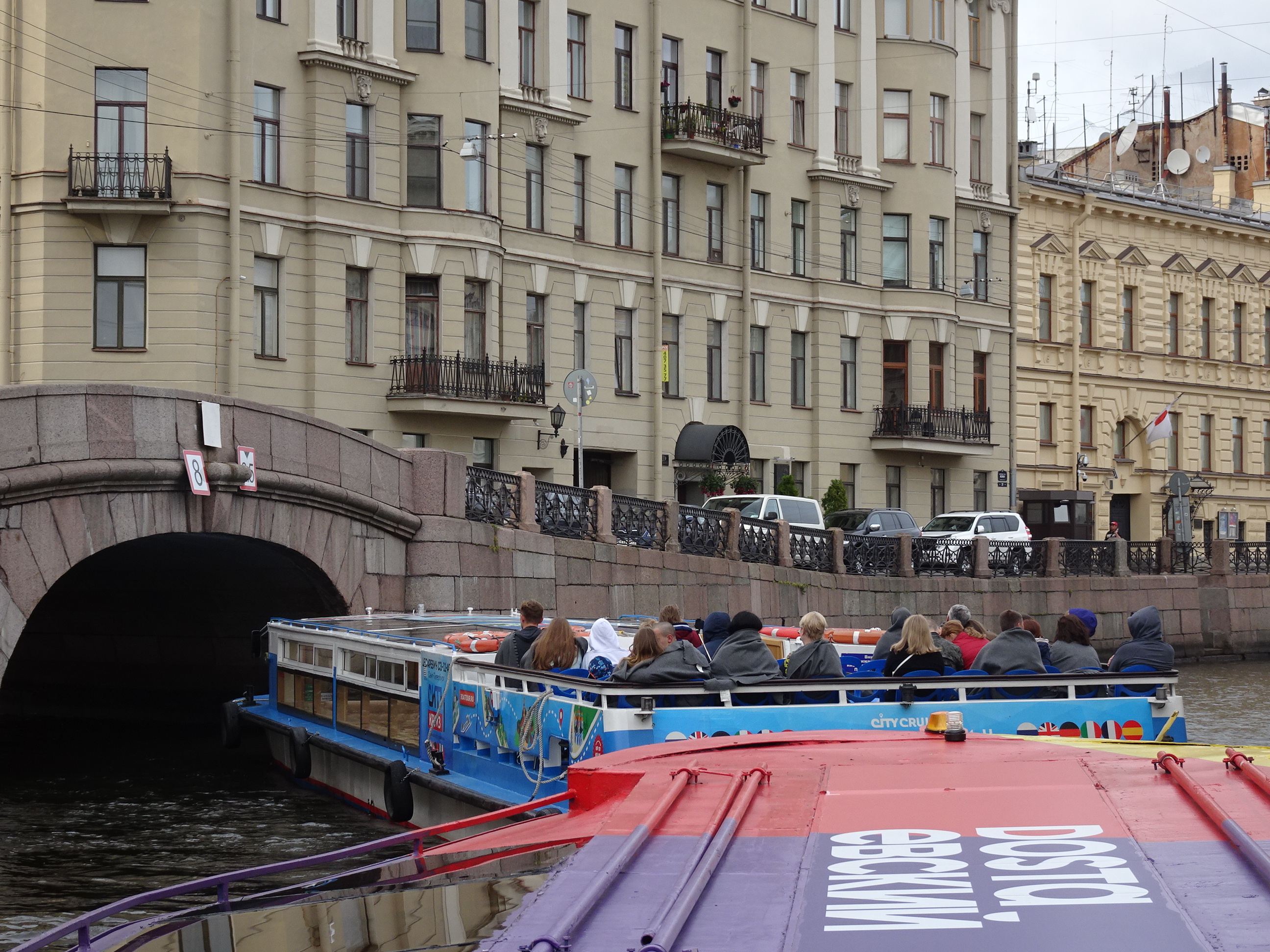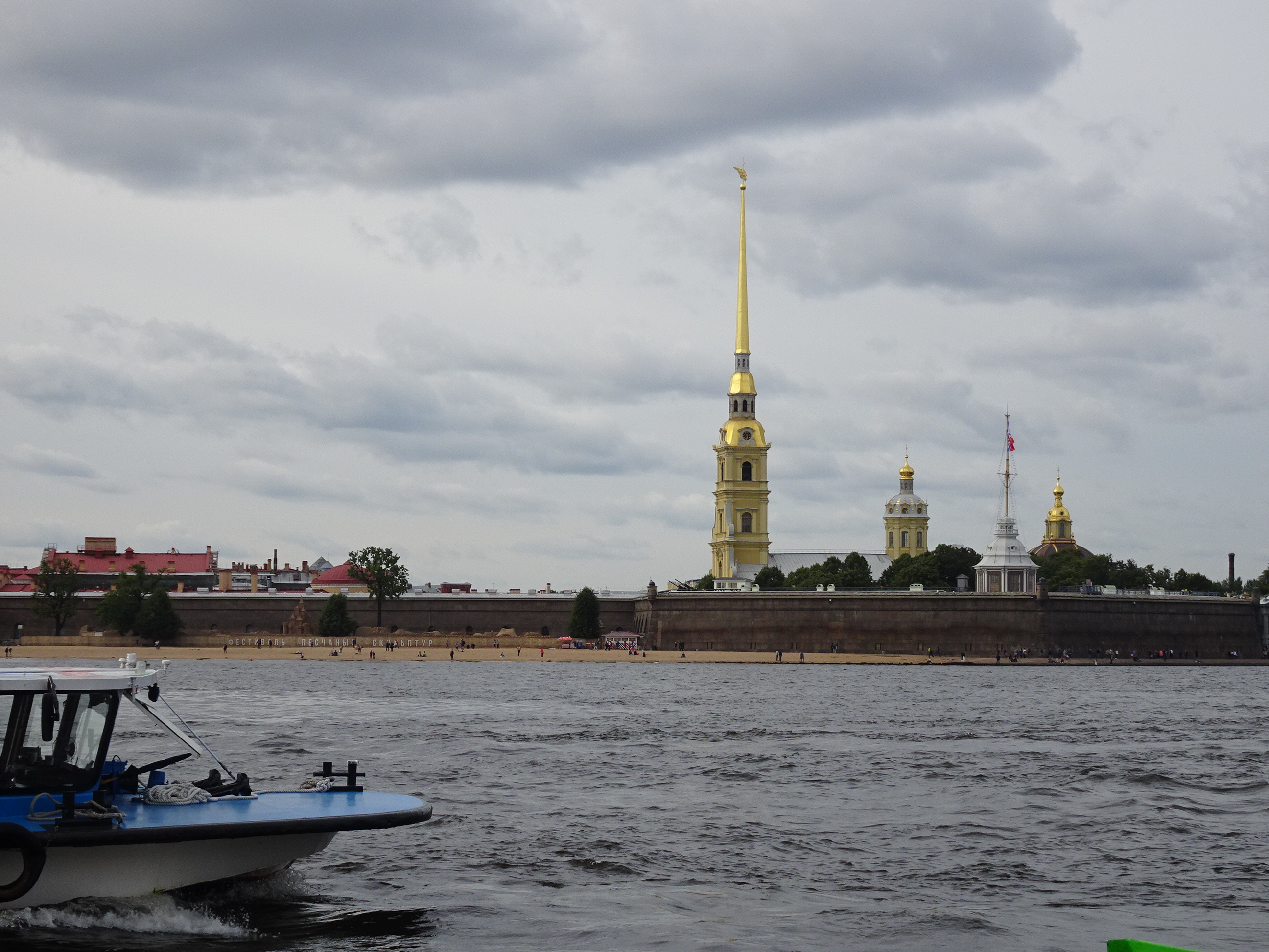 Ne-am gândit că cel mai bun mod pentru o primă vedere a centrului este de pe apă. Sunt 300 de kilometri de canale artificiale și peste 330 de poduri la Sankt Petersburg. O croazieră pe acestea este una dintre experiențele de neratat. Am mers așadar la unul dintre debarcadere (sunt multe prin tot centrul) și am plecat la plimbare pe canale. Am avut audio-ghid în engleză, astfel că pe durata turului de o oră am putut afla multe lucruri interesante. Am trecut pe lângă palate și vile luxoase, pe lângă faimosul muzeu Hermitage iar apoi am ieșit în larg pe Neva. Acolo, vederile sunt absolut uimitoare. Râul Neva pornește din Lacul Ladoga și se varsă apoi în Marea Baltică. Deși străbate doar 75 de kilometri, ca debit este unul din cele mai mari din Europa. Am continuat croaziera pe lângă insula Petru și Pavel unde s-a construit prima fortificație a lui Petru cel Mare, apoi pe lângă marele port naval pentru a reveni în apropiere de bulevardul Nevsky.