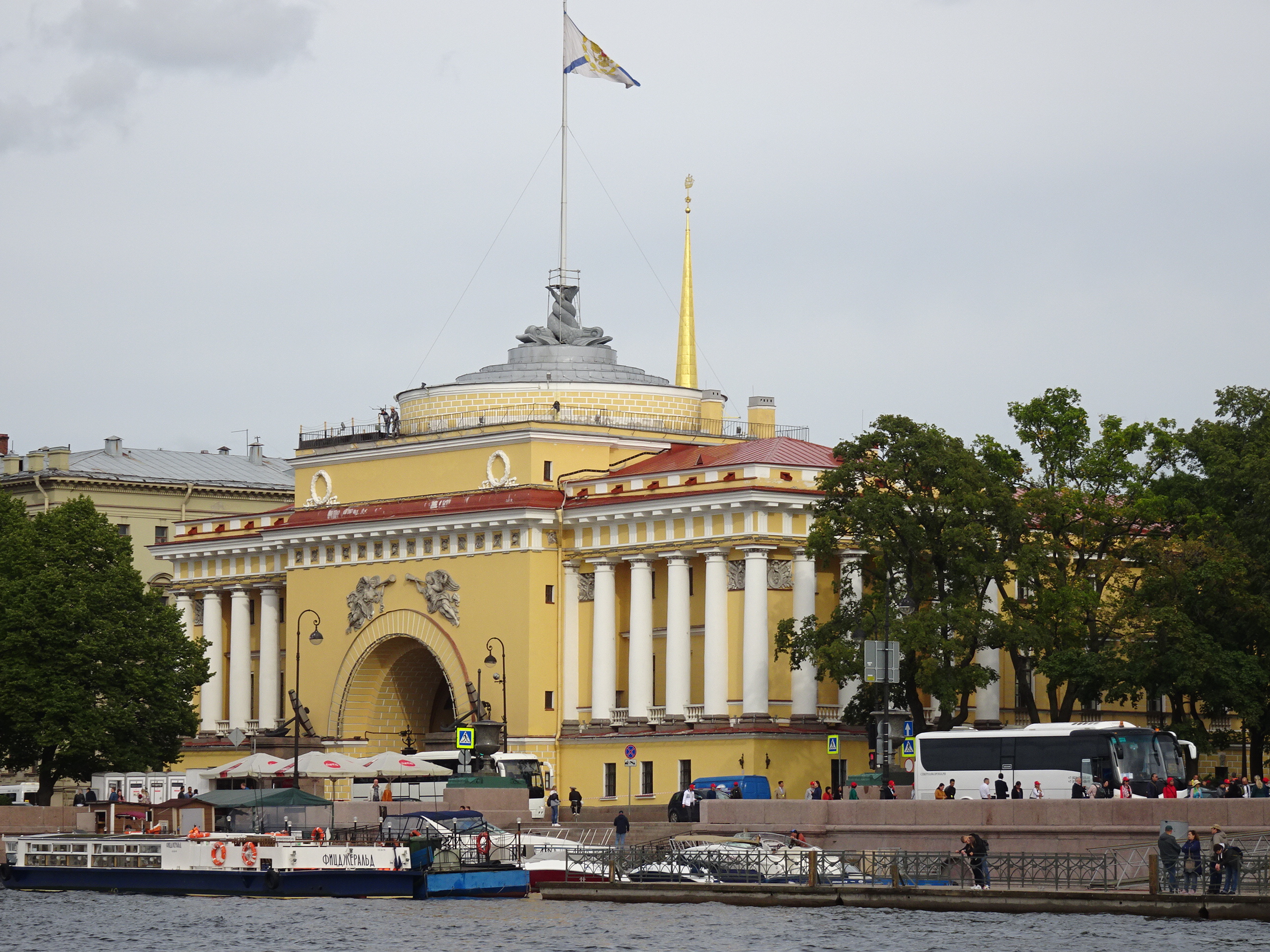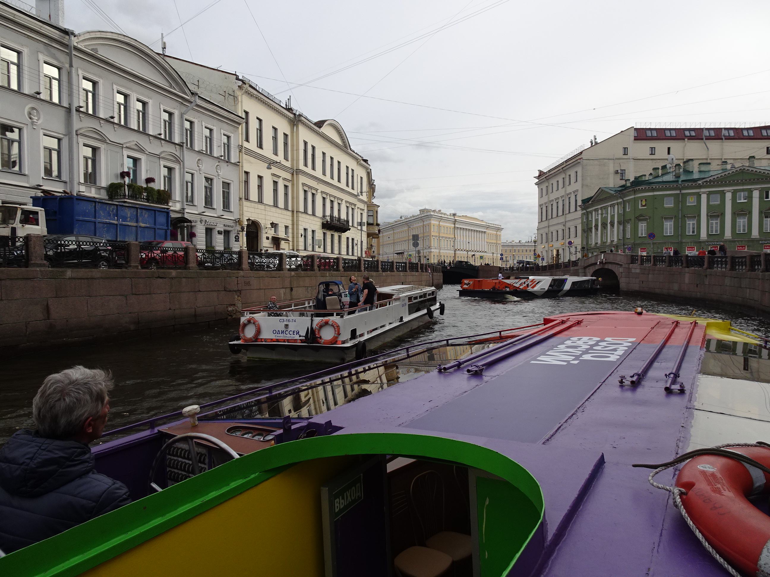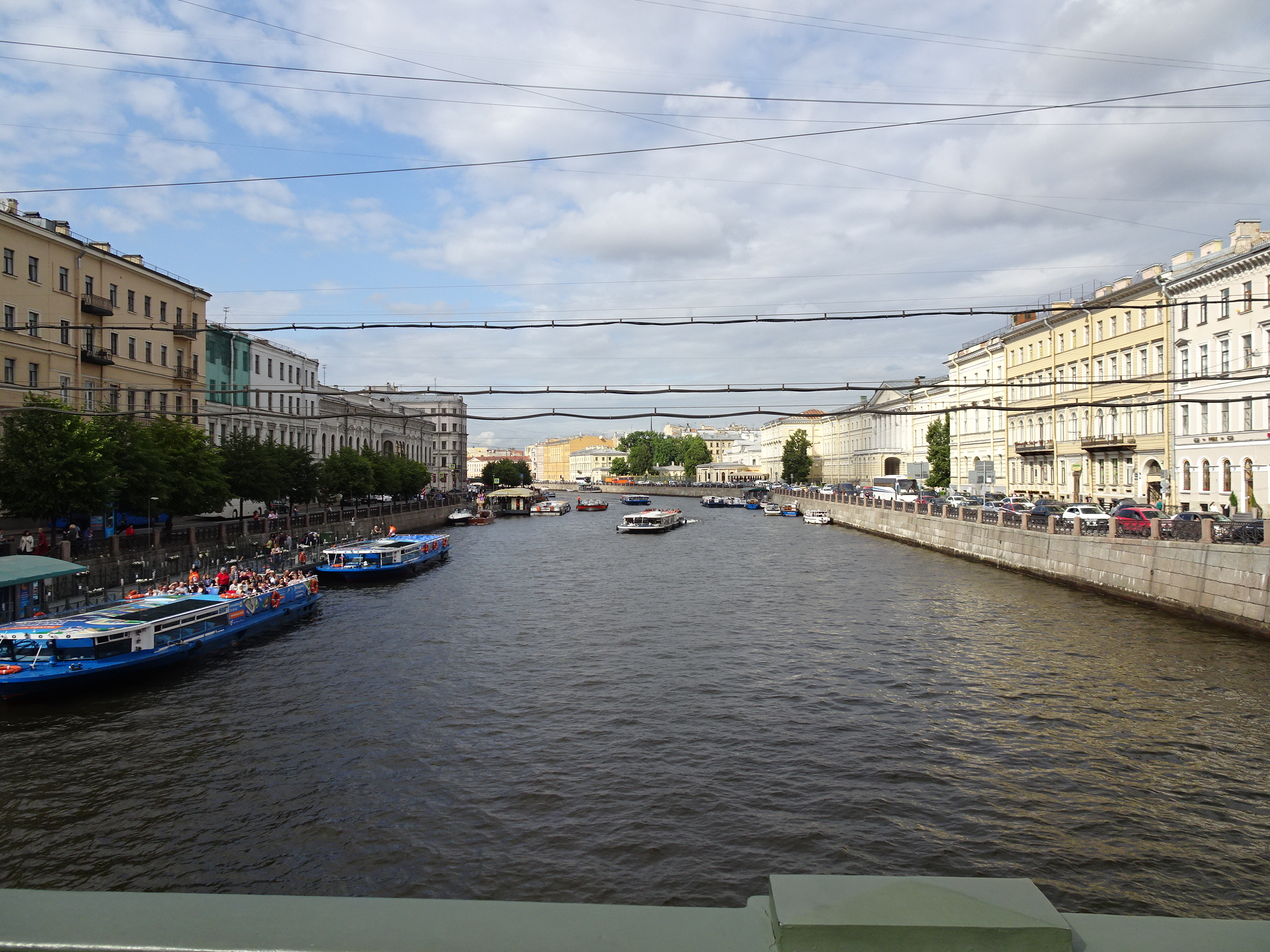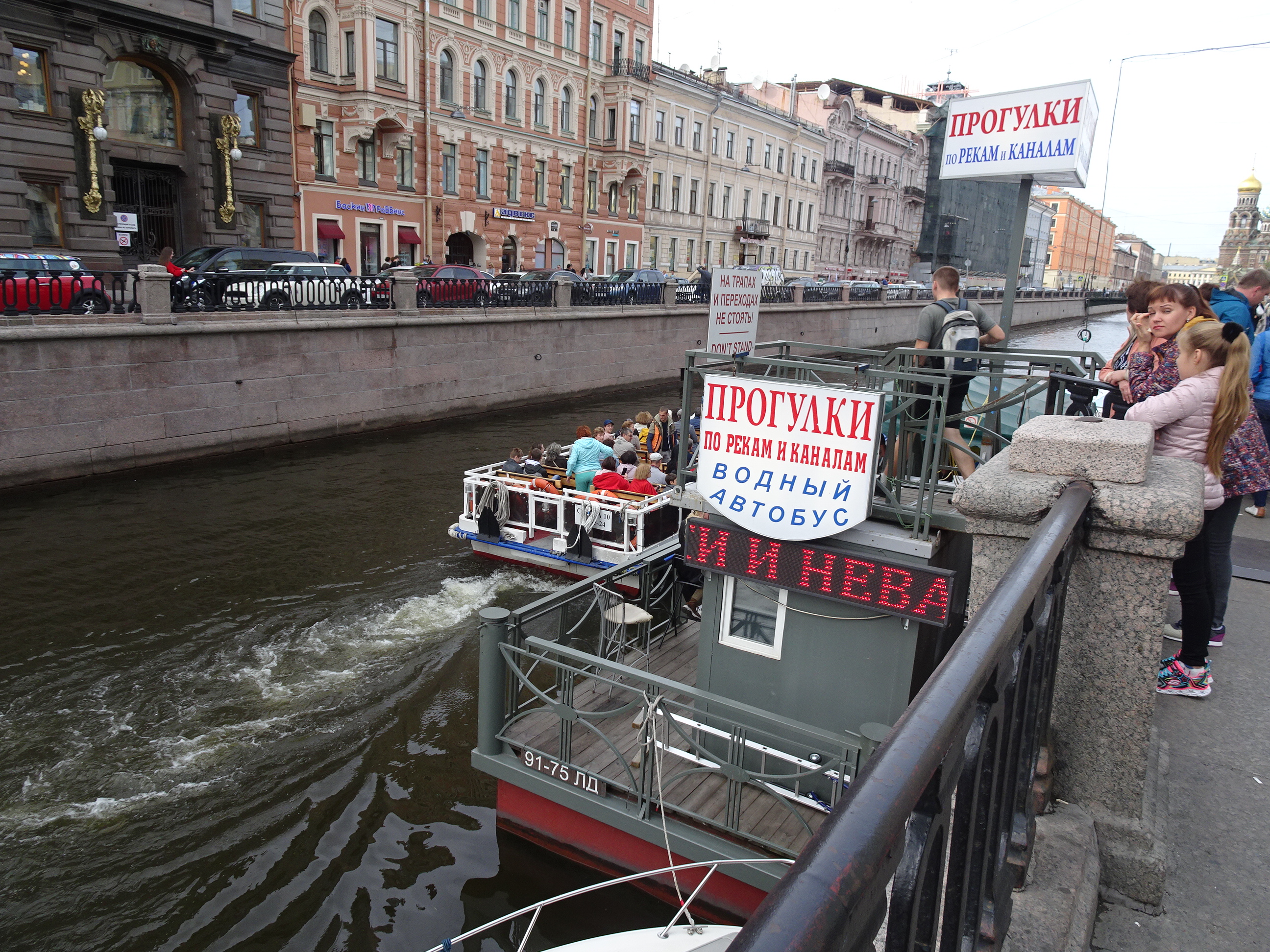 Ne-am gândit că cel mai bun mod pentru o primă vedere a centrului este de pe apă. Sunt 300 de kilometri de canale artificiale și peste 330 de poduri la Sankt Petersburg. O croazieră pe acestea este una dintre experiențele de neratat. Am mers așadar la unul dintre debarcadere (sunt multe prin tot centrul) și am plecat la plimbare pe canale. Am avut audio-ghid în engleză, astfel că pe durata turului de o oră am putut afla multe lucruri interesante. Am trecut pe lângă palate și vile luxoase, pe lângă faimosul muzeu Hermitage iar apoi am ieșit în larg pe Neva. Acolo, vederile sunt absolut uimitoare. Râul Neva pornește din Lacul Ladoga și se varsă apoi în Marea Baltică. Deși străbate doar 75 de kilometri, ca debit este unul din cele mai mari din Europa. Am continuat croaziera pe lângă insula Petru și Pavel unde s-a construit prima fortificație a lui Petru cel Mare, apoi pe lângă marele port naval pentru a reveni în apropiere de bulevardul Nevsky.