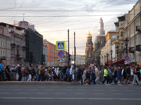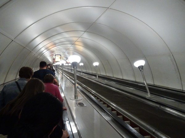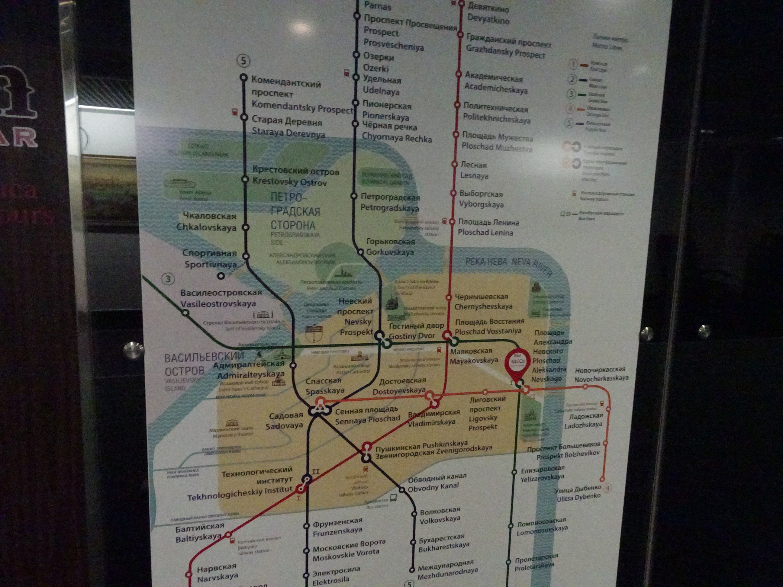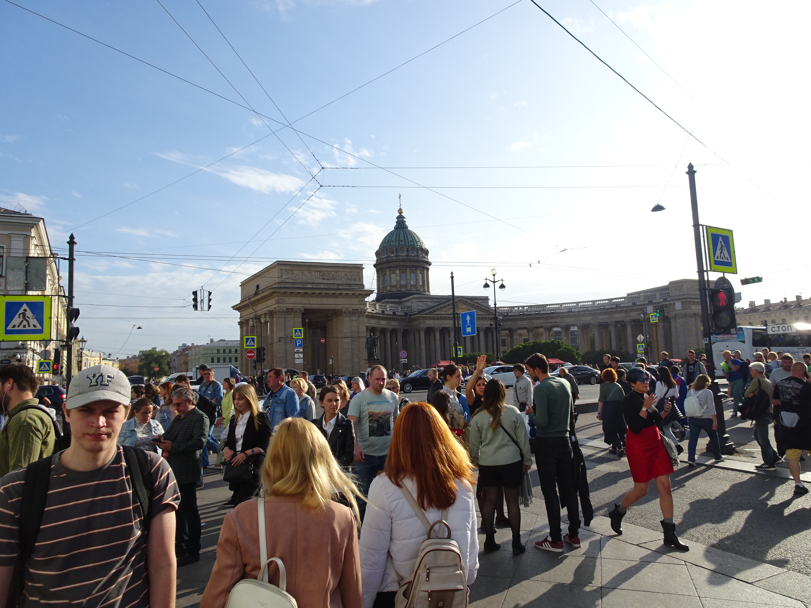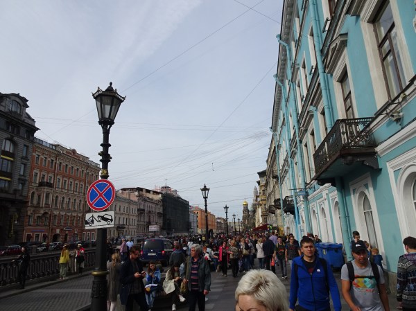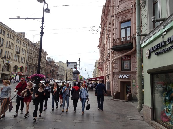 Prima zi după sosire, am făcut o scurtă tură de descoperire. Am luat metroul de la hotel și ne-am îndreptat spre Nevsky Prospekt, la 2 stații de noi. Metroul din Sankt Petersburg este unul din cele mai adânci din lume având și scop de buncăr anti-atomic. Stațiile sunt elegante dar nu sunt chiar opere de artă ca la Moscova. Din cauza adâncimii, scările rulante sunt extrem de lungi. Astfel, deși trenurile circulă foarte des și sunt confortabile, se pierde mult timp la accesul la suprafață.