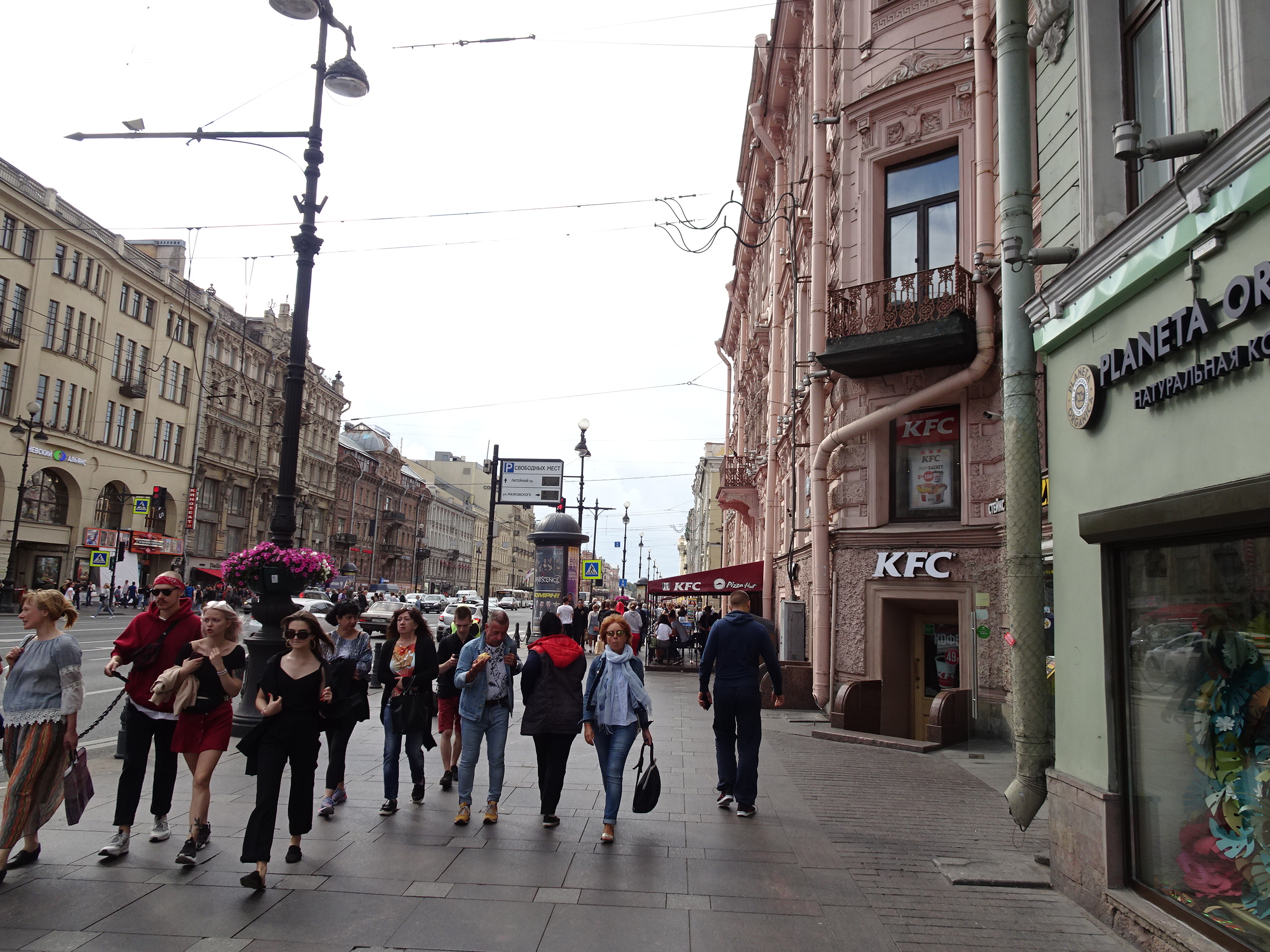 Nevsky Prospekt este artera principală care străbate centrul de la est la vest. De-a lungul bulevardului se află cele mai bune restaurante, bănci sau magazine de lux. Este totuși un bulevard circulat, cu mult trafic, astfel că pentru plimbări sunt de preferat străzile laterale de-a lungul canalelor unde traficul este închis.