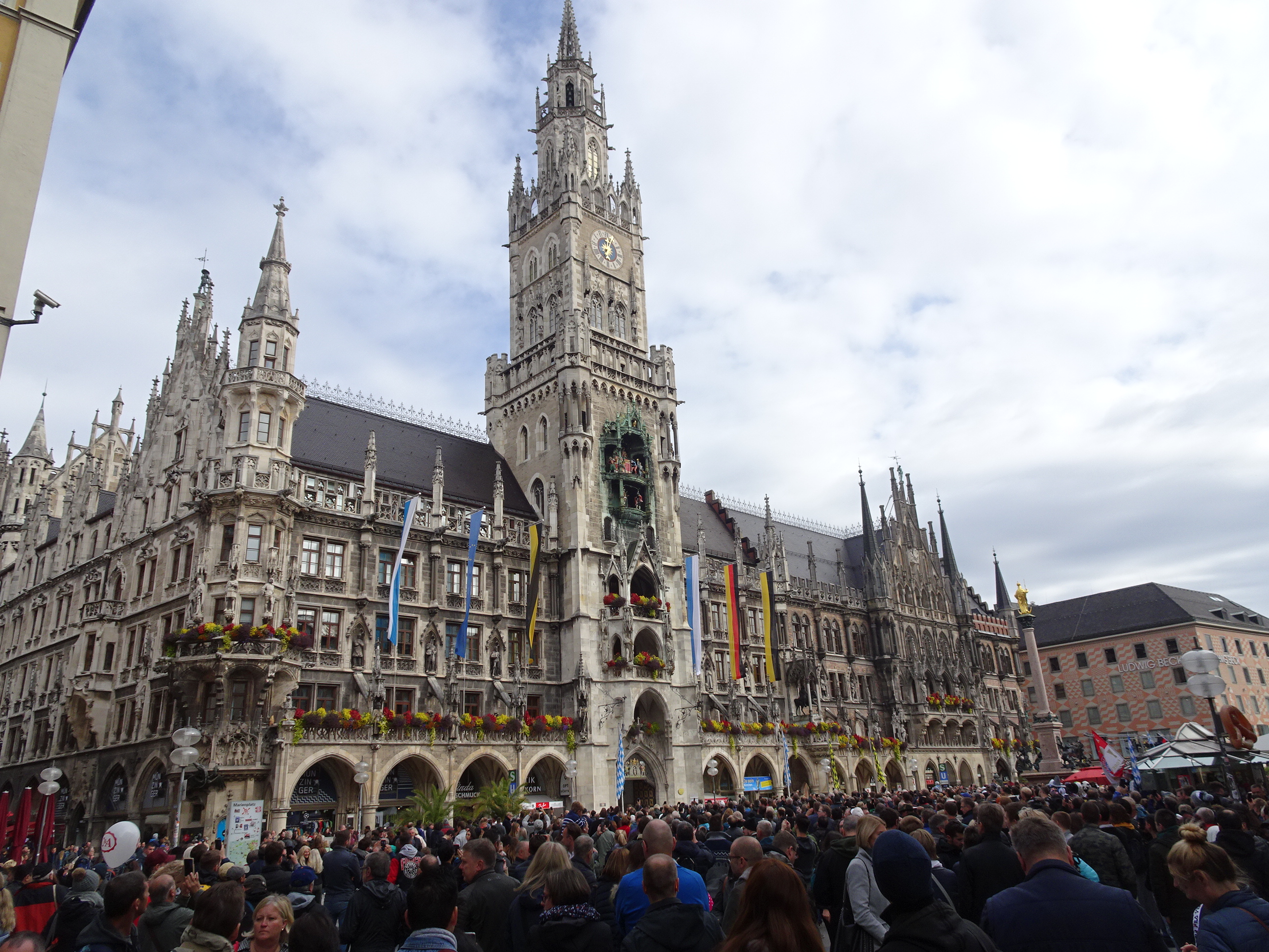 Am ajuns la Marienplatz fix la ora 12 când se declanșează „glockenspiel”, ceasul muzical din turnul primăriei. Pentru acest spectacol se strâng zilnic mii de turiști în piața centrală.