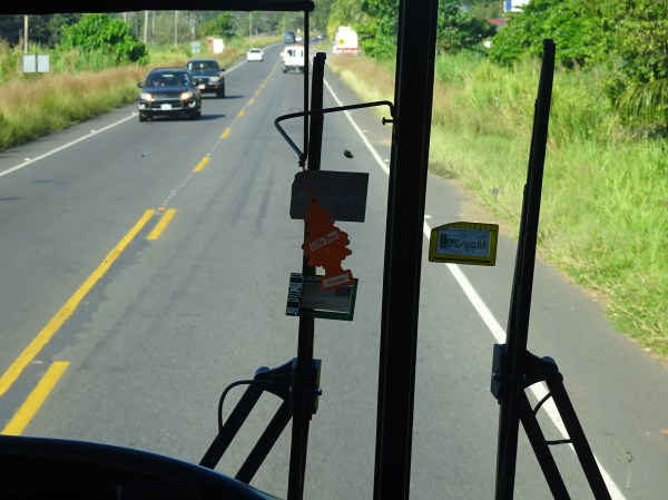 …toate opresc pe traseu la ocazie. Astfel se face că autobuzul oprea din 10 în 10 minute, fie pentru a culege oameni de la marginea drumului, fie pentru a-i lăsa și pe alții. Nu există nici conceptul de limită de locuri, astfel că la un moment dat erau vreo 30 de pasageri în picioare. Important e că aerul condiționat merge bine, altfel ar fi fost greu de suportat.