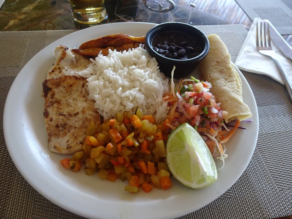 Casado este mâncarea tradițională din Costa Rica. Este vorba de un fel de carne prăjită (eu am ales pește) servit alături de orez, fasole neagră, salată, tortilla și plantan prăjit. Casado înseamnă „căsătorit” – în sensul că se combină felurile de mâncare preferate.