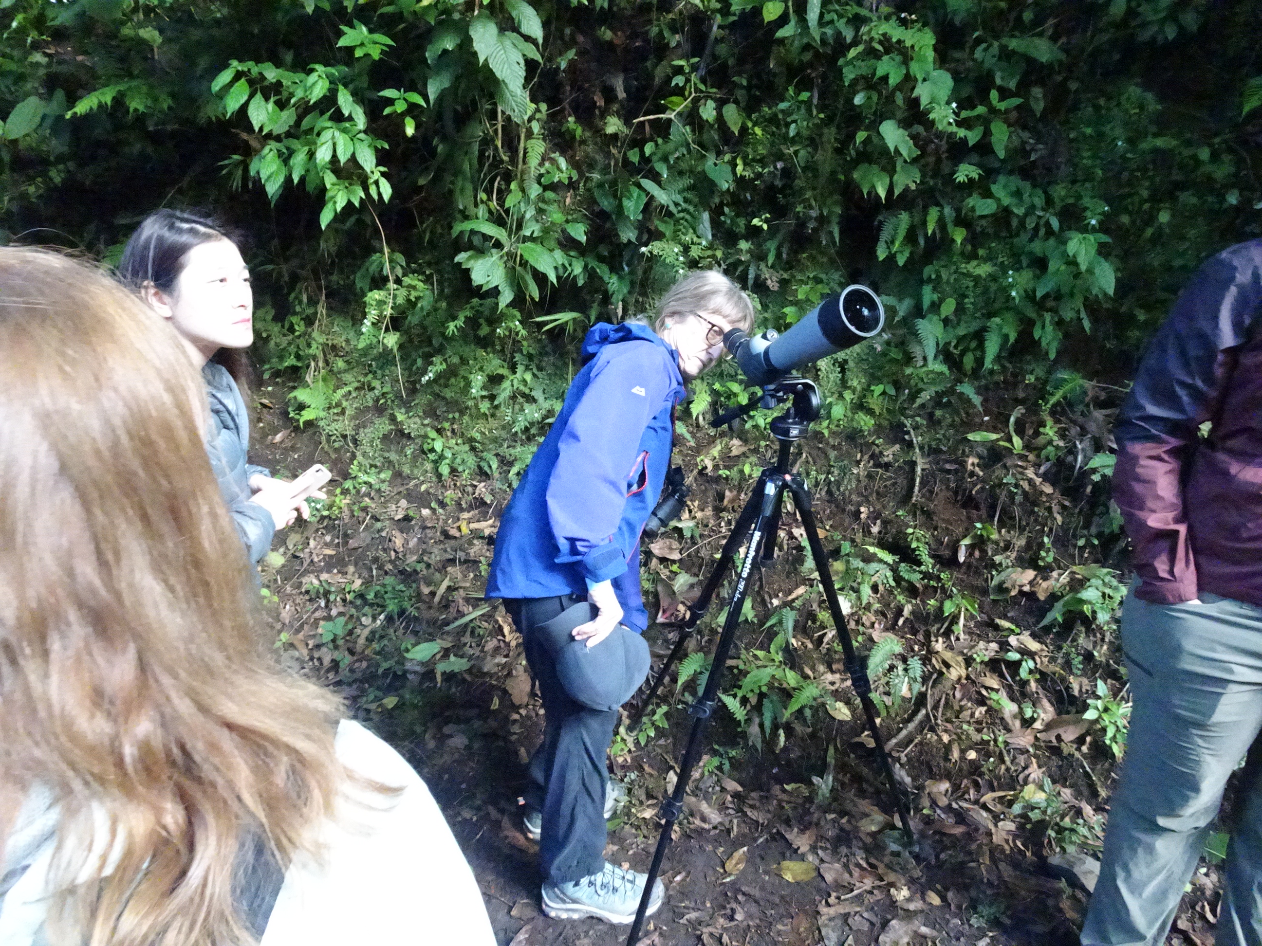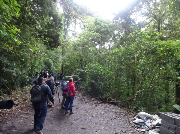 Fiecare ghid are un telescop pentru grupul său. Se uită atenți spre vârfurile copacilor iar când zăresc păsări rare le montează pentru ca turiștii să le poată vedea mai bine. Încă de la intrare am zărit câteva zeci de păsări.