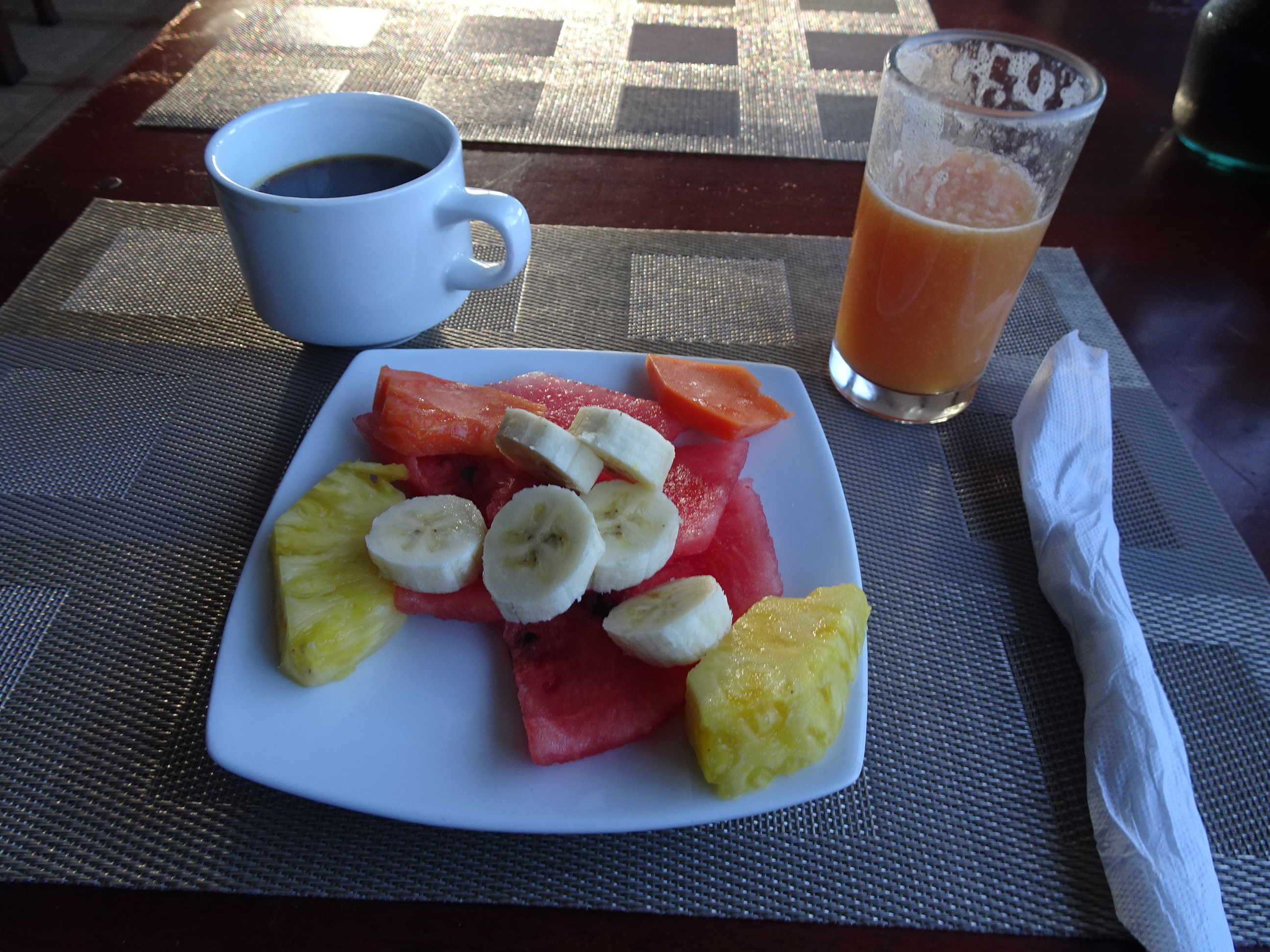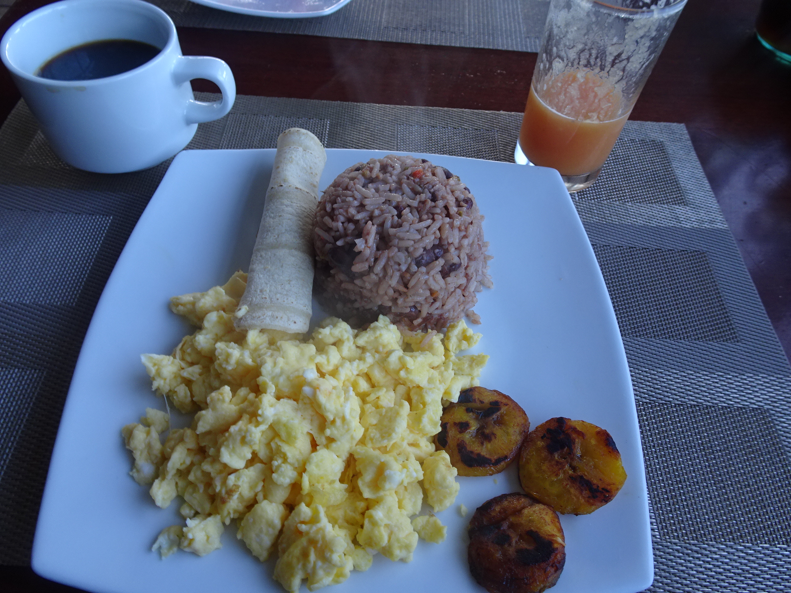 Un mic dejun îndestulător pentru o zi lungă – omletă și gallo pinto (orez tradițional cu fasole) și nelipsitul platou de fructe.