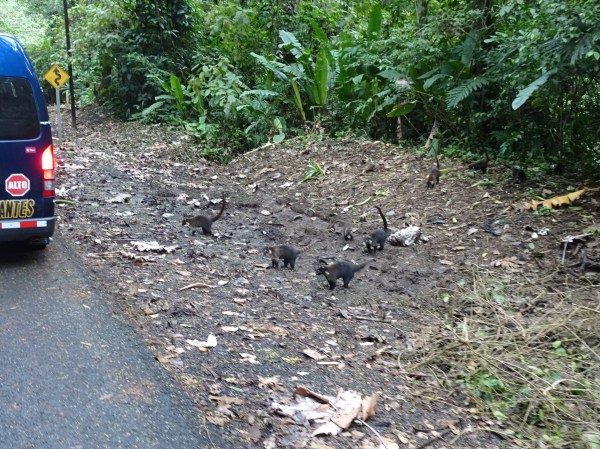 O familie de coati traversează strada