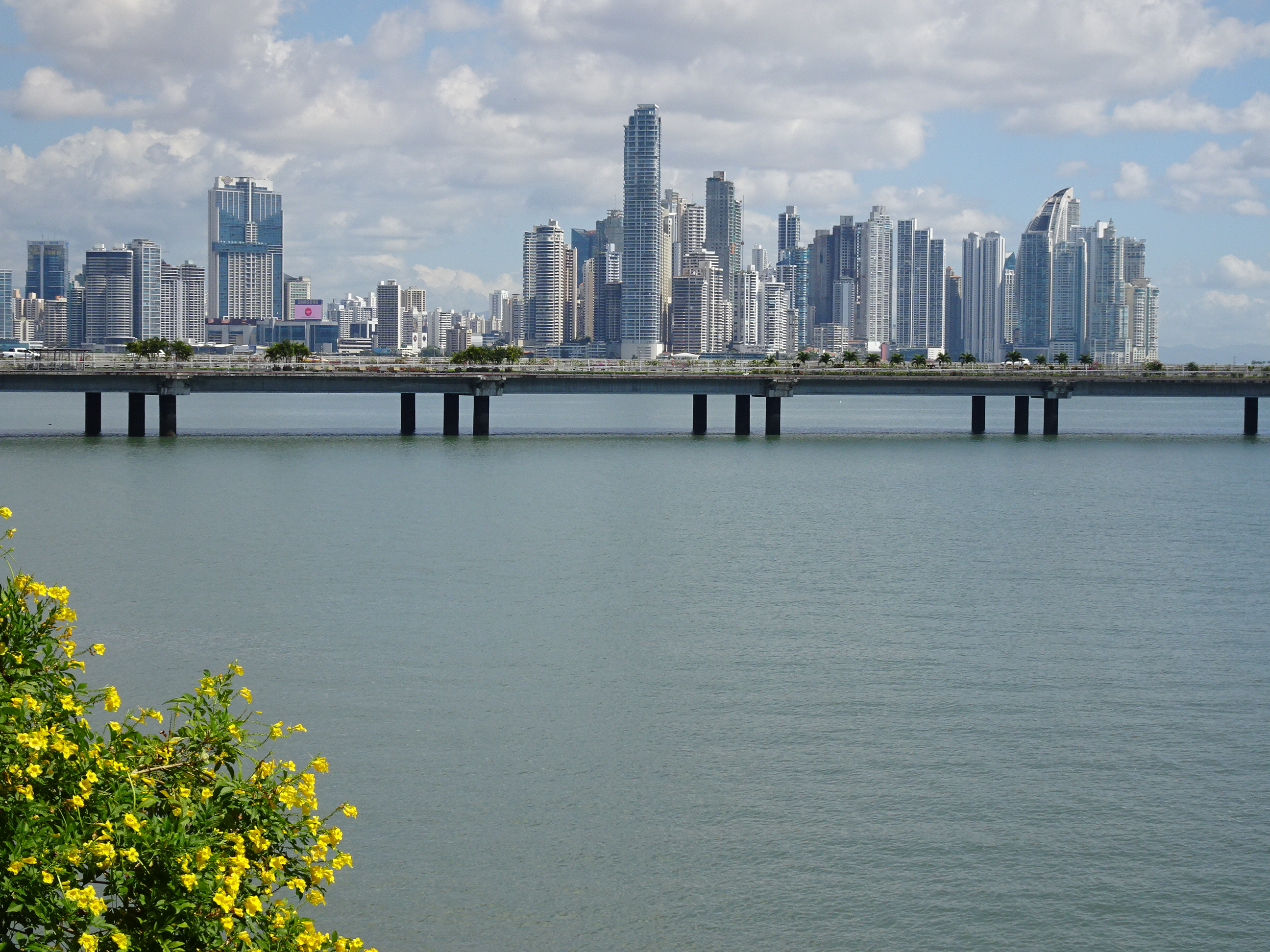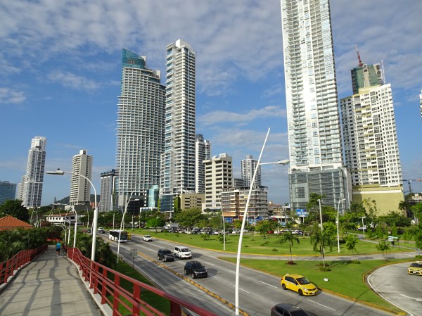Vederi din orașul vechi spre cel nou de la malul oceanului. Casco Viejo este înconjurat de o autostradă circulară construită peste apă.