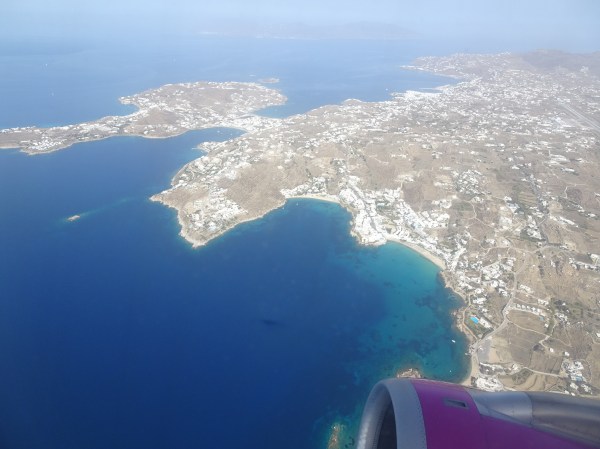 Decolarea peste Mykonos. Se vede Chora și plajele sudice. Zborul spre acasă a durat 75 de minute.
