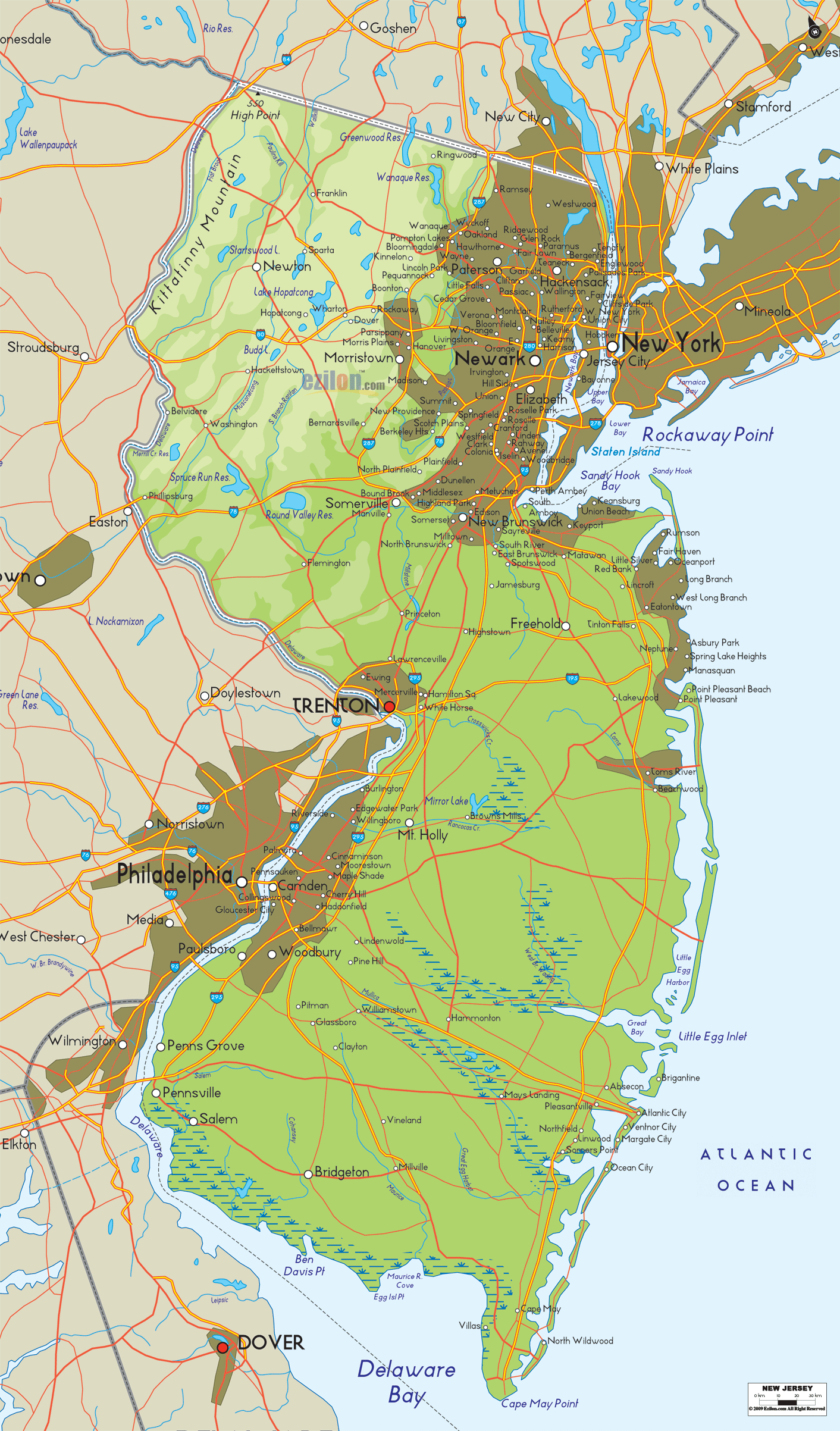 Harta New Jersey, statul dintre cele 2 mari orașe